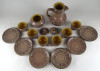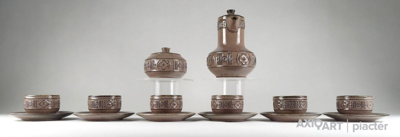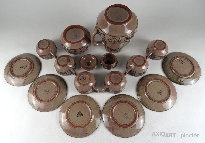[1S405/X220] Régi hat személyes hibátlan állapotú komplett Városlődi majolika kávéskészlet, mokkáskészlet. A készlet darabjai: - 1 darab teáskanna, kancsó, kiöntő (18 x 13 x 15 cm) - 1 darab cukor kínáló, bonbonier (8 x 11 cm) - 6 darab kávéscsésze, mokkás csésze (5 x 7 x 9 cm) - 6 darab alátét tányér, kistányér (13 cm) Alján jelzés: VÁROSLŐDI MAJOLIKA HUNGARY Súly: 2.465 kg