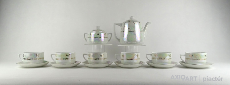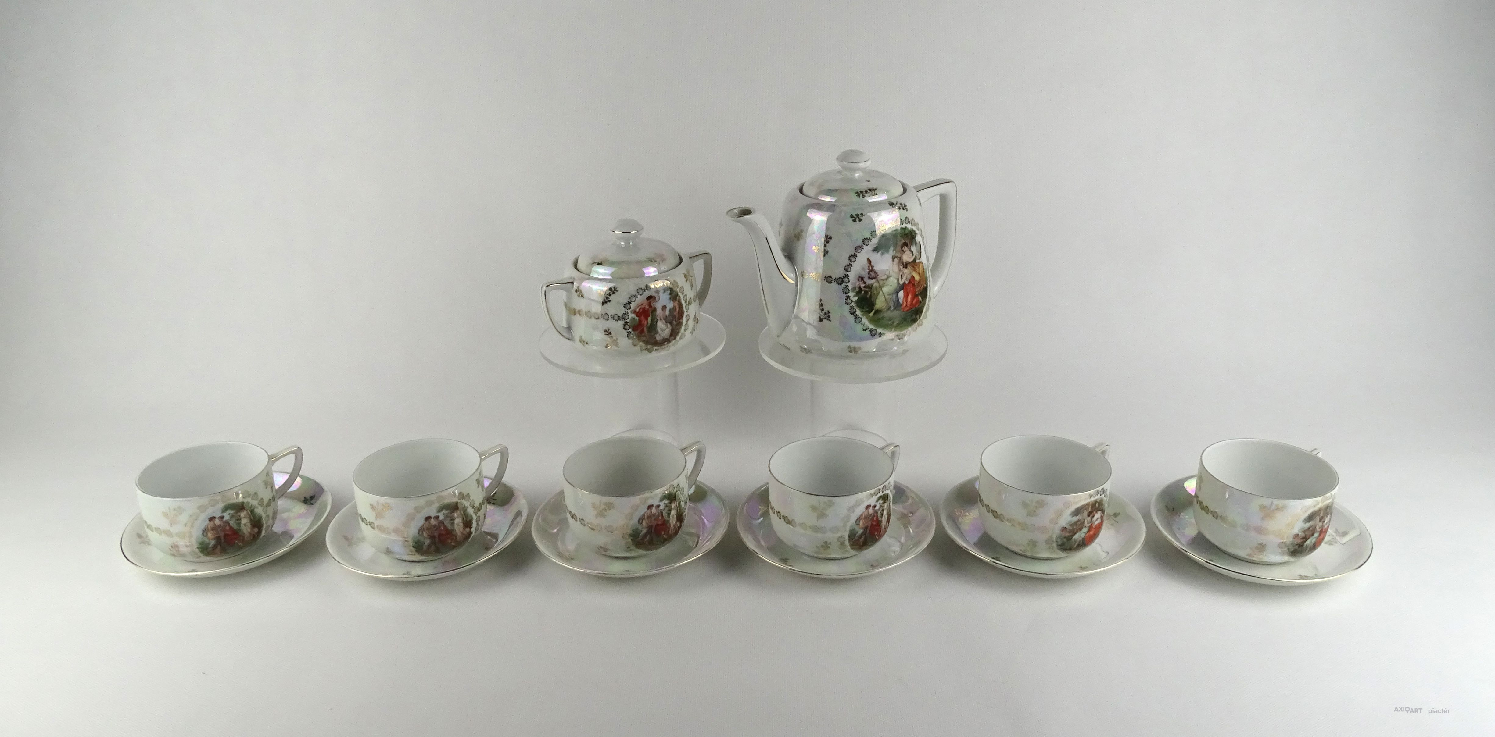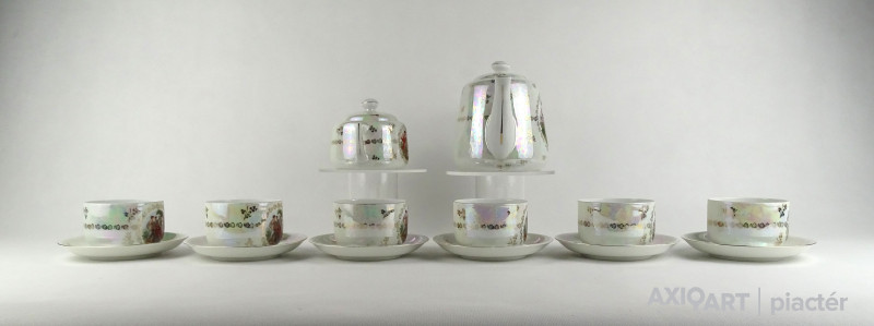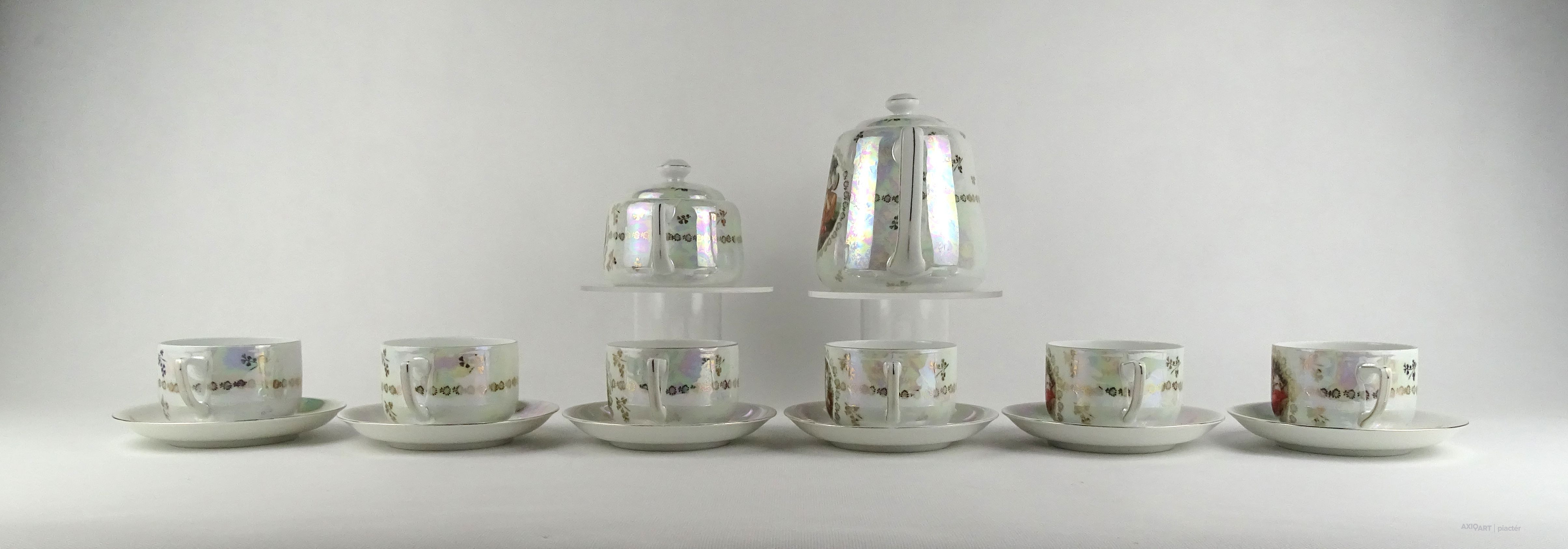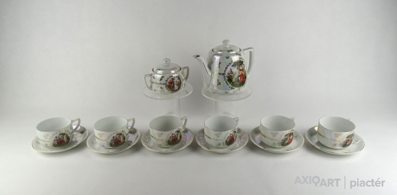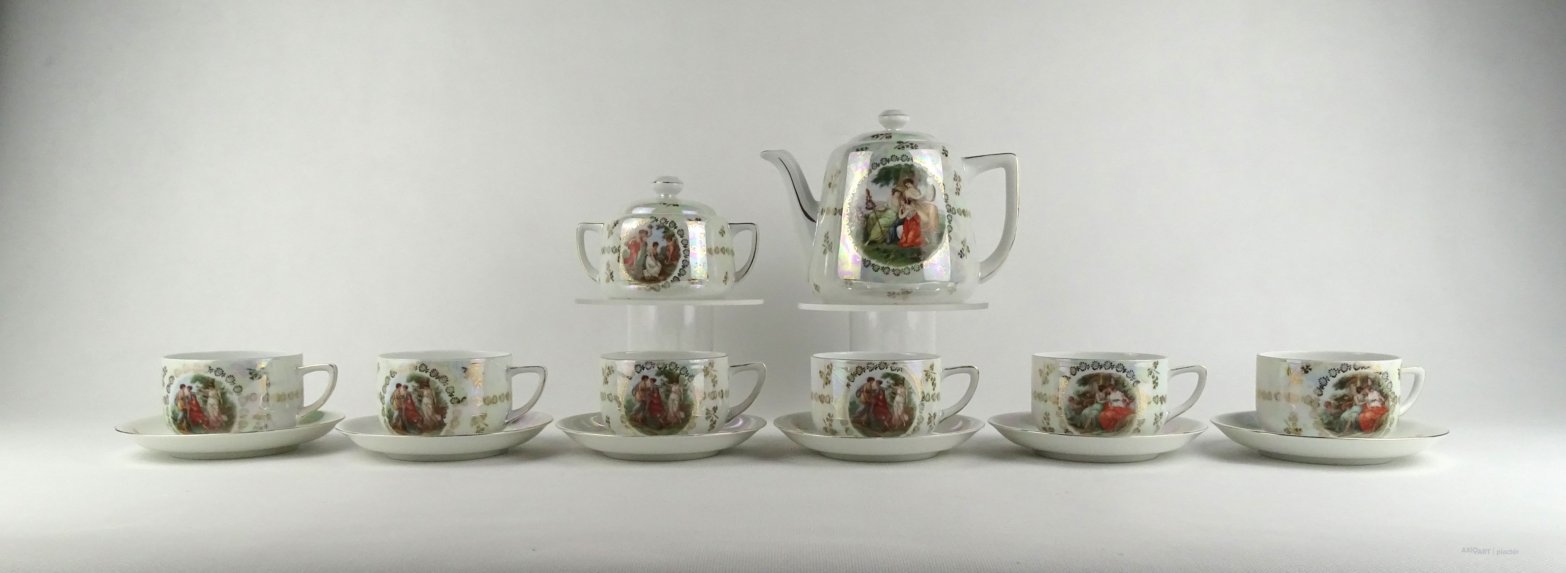 Hibátlan állapotú Victoria porcelán teáskészlet. Felülete irizáló, gazdagon aranyozott, allegorikus jelenetekkel díszített.