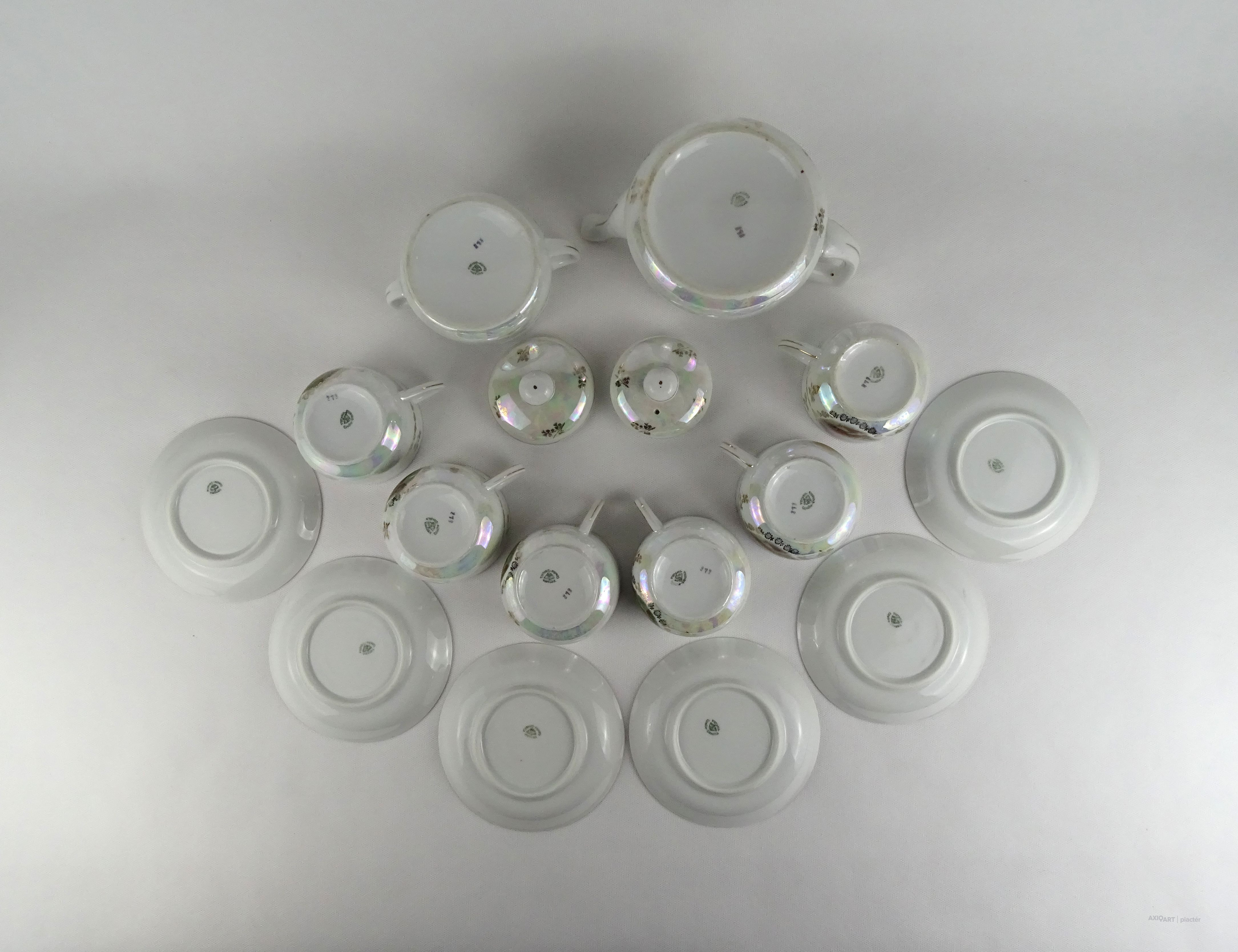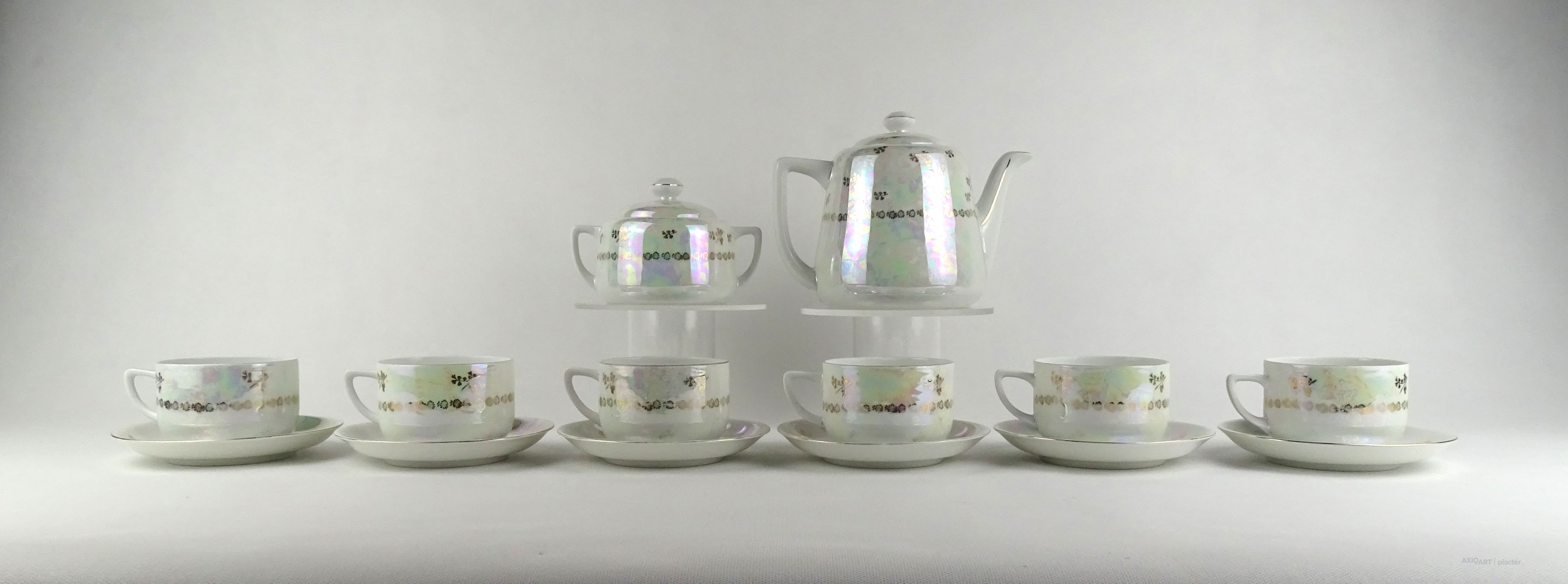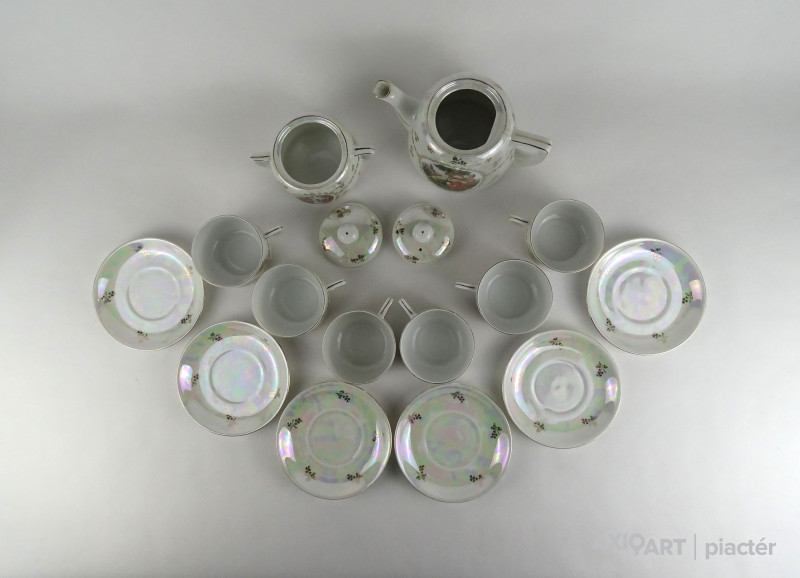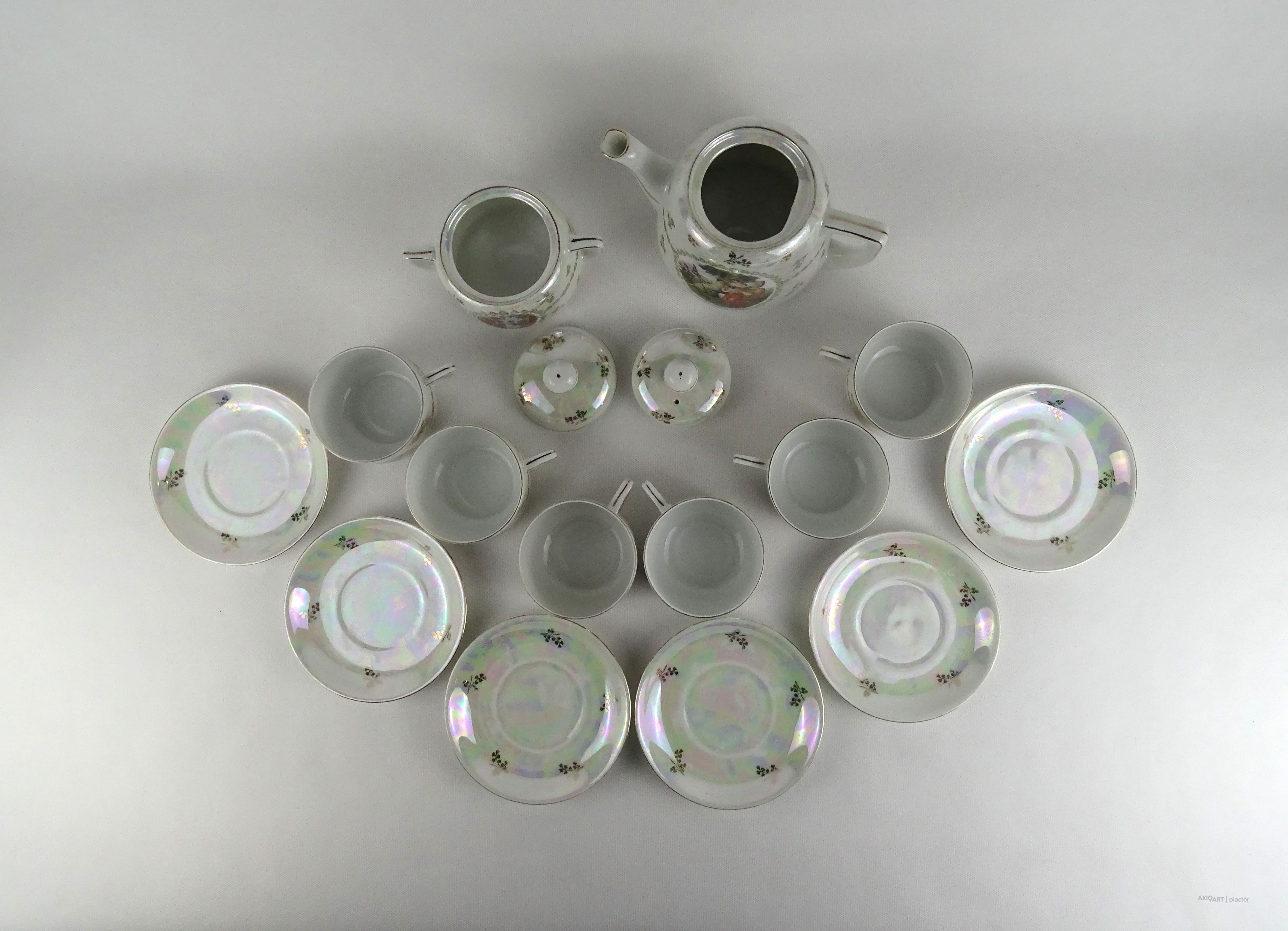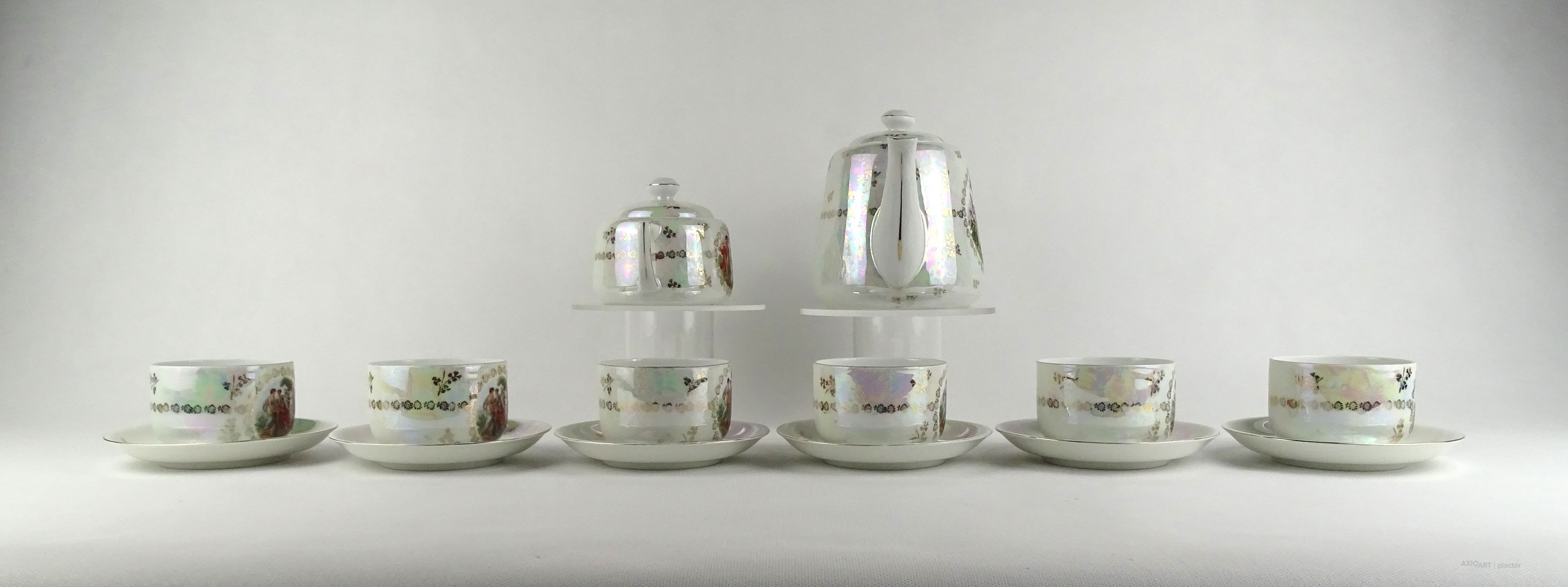 Hibátlan állapotú Victoria porcelán teáskészlet. Felülete irizáló, gazdagon aranyozott, allegorikus jelenetekkel díszített.