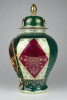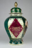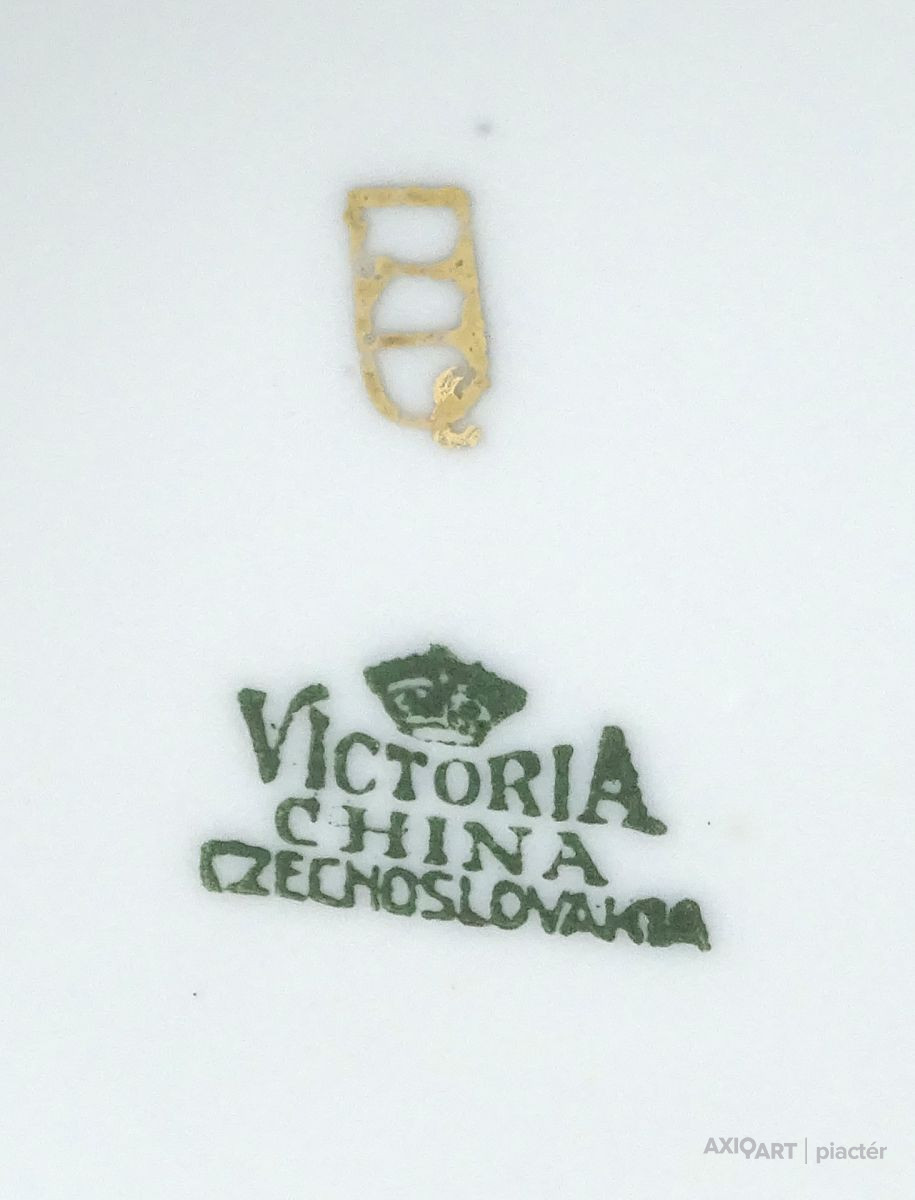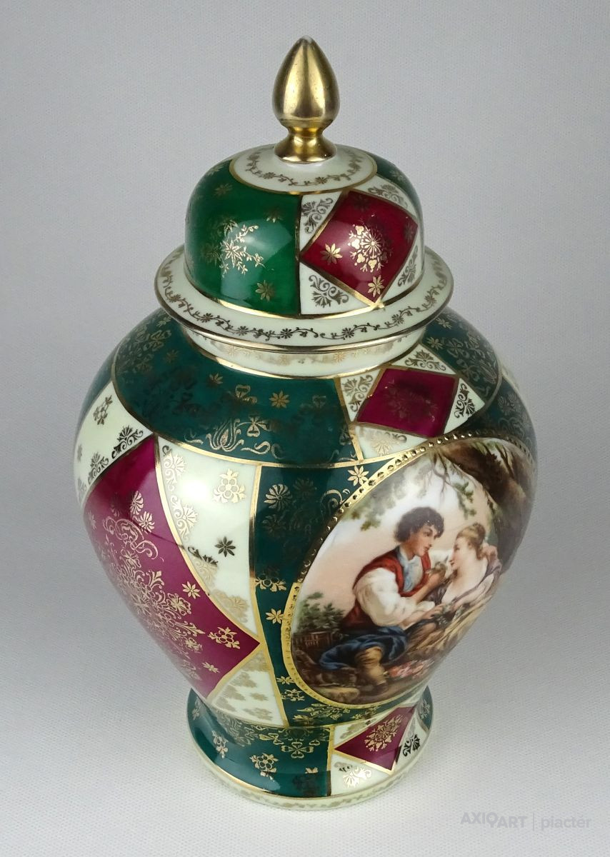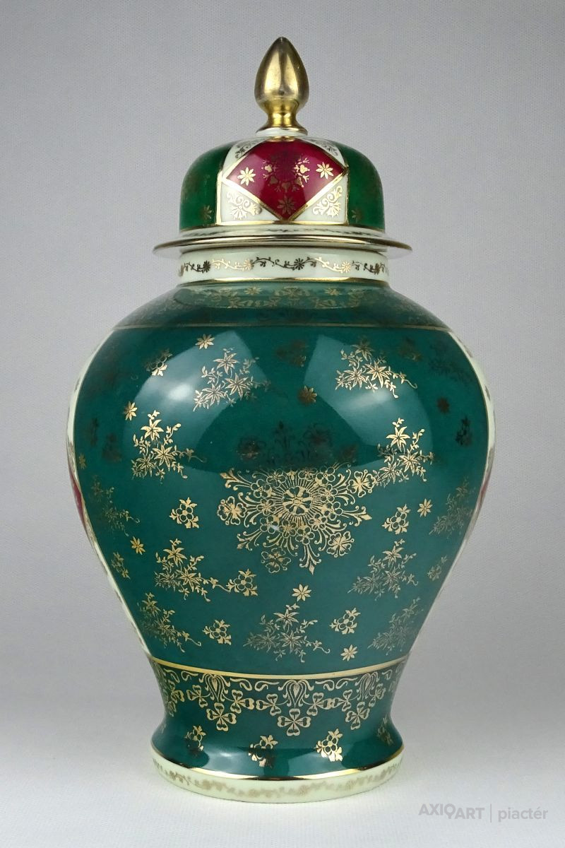 [1M502/UZ-K] Szép állapotú fedeles cseh Victoria porcelán váza, urnaváza. Oldalán egy kisebb karc található, lásd fotó. Gazdagon díszített, aranyozott váza. Alján zöld koronás márkajelzés: VICTORIA CHINA CZECHOSLOVAKIA Magasság: 27 cm Szélesség: 15 cm Súly: 0.685 kg
