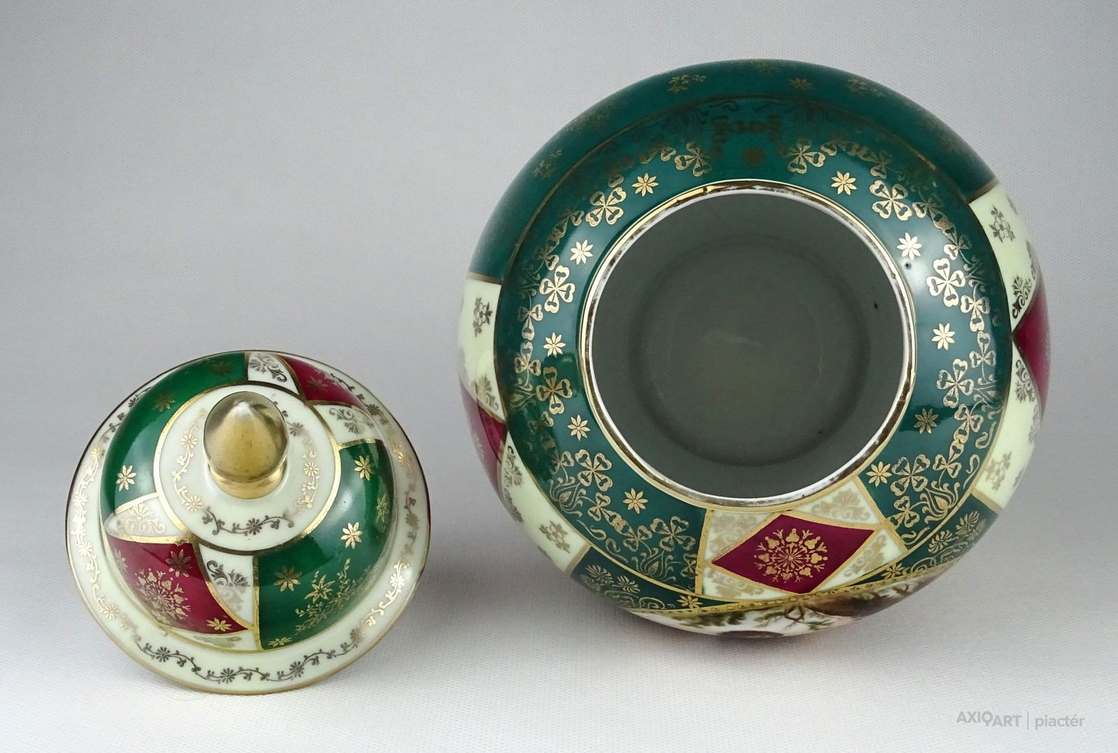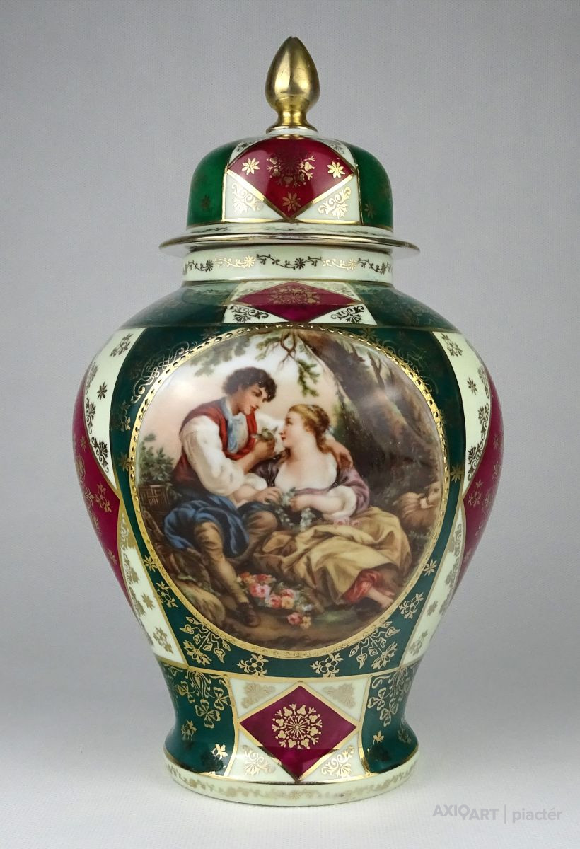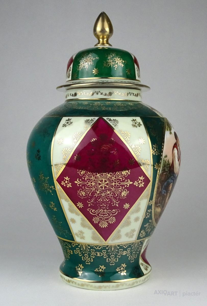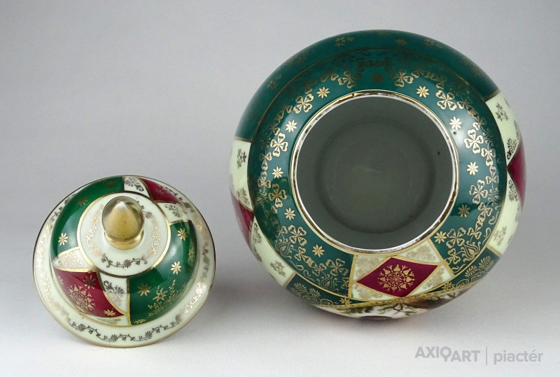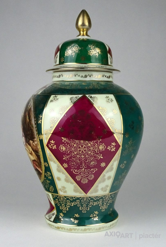Szép állapotú fedeles cseh Victoria porcelán váza, urnaváza. Oldalán egy kisebb karc található, lásd fotó. Gazdagon díszített, aranyozott váza.