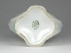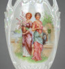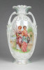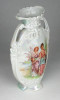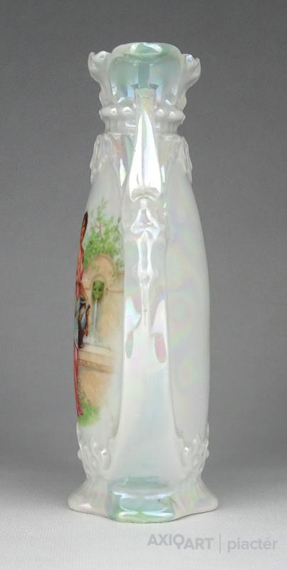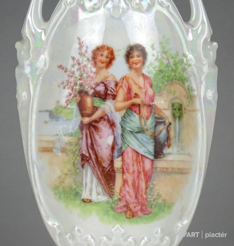 Régi szép állapotú, jelzett, irizáló felületű porcelán váza, díszváza két füllel. Oldalán színes kétalakos vízhordó nő díszítés.