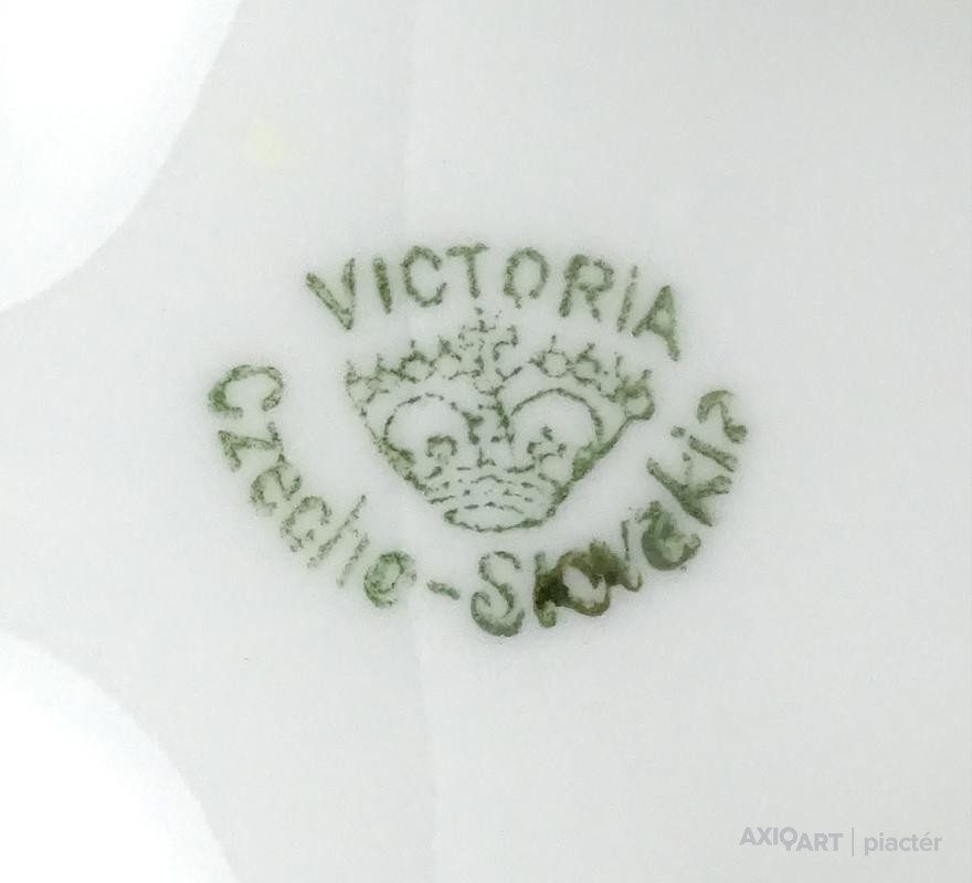 [1H445/X207] Régi szép állapotú, jelzett, irizáló felületű porcelán váza, díszváza két füllel. Oldalán színes kétalakos vízhordó nő díszítés. Alján zöld koronás márkajelzés: VICTORIA CZECHO-SLOVAKIA Magasság: 17 cm Szélesség: 9.5 cm Súly: 0.16 kg