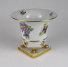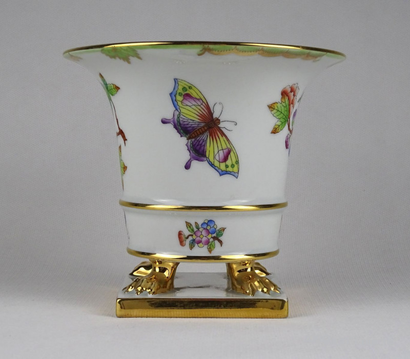 [1T432/Z023] Hibátlan állapotú, oroszlán karmos, Viktória mintás Herendi virágkaspó, díszkaspó. Alján kék Herendi jelzés: HEREND HUNGARY Mélynyomással: HEREND Formaszám: 6402 Magasság: 13 cm Szélesség: 14.7 cm Súly: 0.61 kg