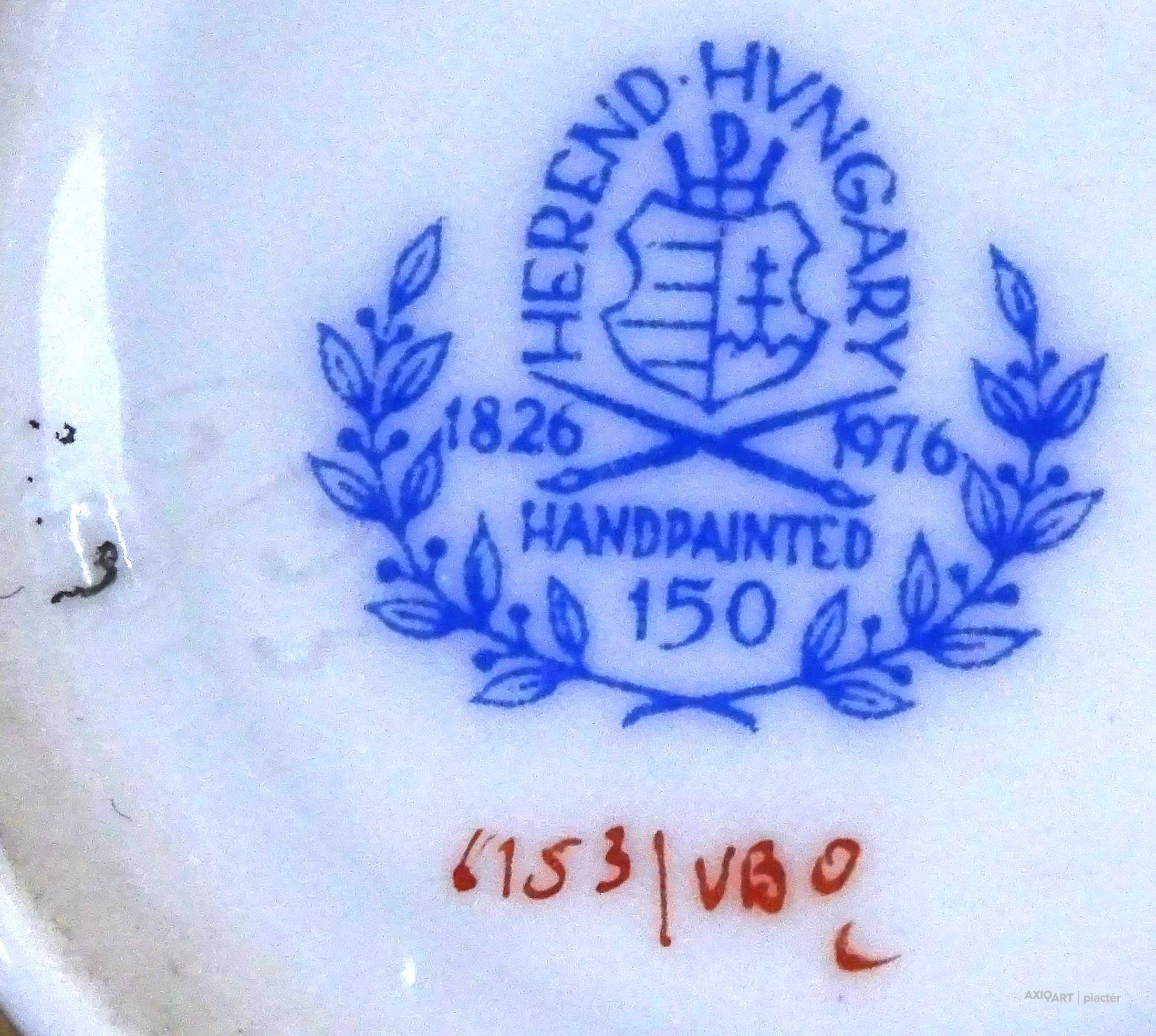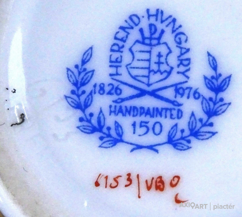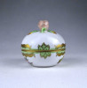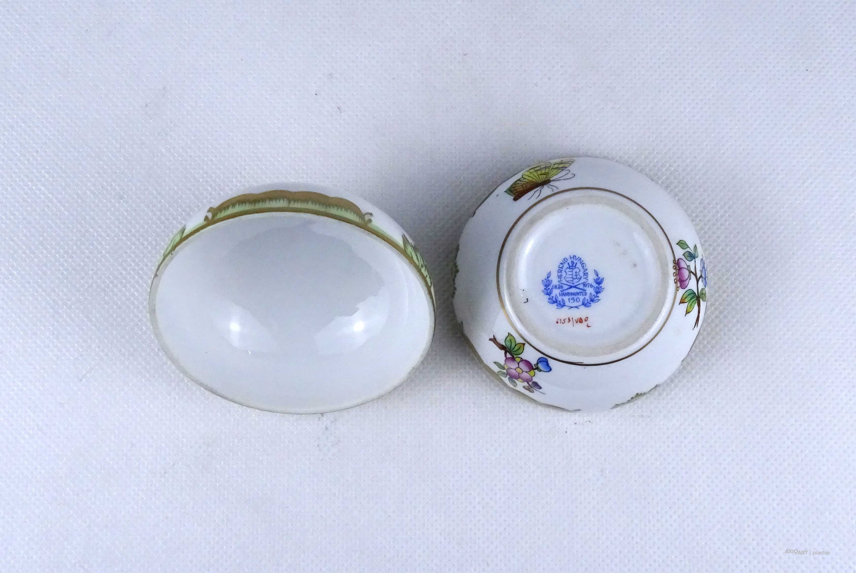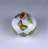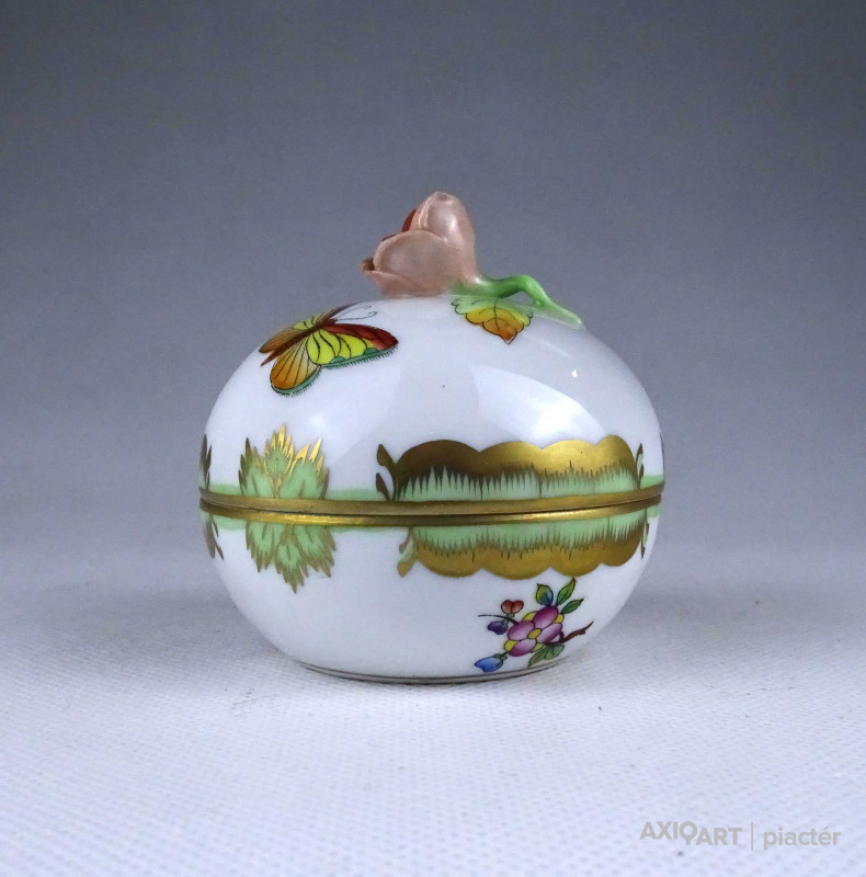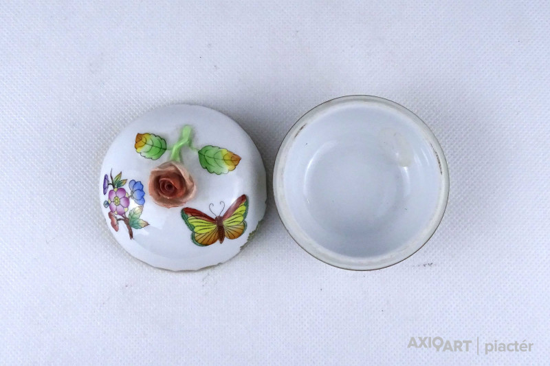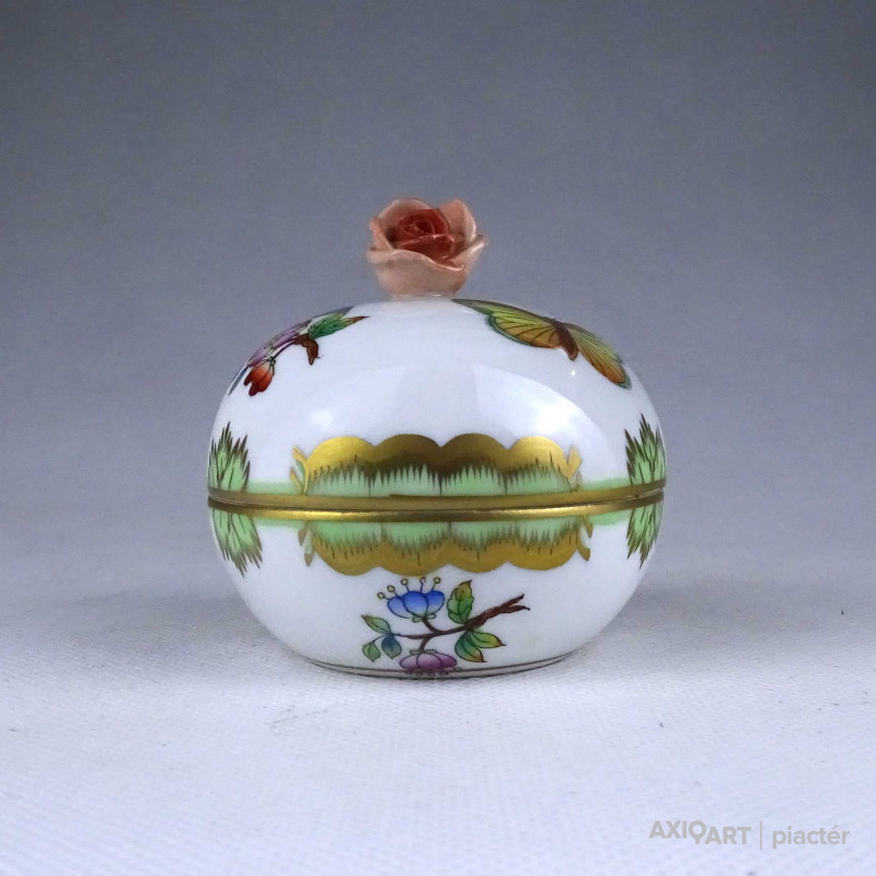 [1Z686/Z008] Régi, hibátlan állapotú, Viktória mintás Herendi porcelán ékszertartó bonbonier, fedelén plasztikus rózsa fogantyúval. Alján kék jubileumi Herendi márkajelzés: HEREND HUNGARY 1826 1976 HANDPAINTED 150 Mélynyomással: HEREND Formaszám pirossal: 6153 / VBO Magasság: 7.4 cm Szélesség: 7.4 cm Súly: 0.13 kg