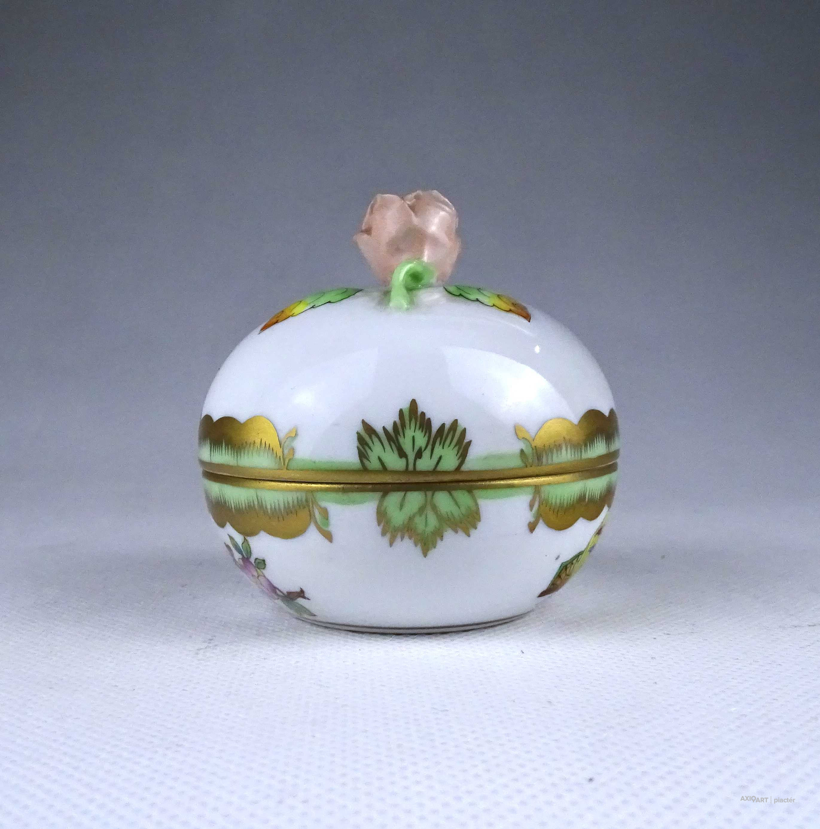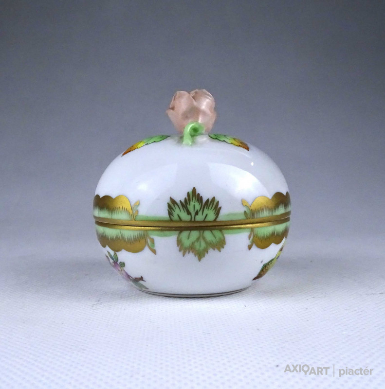Régi, hibátlan állapotú, Viktória mintás Herendi porcelán ékszertartó bonbonier, fedelén plasztikus rózsa fogantyúval.