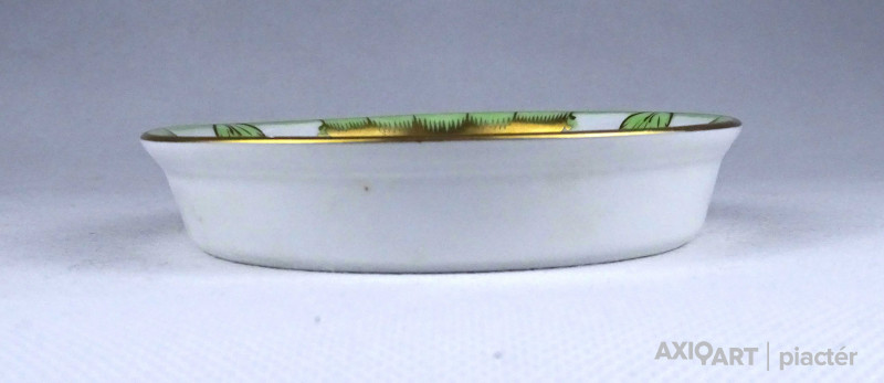 [1R639/Z034] Hibátlan állapotú, ovális alakú, csipkebogyó mintás Herendi porcelán hamutál. Alján kék ecsetes Herendi jelzés: HEREND Mélynyomással: HEREND Szélesség: 7.4 cm Hosszúság: 11.3 cm Súly: 0.055 kg