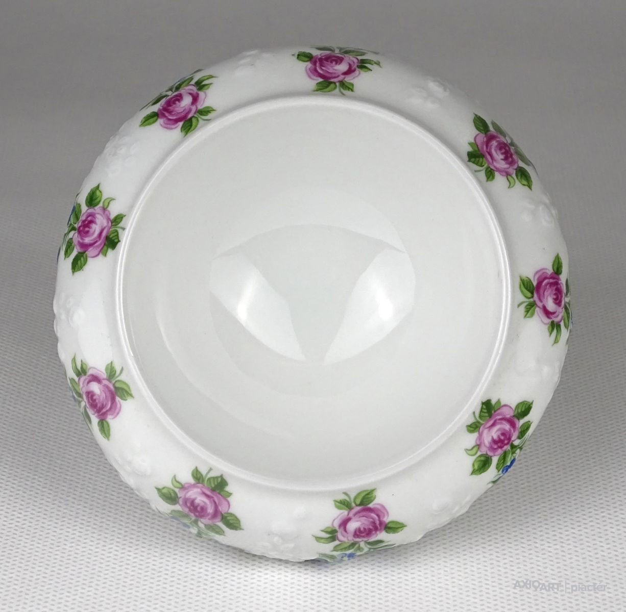 [1O427/X011] Régi, hibátlan állapotú nyitott rózsadíszes porcelán ékszertartó, gyűrűtartó. Alján zöld koronás Wallendorf porcelán márkajelzés: W 1764 Magasság: 5 cm Szélesség: 10 cm Súly: 0.21 kg