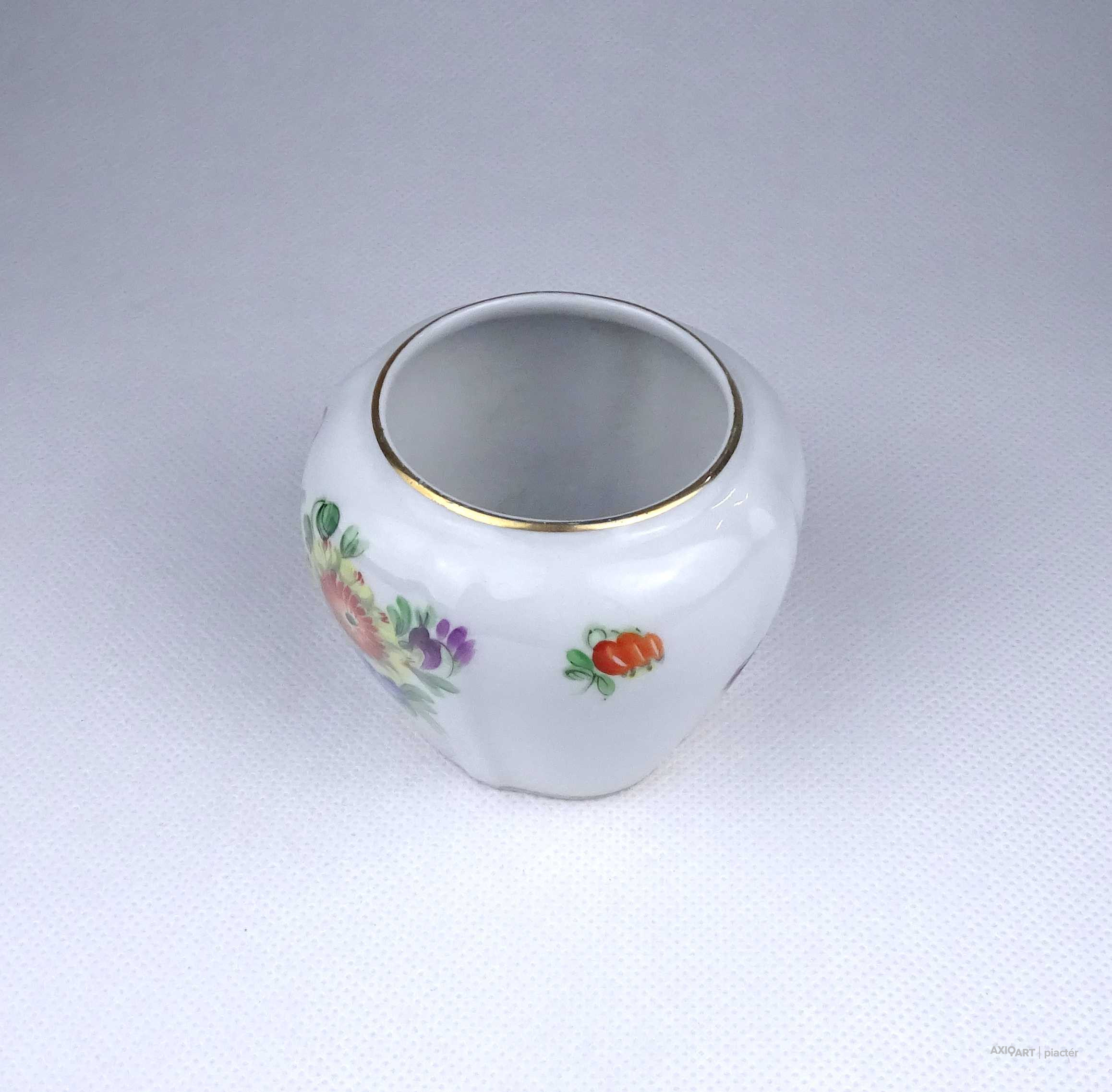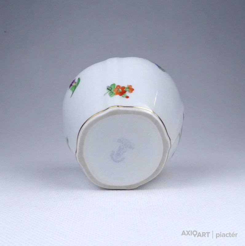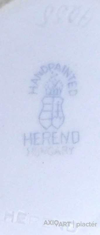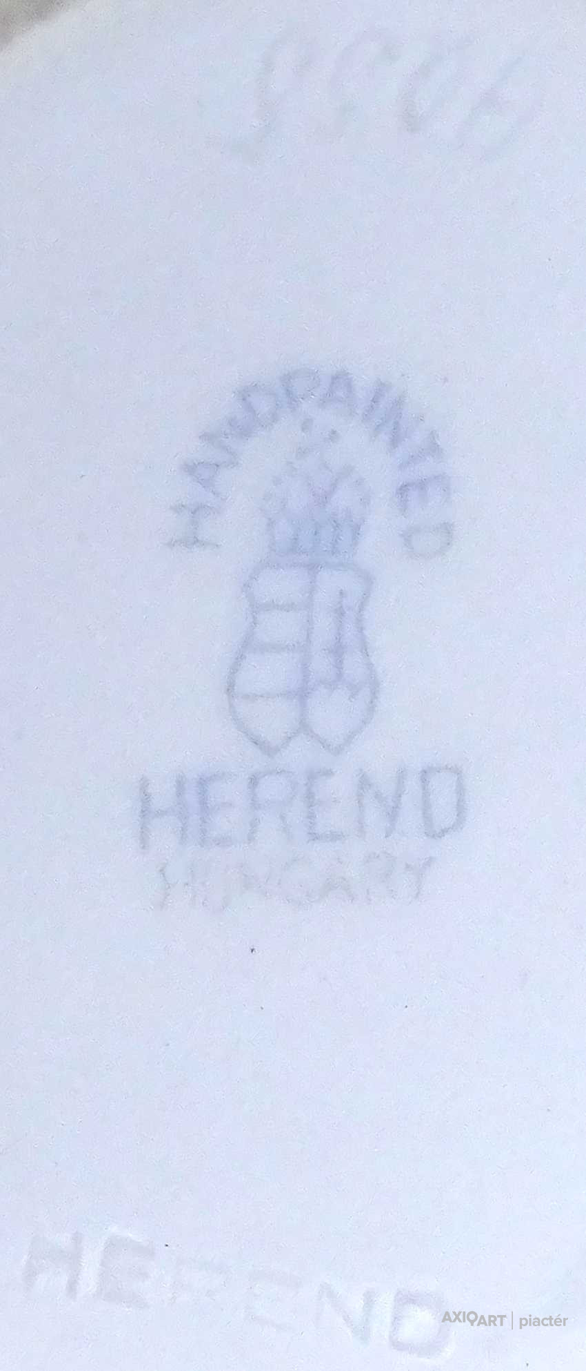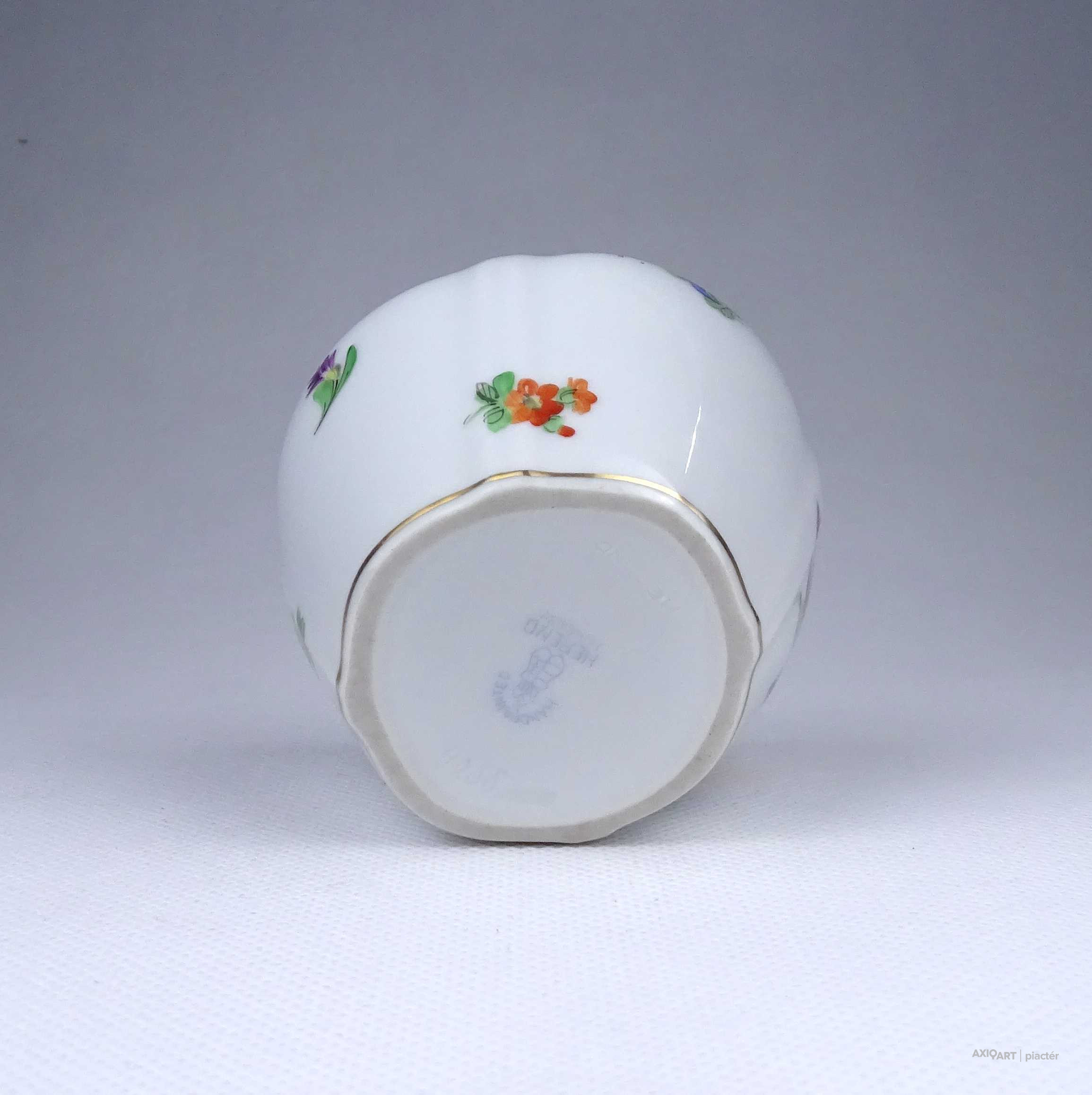 [1Z999/Z016] Régi, hibátlan állapotú, virágmintás Herendi porcelán öblös kisváza vagy kis kaspó. Alján kék Herendi márkajelzés: HENDPAINTED HEREND HUNGARY Mélynyomással: HEREND Karcolt formaszám: 7255 Magasság: 6.4 cm Szélesség: 8.1 cm Súly: 0.125 kg   Magassága 14,5 cm, átmérője 16,5 cm, füllel együtt 20 cm.