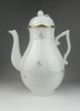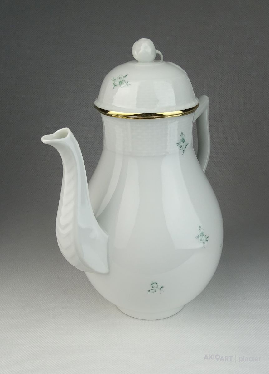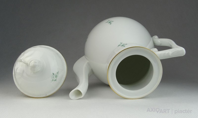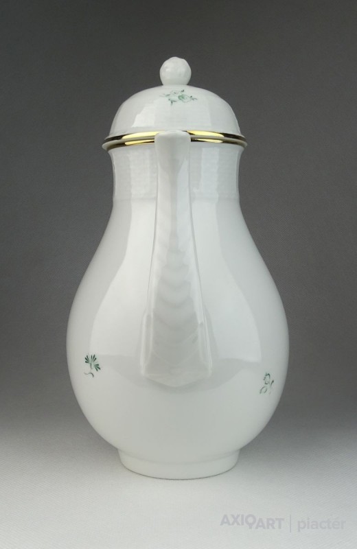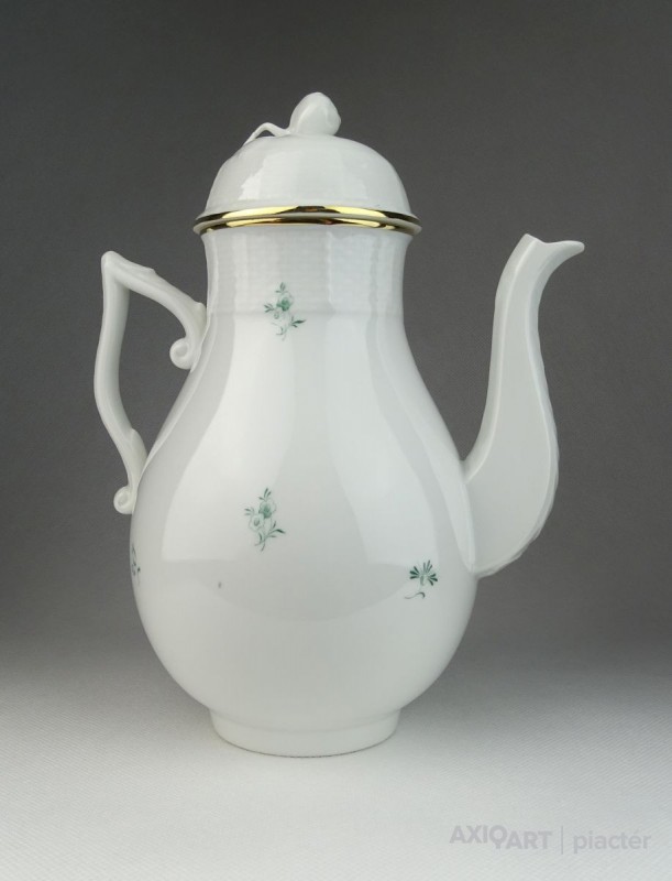 Régi, szép állapotú, jelzett, kézi festésű, arany szegélyes, zöld apró diszkrét virágmintás Herendi porcelán teáskanna, tetején plasztikus virág díszítéssel.