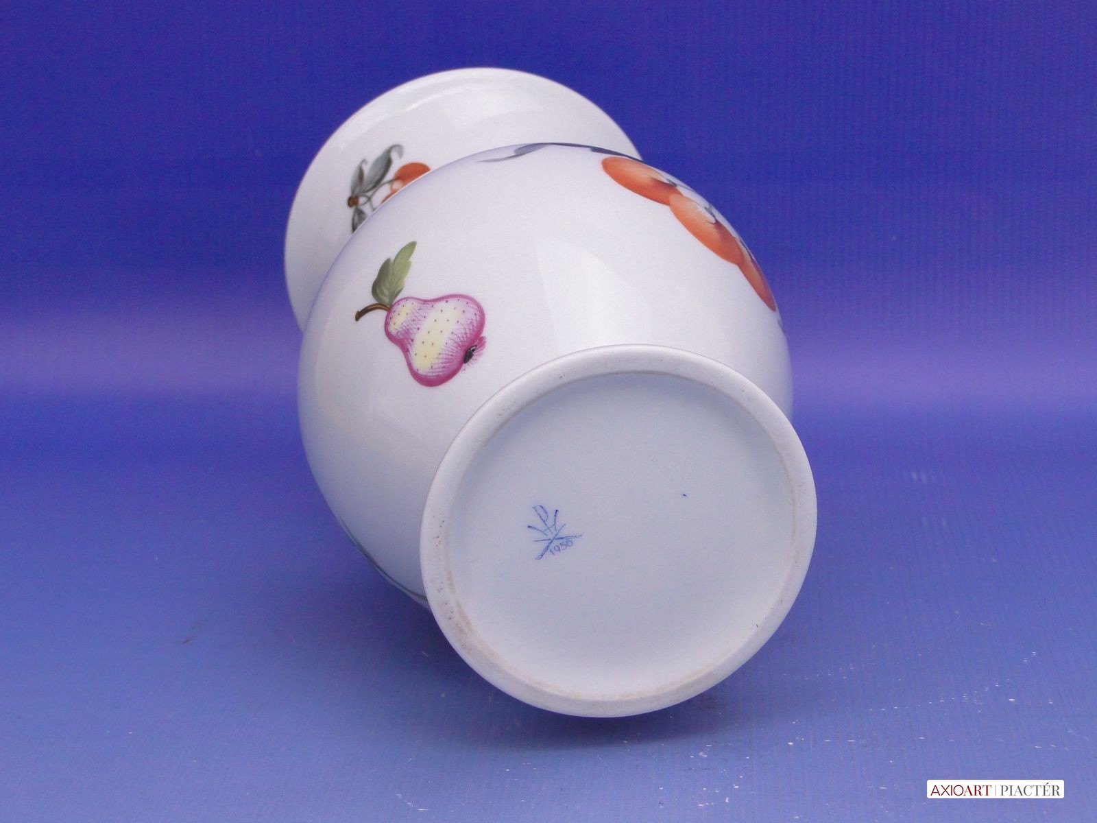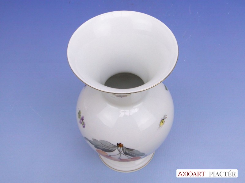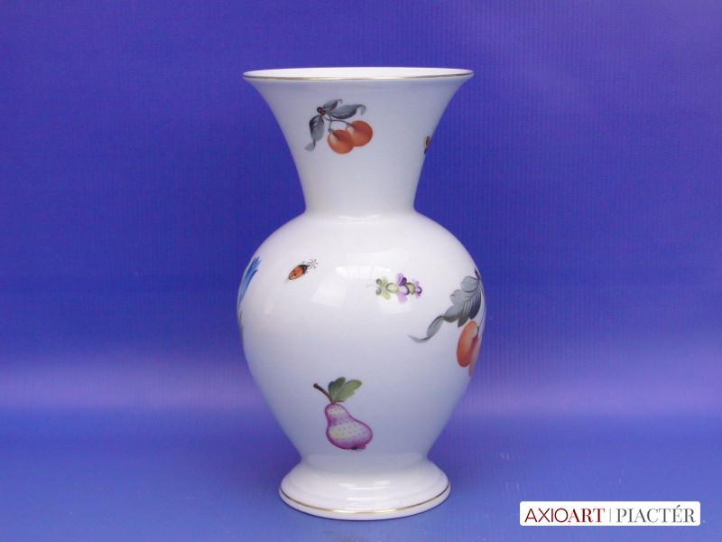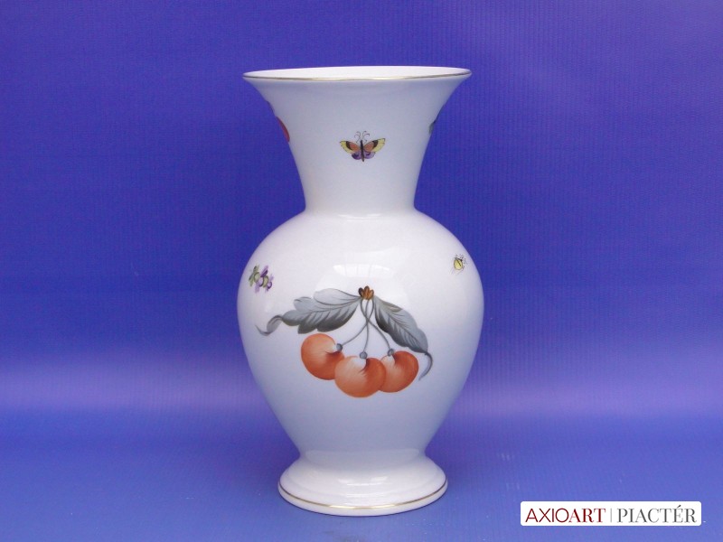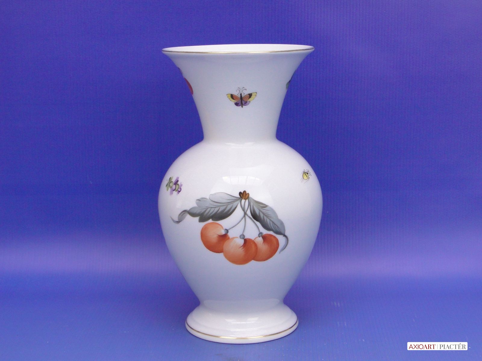 [0C950/VTR-12] Hibátlan állapotú, herendi porcelán váza. A váza testén kézi festésű virág, csipkebogyó, cseresznye, körte, lepke és rovar díszítések láthatóak. Ritkán fordul elő a herendinél ez a dekor. Alján kék herendi jelzés: HP, 1956 Mélynyomással: HEREND felirat Formaszám: 7023 Magasság: 20.5 cm Súly: 0.51 kg