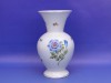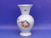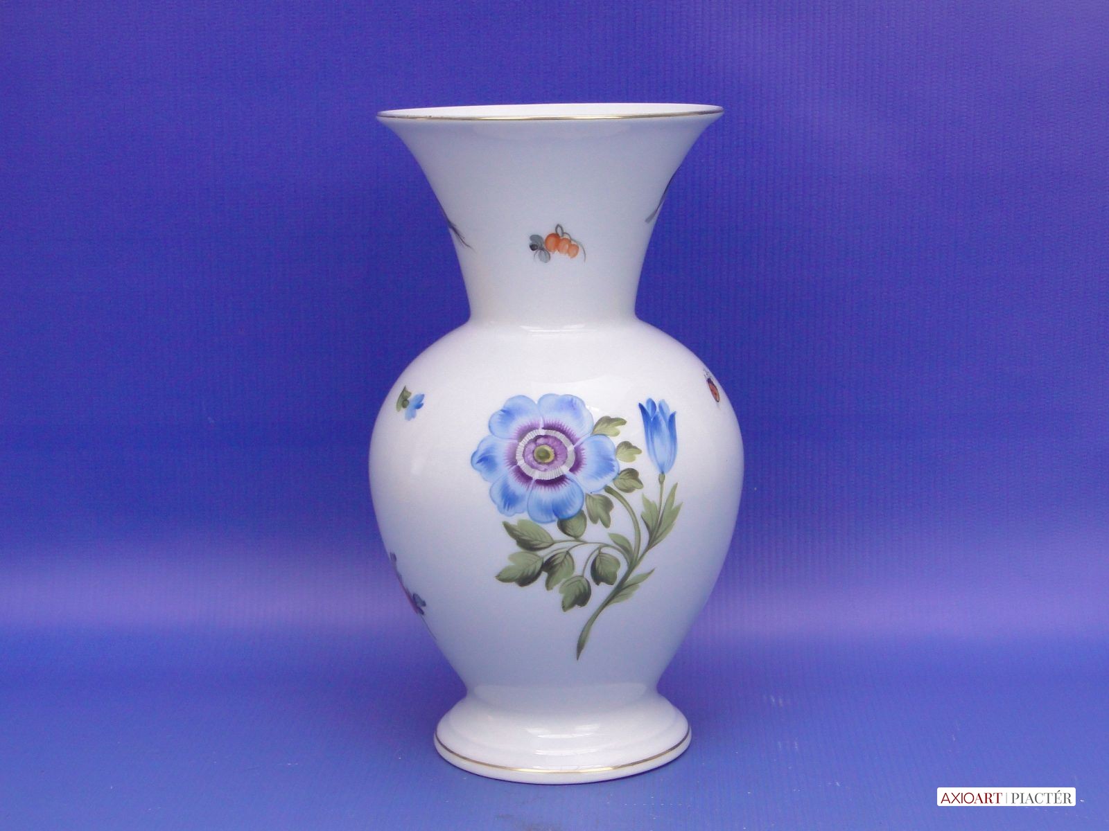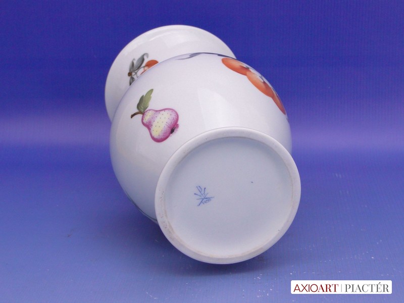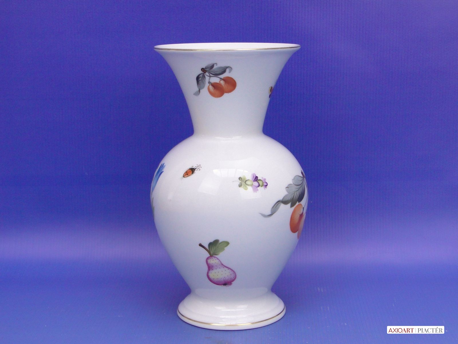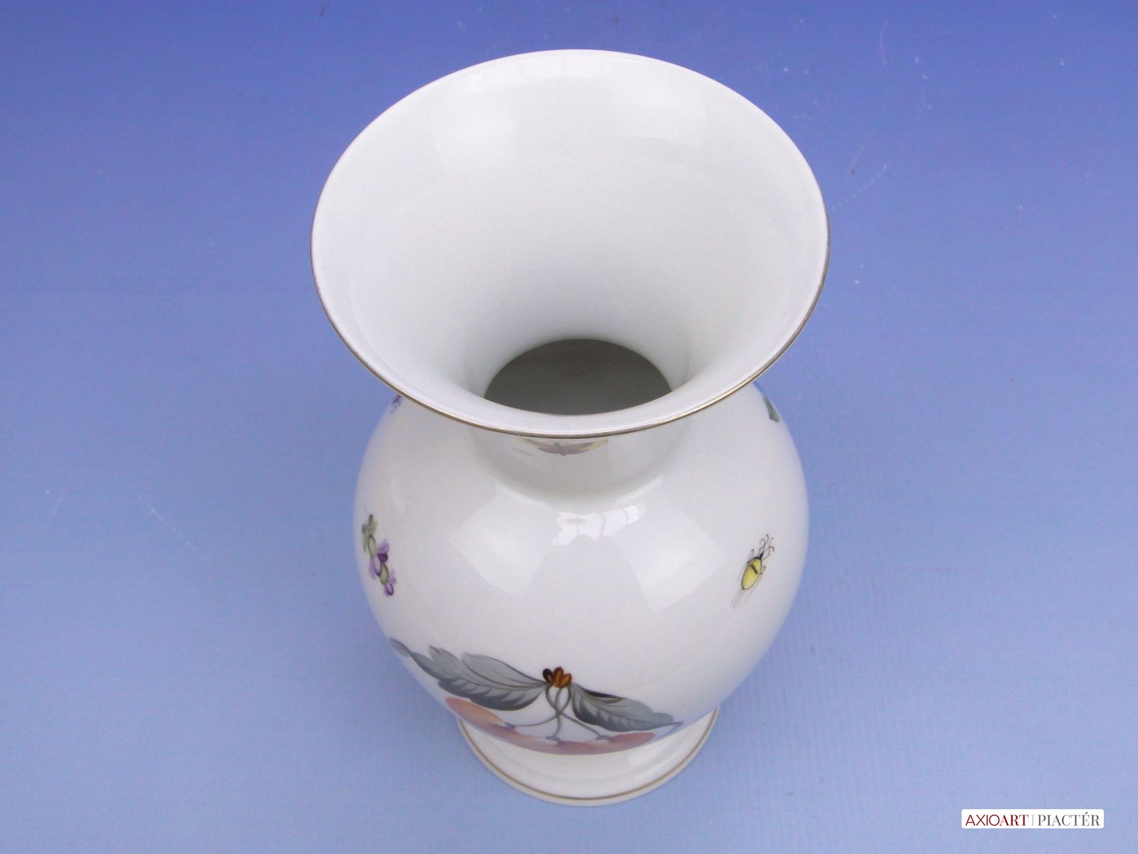 [0C950/VTR-12] Hibátlan állapotú, herendi porcelán váza. A váza testén kézi festésű virág, csipkebogyó, cseresznye, körte, lepke és rovar díszítések láthatóak. Ritkán fordul elő a herendinél ez a dekor. Alján kék herendi jelzés: HP, 1956 Mélynyomással: HEREND felirat Formaszám: 7023 Magasság: 20.5 cm Súly: 0.51 kg