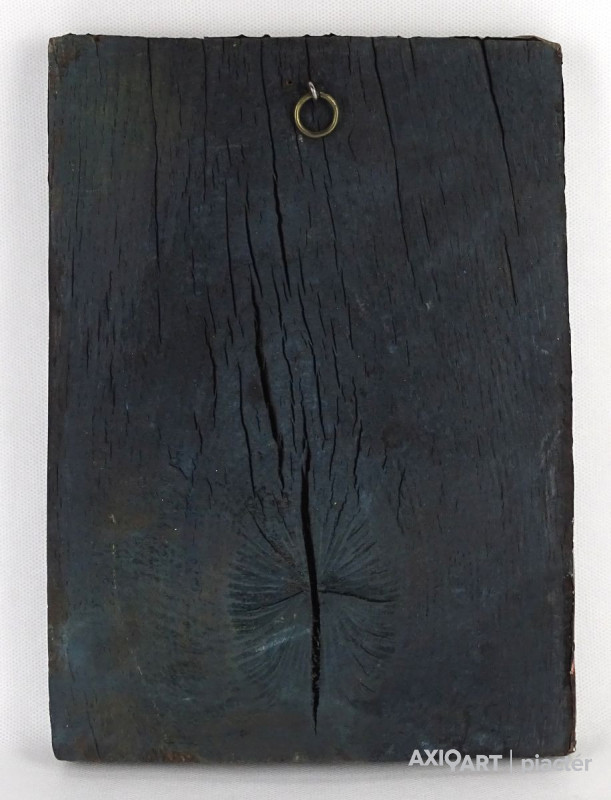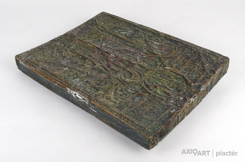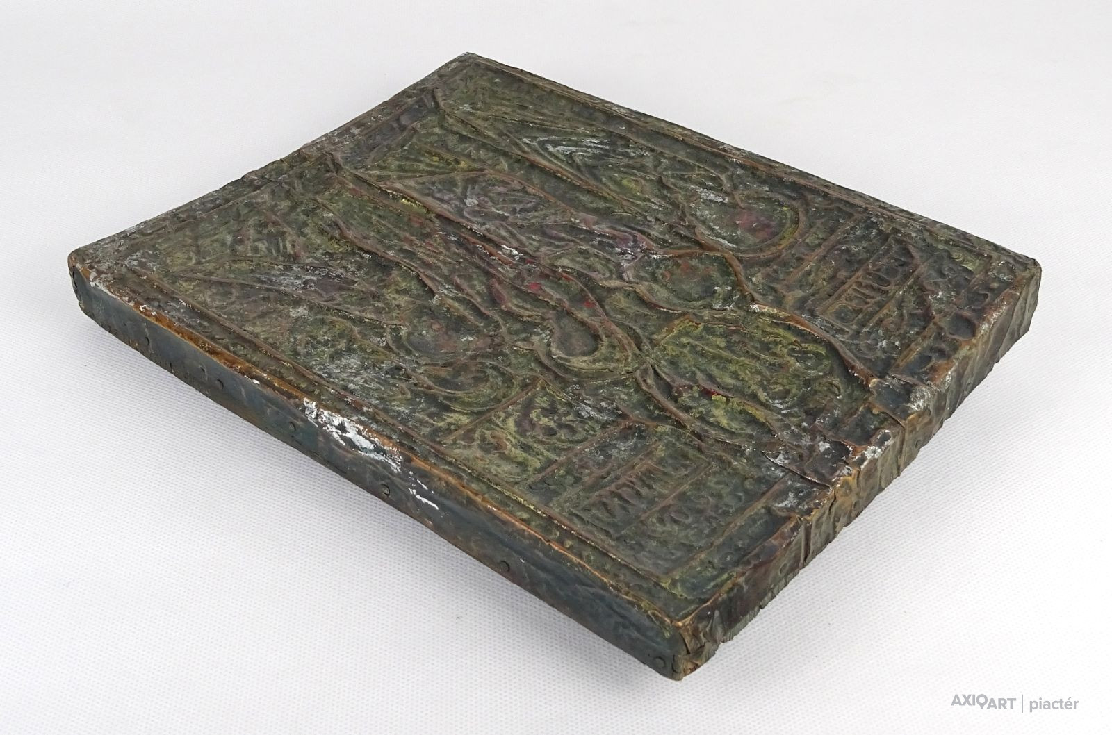 [1P701/Z058] Akasztási lehetőséggel rendelkező régi ikon, fa deszkára formázott fém lemez, réz lemez ikon. Felülete festett, kopottas és patinás. Rajta felirat: ABRAZICO WACKA (?) Magasság: 27 cm Szélesség: 20 cm Súly: 0.905 kg