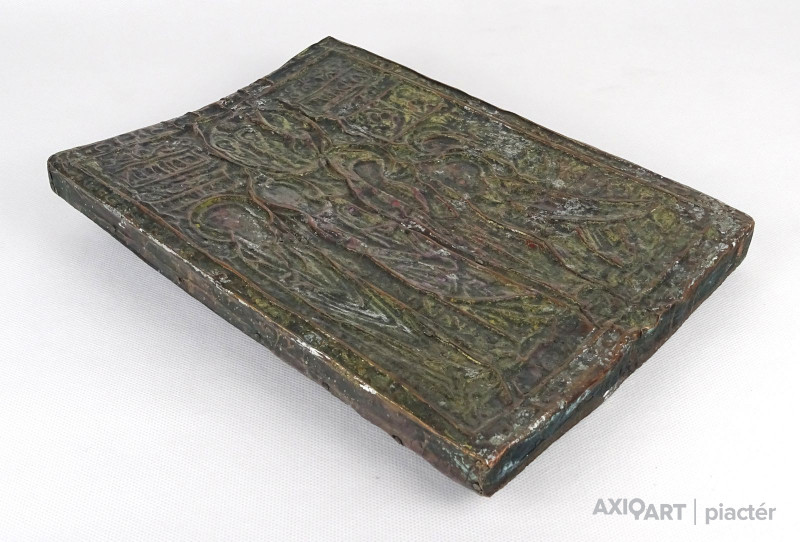 Akasztási lehetőséggel rendelkező régi ikon, fa deszkára formázott fém lemez, réz lemez ikon.