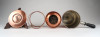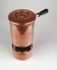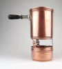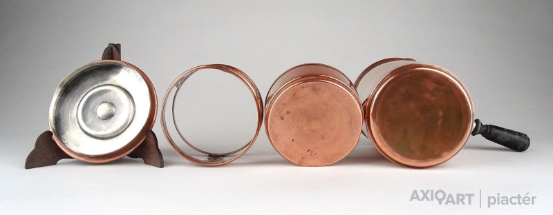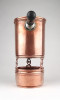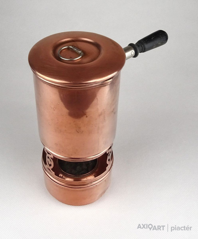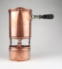[1A426/UZ-N] Szép állapotú, régi, vörösrézből készült, állványos kávéfőző, vízmelegítő, spiritusz égővel. Belseje ónozott, az edény fa füllel rendelkezik. Magasság: 18.5 cm Szélesség: 9.5 cm Hosszúság: 17.5 cm Súly: 0.45 kg