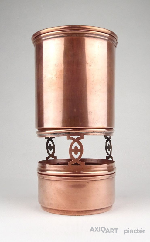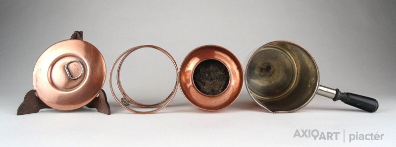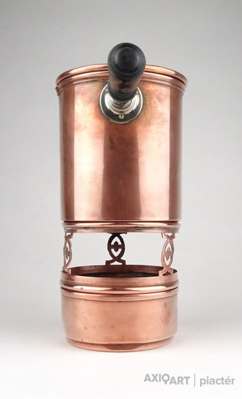 Szép állapotú, régi, vörösrézből készült, állványos kávéfőző, vízmelegítő, spiritusz égővel. Belseje ónozott, az edény fa füllel rendelkezik.