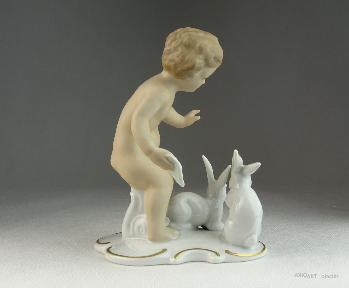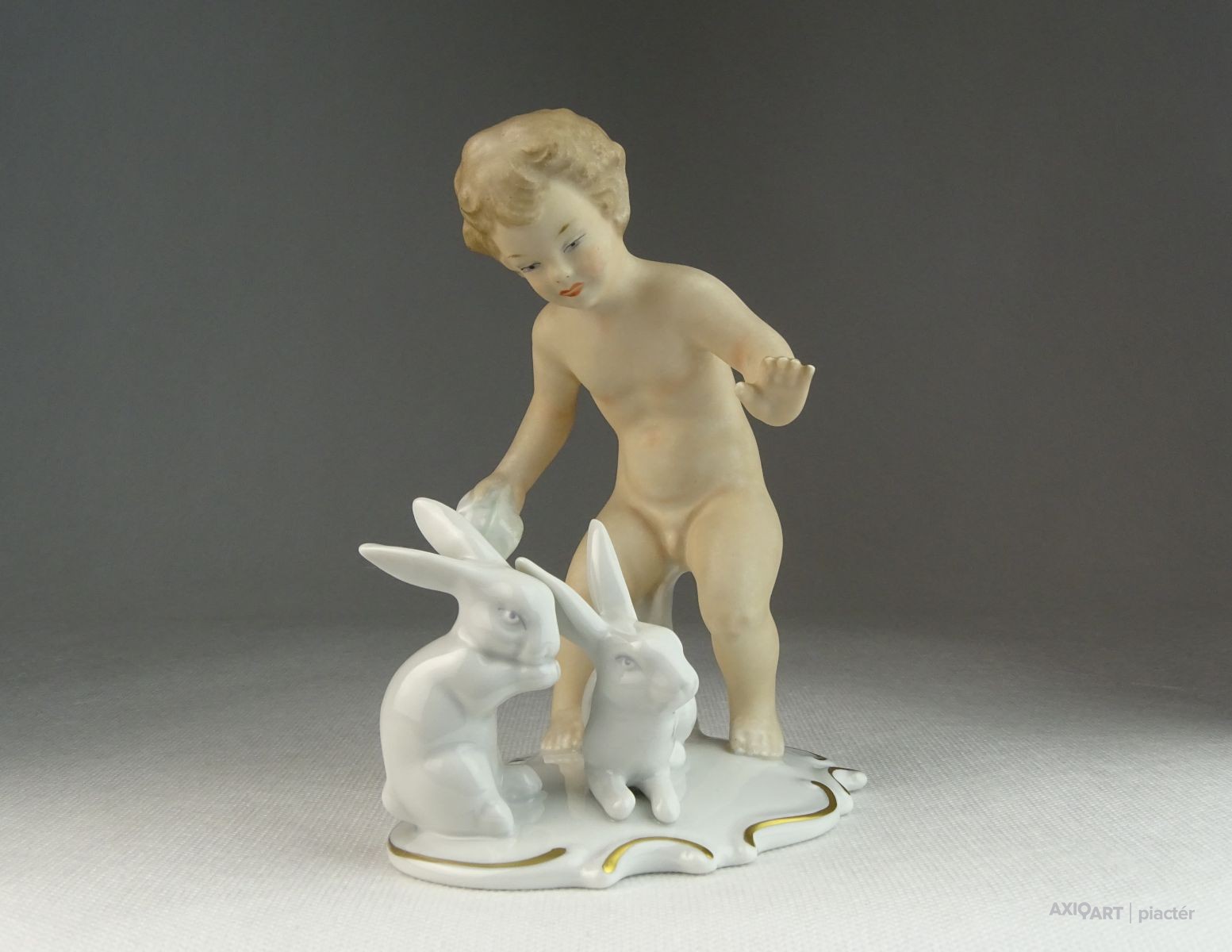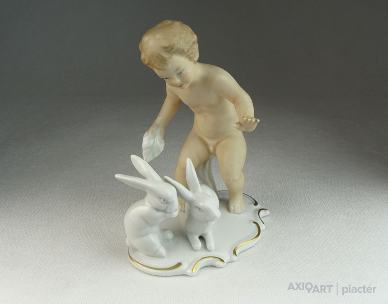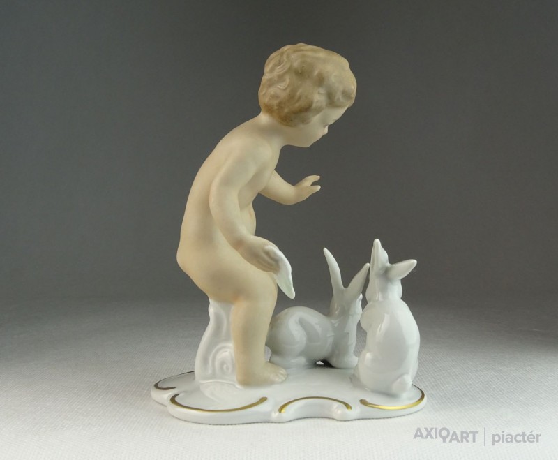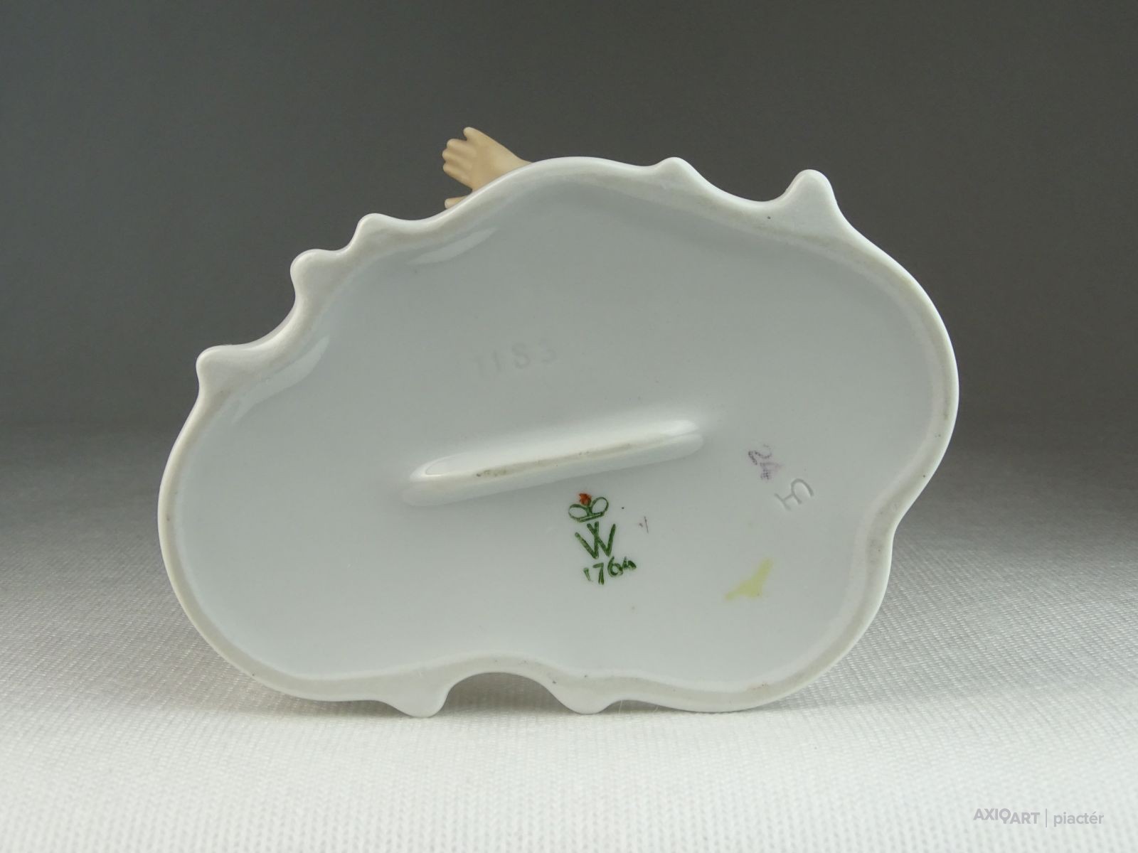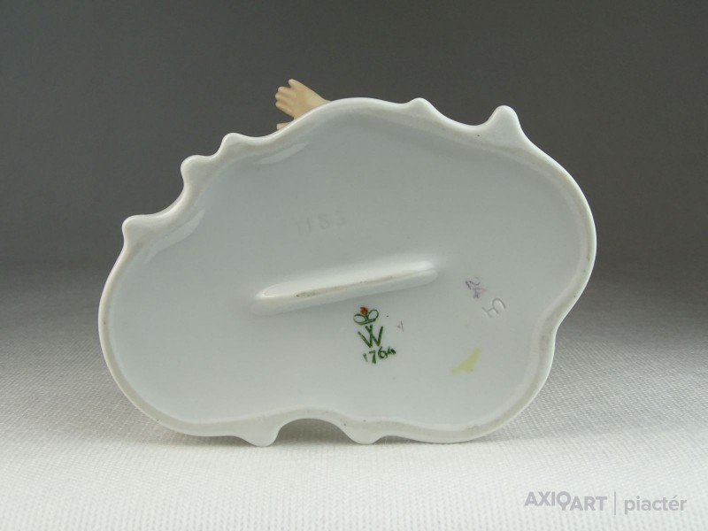 [0N528/VTR-2] Hibátlan állapotú, régi, jelzett Wallendorfi porcelán szobor kompozíció, aranyozott szélű barokkos talapzaton. Nyulakat etető puttó. Alján koronás márkajelzés: W 1764 Formaszám: 1183 Magasság: 15 cm Szélesség: 8.5 cm Hosszúság: 12 cm Súly: 0.34 kg   Magassága 19,5 cm. Súlya: 336 g