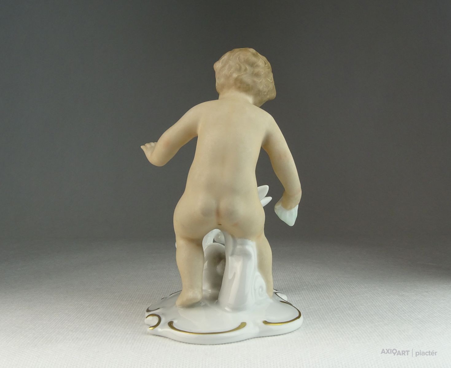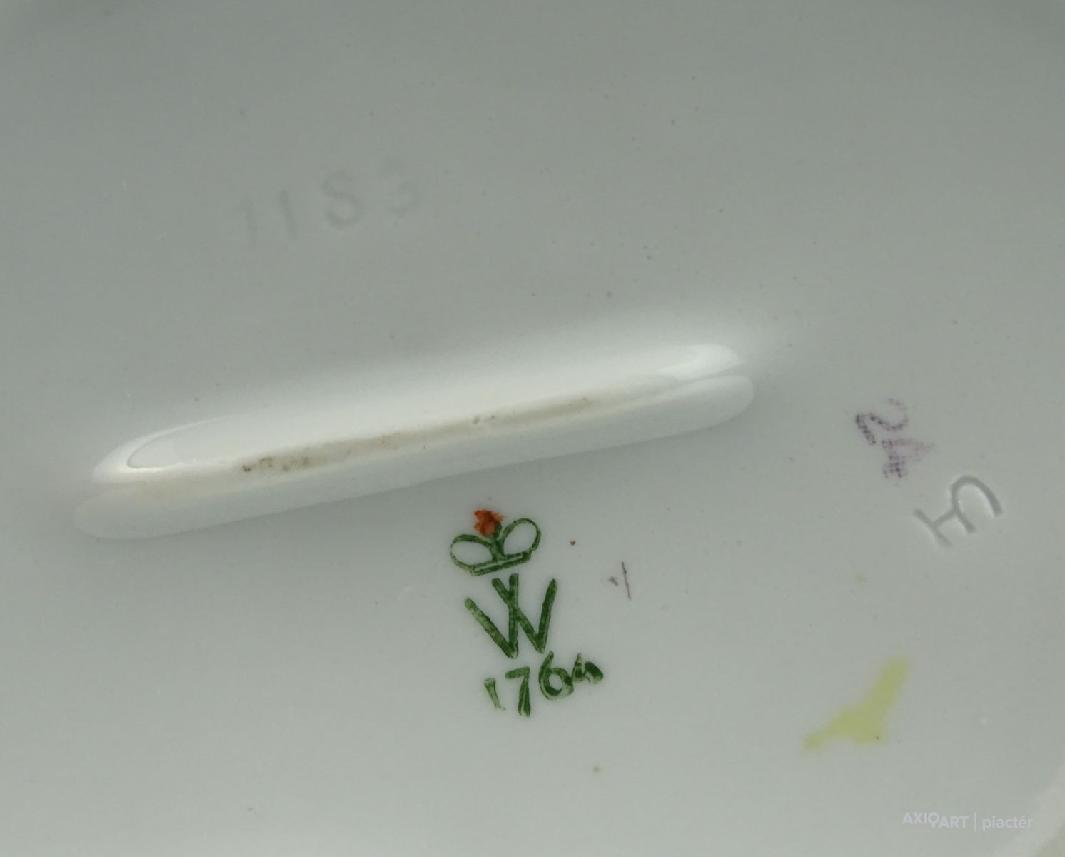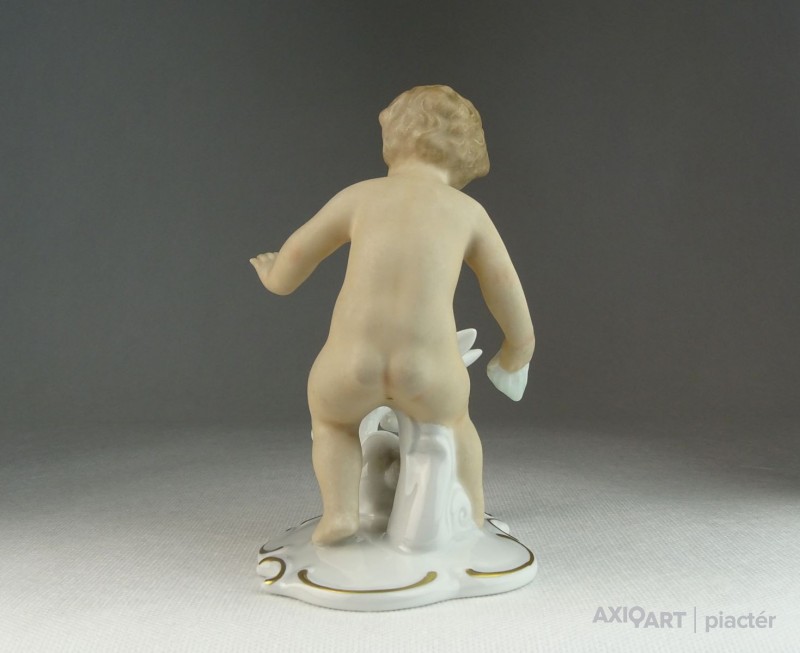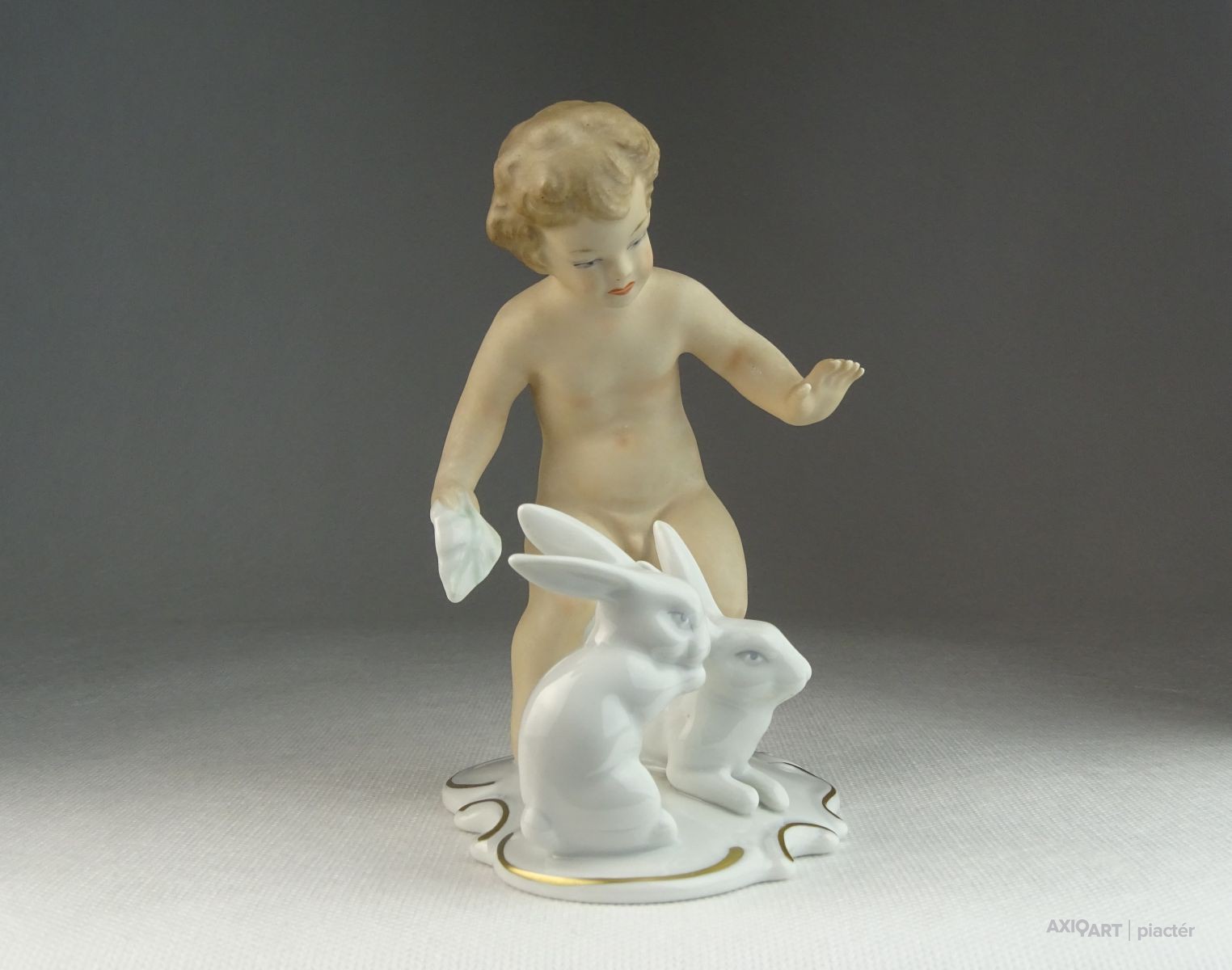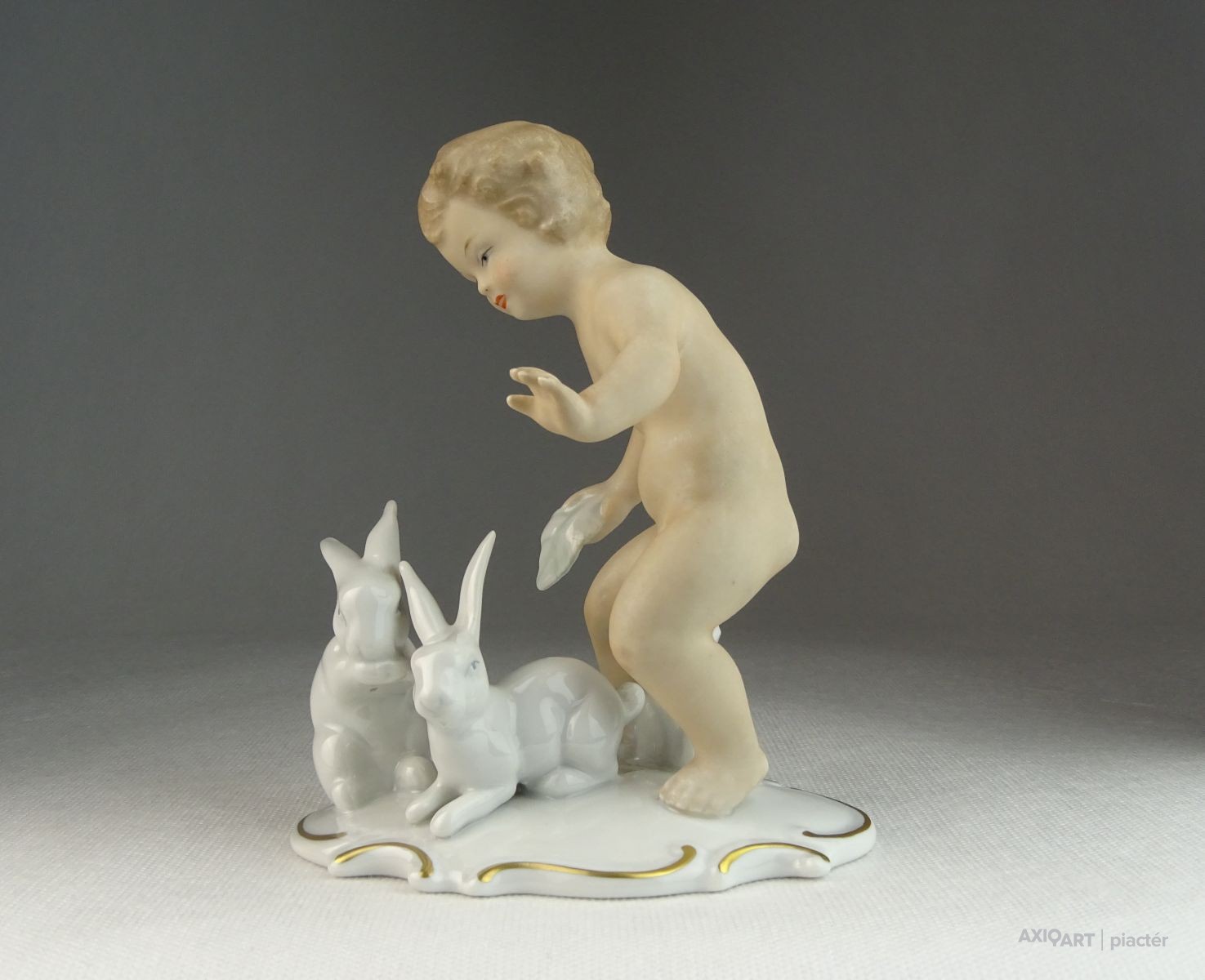 [0N528/VTR-2] Hibátlan állapotú, régi, jelzett Wallendorfi porcelán szobor kompozíció, aranyozott szélű barokkos talapzaton. Nyulakat etető puttó. Alján koronás márkajelzés: W 1764 Formaszám: 1183 Magasság: 15 cm Szélesség: 8.5 cm Hosszúság: 12 cm Súly: 0.34 kg   Magassága 19,5 cm. Súlya: 336 g