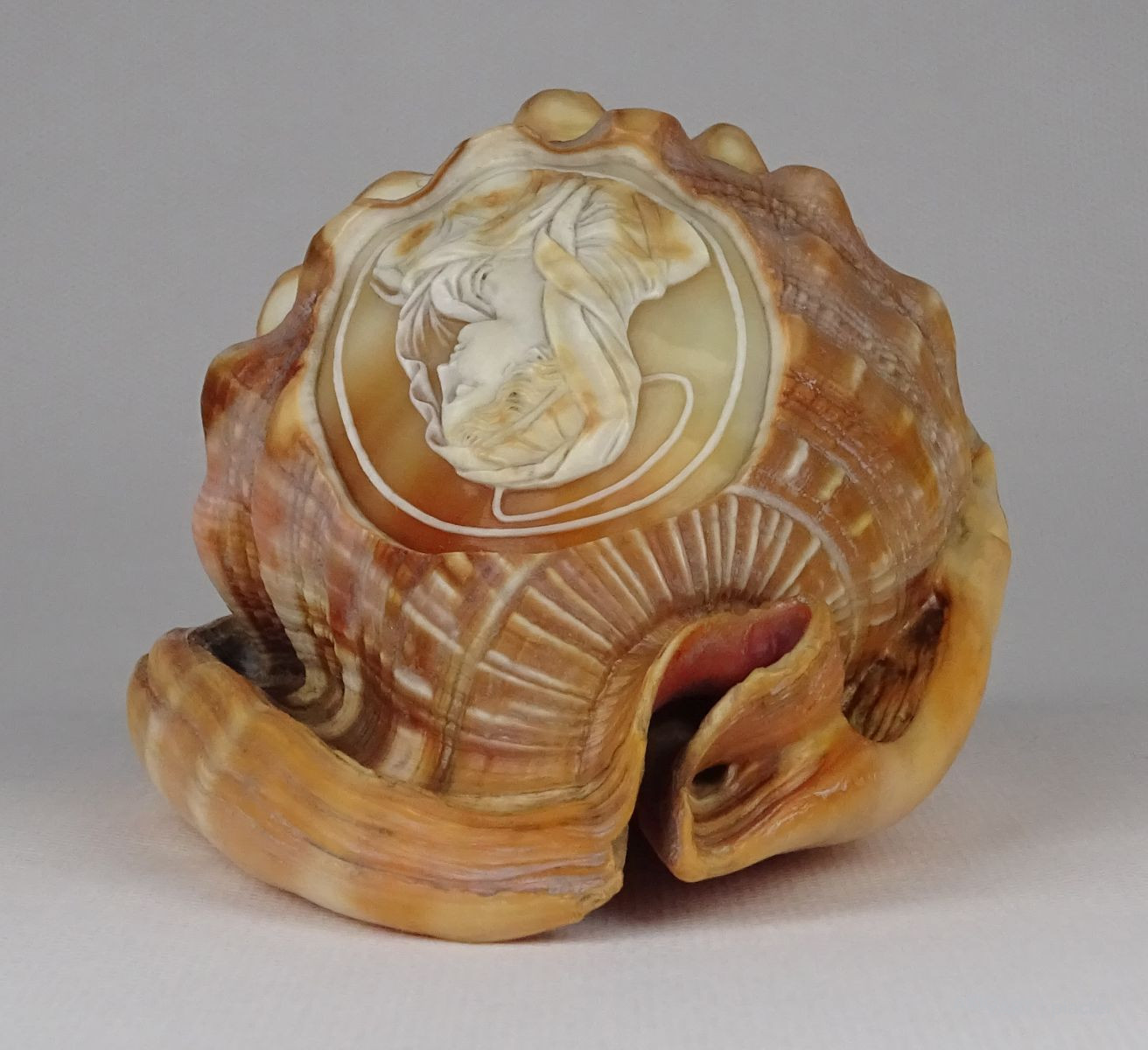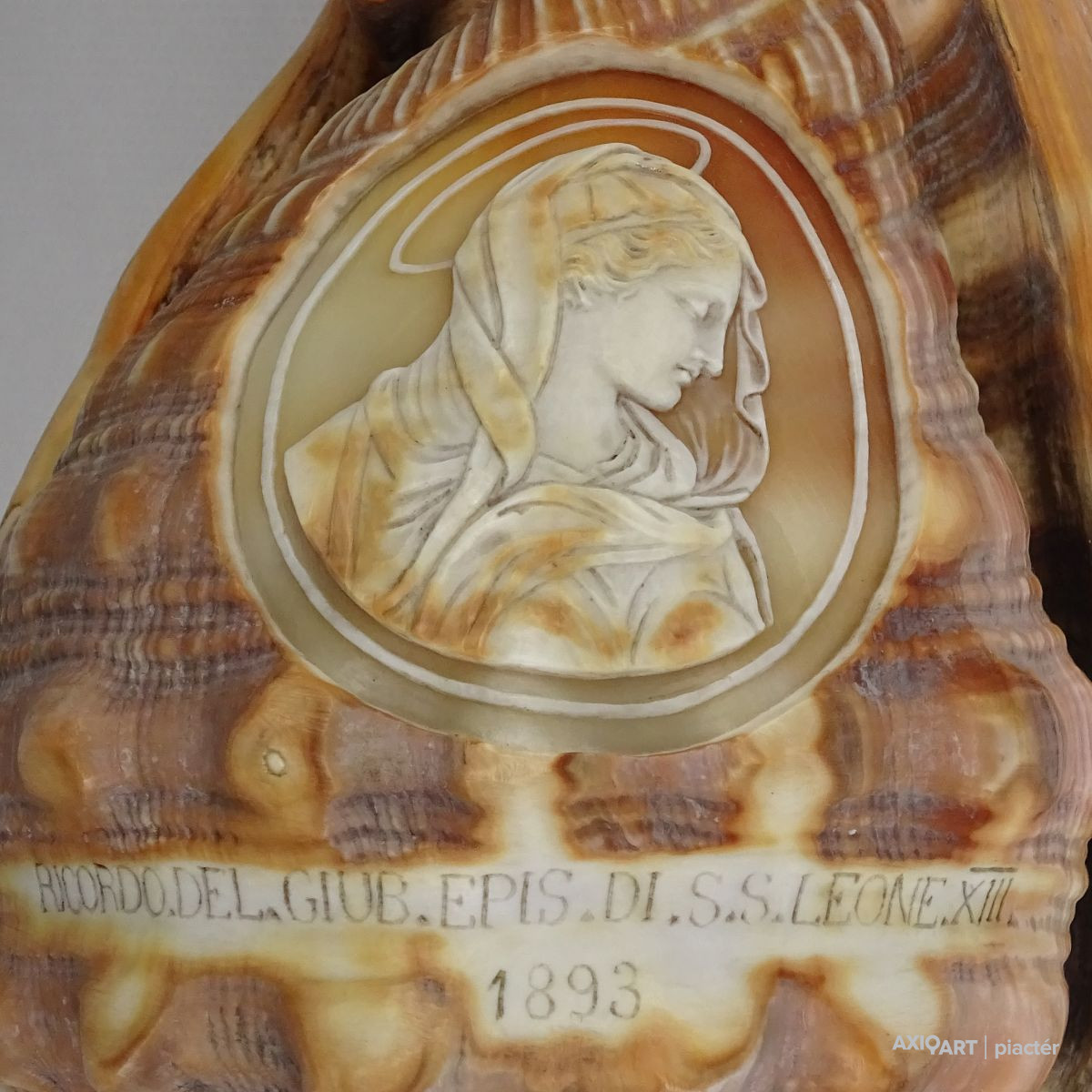 Szép állapotú nagy méretű régi tengeri csiga. Rajta csiszolt, női portré, Mária portré látható.