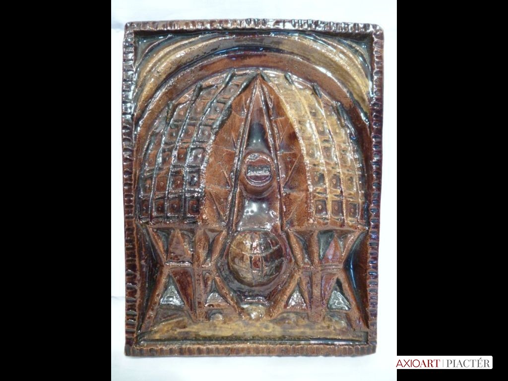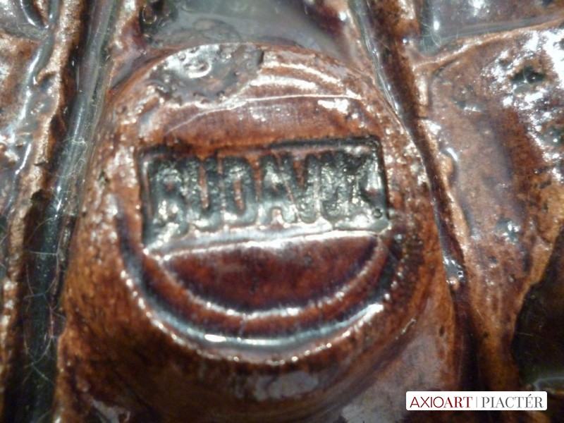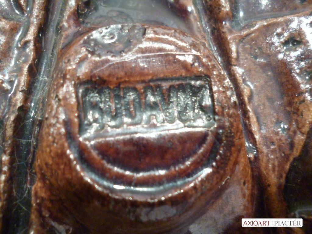 Két darab hibátlan kerámia plakett. Nagyméretű darabok, mindkettőben BUDAVOX felirat olvasható, hátul a művésznő monogramos vésett jelzése.