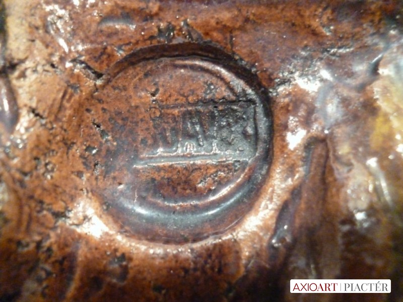 [1S294/Z059] Jelzett Kis Roóz Ilona kerámia figura. Felső peremén néhány kisebb elfestett lepattanás található, lásd fotó. Alján jelzés: KISS ROÓZ Magasság: 12.5 cm Szélesség: 11 cm Súly: 0.485 kg Kiss Roóz Ilona keramikus Születési hely: Szatmárnémeti [Satu Mare, RO] Születési dátum: 1920 Kiállítások az adatbázisban:  Kiss Roóz Ilona életműkiállítása Mesterei: Orbán Antal, Ohmann Béla. 1939-43: Iparművészeti Iskola, mesterei: Orbán Antal, Ohmann Béla. 1956, 1962: Munkácsy-díj; 1980: érdemes művész; 1984: SZOT-díj; 1994: MSZOSZ díja; 1995: Magyar Köztársasági Érdemrend Középkeresztje. A magyar kerámia Kovács Margit által teremtett naiv-népies irányzatának jeles művelője. Edényeit, kisplasztikáit, ill. murális alkotásait vidám színvilág és kedves humor jellemzi. 1948 és 1952 között tanított az Iparművészeti Főiskolán, azóta szabadfoglalkozású. Egyéni kiállítások 1964 ? Katona József Múzeum, Kecskemét 1973 ? Derkovits Galéria, Szombathely 1977 ? Csepel Vas és Fémművek, Budapest 1981 ? Kaesz Gyula Szakmunkásképző Intézet, Budapest 1983 ? Nógrádi Sándor Múzeum, Salgótarján 1987 ? Petőfi Művelődési Ház, Tiszaluc 1994 ? Petőfi Művelődési Ház, Tiszaluc 1995 ? Csók Galéria, Budapest [Pannonhalmi Zsuzsával és Sarkantyu Judittal] Válogatott csoportos kiállítások 1952 ? Iparművészeti kiállítás, Ernst Múzeum, Budapest IV. Országos Iparművészeti Kiállítás, Műcsarnok, Budapest Országos Iparművészeti Kiállítás, Műcsarnok, Budapest I., II. Országos Kerámia Biennálé, Pécs Magyar kerámia, Ankara, Isztambul XX. századi magyar keramikusok, Iparművészeti Múzeum, Budapest ? Az agyag mesterei, Vigadó Galéria, Budapest Őszi Kerámia Kiállítás, Olaf Palme Ház, Budapest Művek közgyűjteményekben Déri Múzeum, Debrecen ? Iparművészeti Múzeum, Budapest ? Janus Pannonius Múzeum, Pécs ? Kispréposti Palota, önálló gyűjtemény, Eger. Köztéri művei kerámia dombormű (1958, Pereces, bölcsőde) kerámia napóra (1959, Székesfehérvár, Béke téri iskola) csempeburkolat (1961, Szeged, rendelőintézet) falikép (kerámia, 1962, Sopron, Gyermekszanatórium) kerámia falikép (1966, Békéscsaba, bölcsőde) Irodalom GÁL J.: ~ 77 éves. Beszélgetés a művésszel, Magyar Iparművészet, 1997/4. KESZTHELYI K.-LACZKÓ I.: A magyar kerámiaművészet I., Alkotók, adatok 1945-1998, Budapest, 1999. Vadas József + MAOE Forrás: artportal