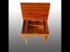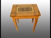 [3008/UZ-K] Gyönyörű állapotú, rendkívül dús intarziás kis asztal, asztallapja felhajtható, alatta 5 fakkos osztás. Játékasztal, kártyaasztal, varróasztal szerepét egyaránt be tudja tölteni. A zenélő szerkezete működőképes, azonnal ajándékba adható állapotú, lakásba rakható darab. Magasság: 43 cm Szélesség: 36.5 cm Hosszúság: 27 cm   Magassága 43 cm, szélessége 36,5 cm, mélysége 27 cm.