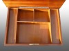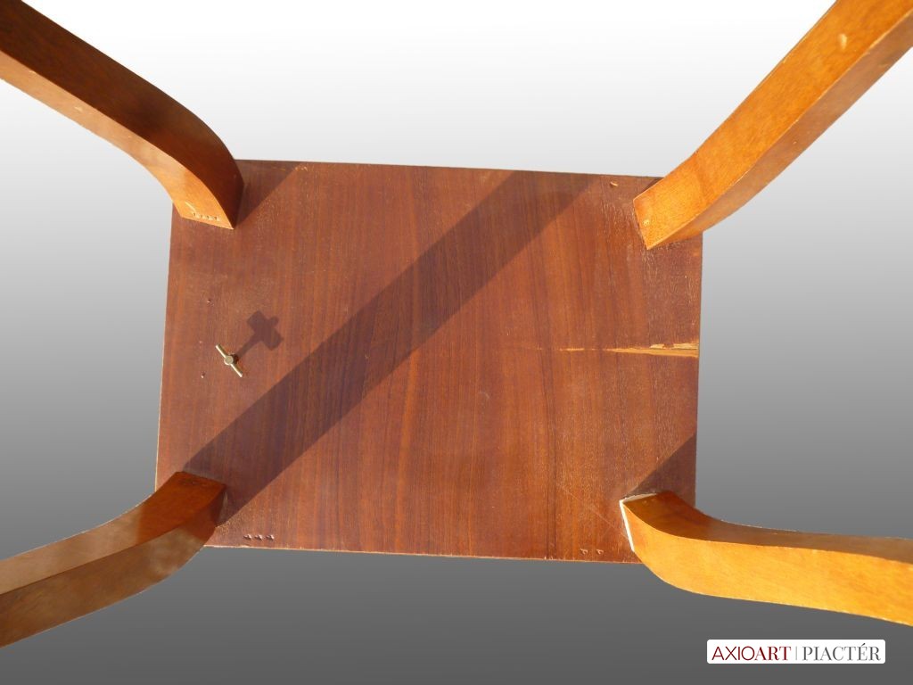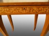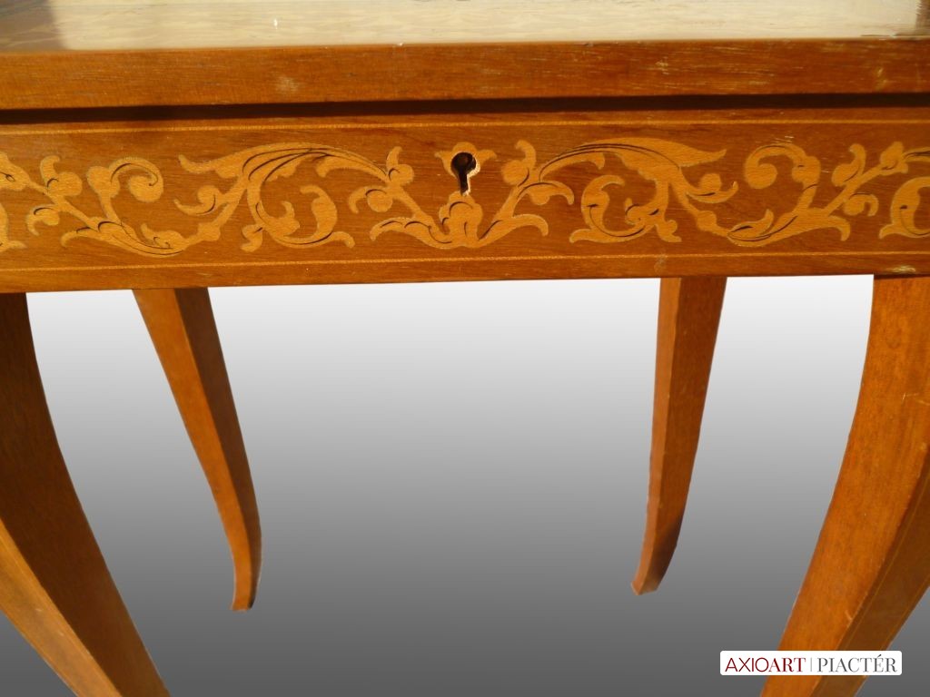 Gyönyörű állapotú, rendkívül dús intarziás kis asztal, asztallapja felhajtható, alatta 5 fakkos osztás.