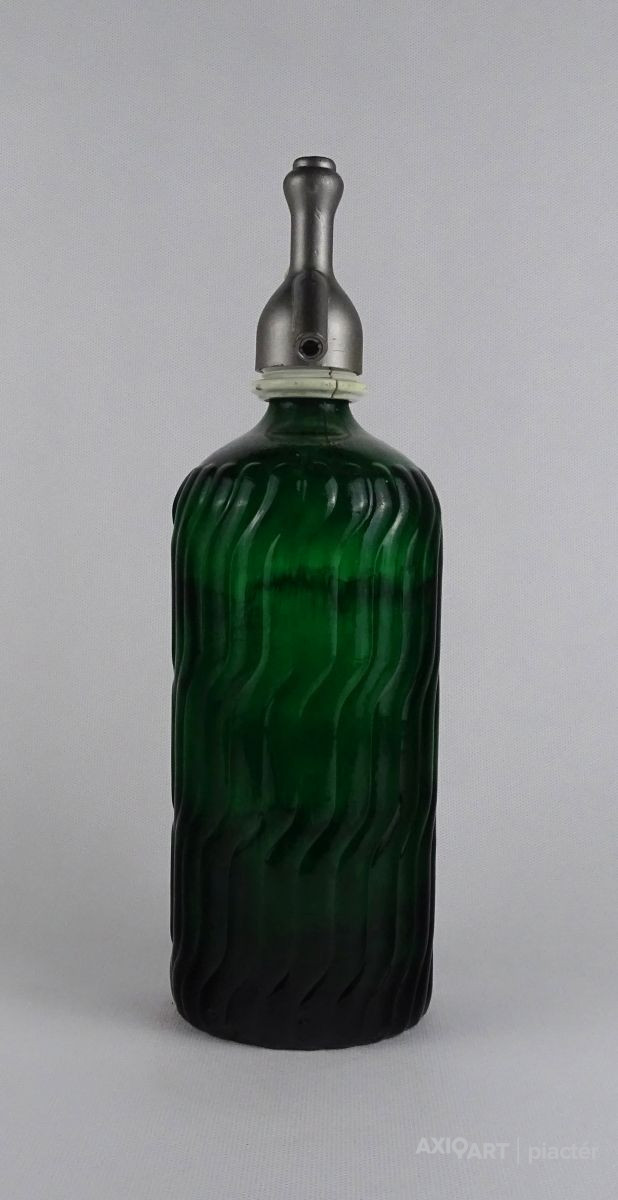 Régi hibátlan állapotú szódásüveg, szódás palack. Ezüst színű fém fejjel rendelkezik.