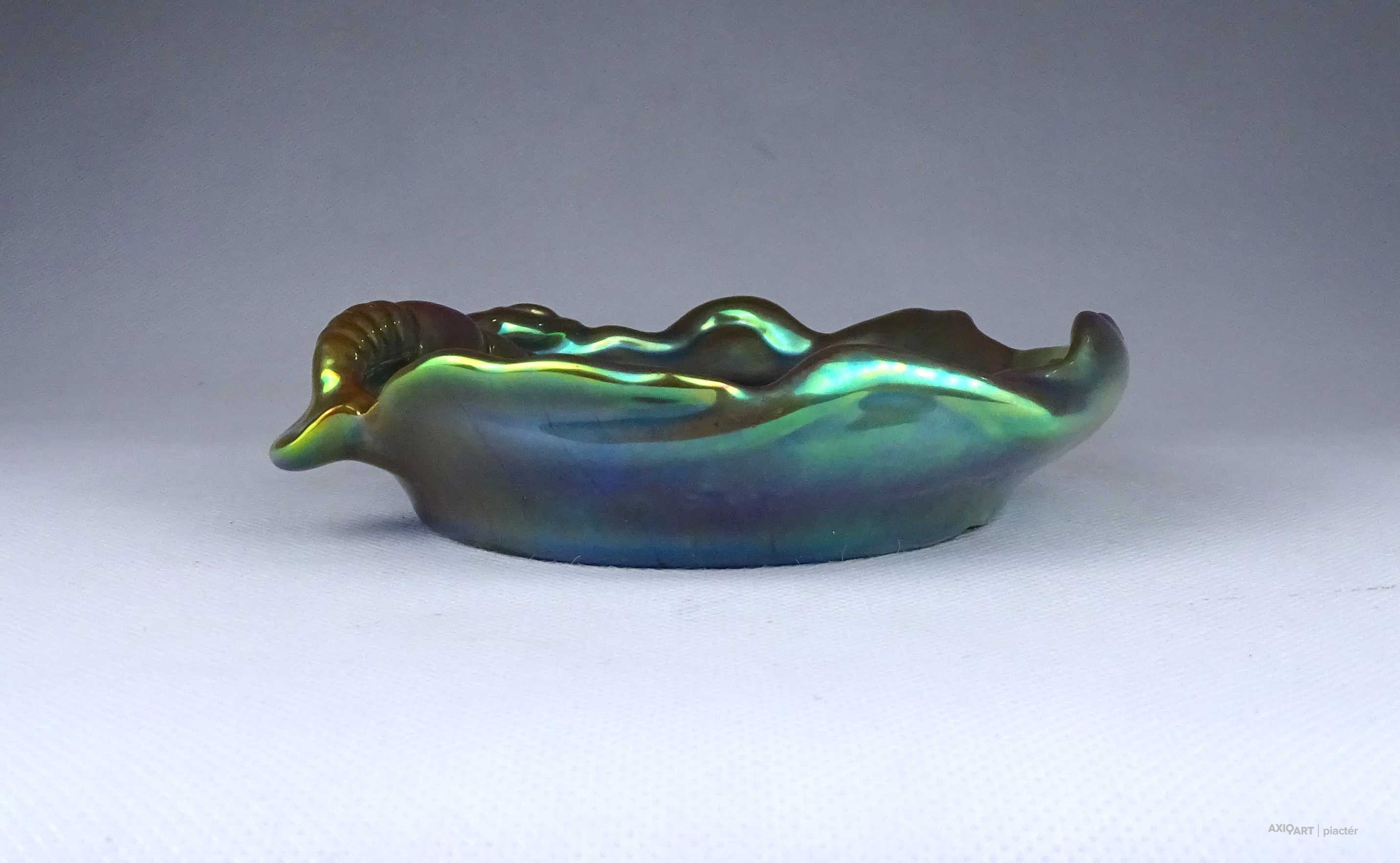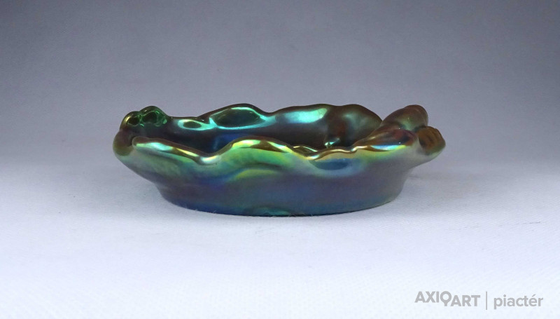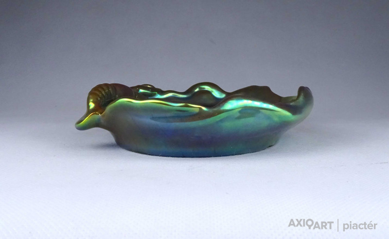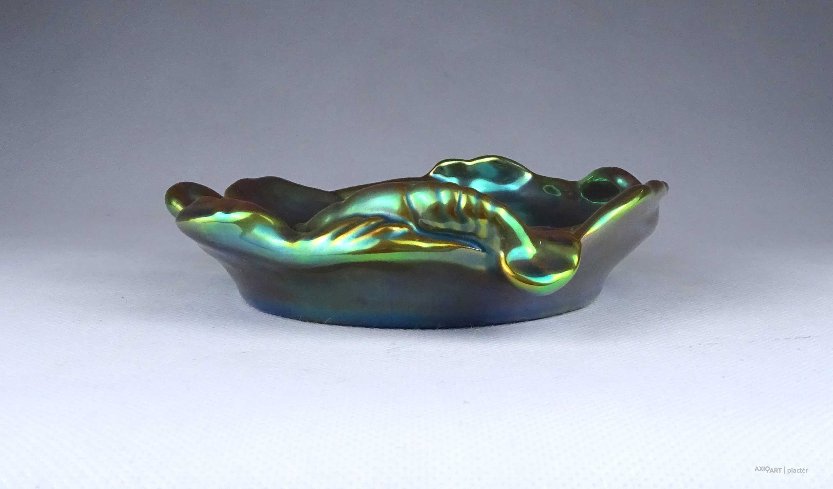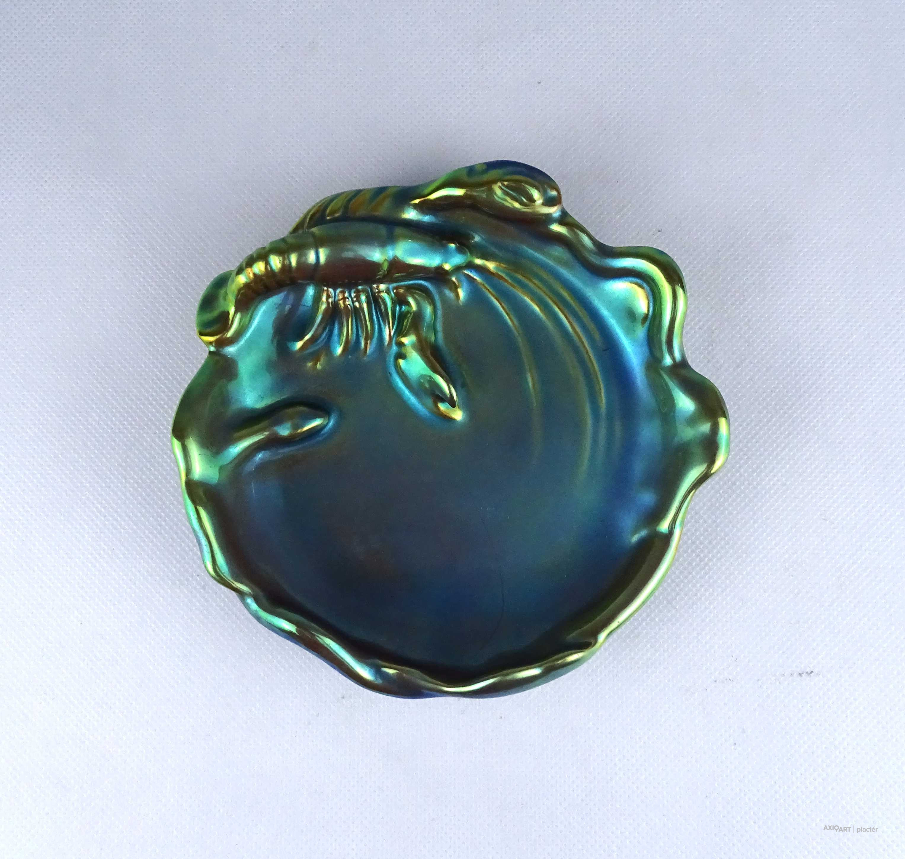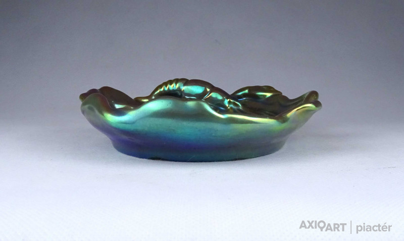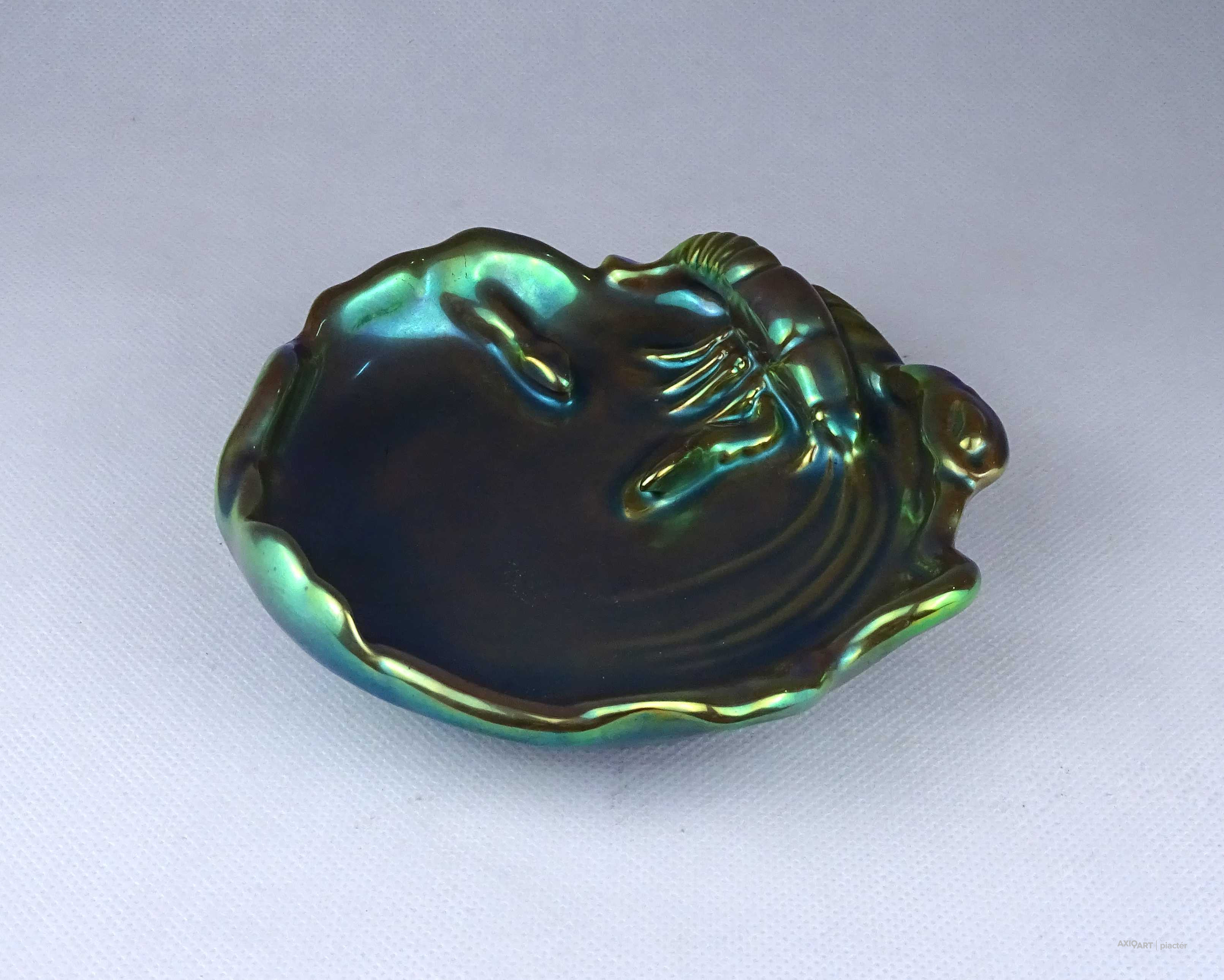 Régi, hibátlan állapotú, zöld eozin mázas Zsolnay porcelán névjegykártyatartó tál, kínáló tál, hamutál. A tál széle fodros, hullámos. A tálat egy nagy méretű rák vagy homár díszíti.