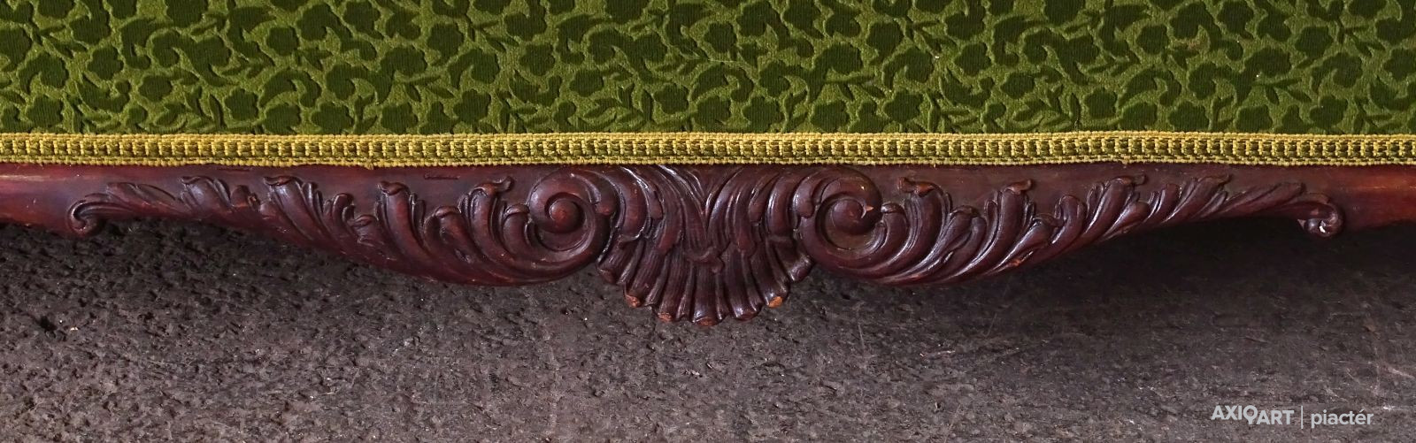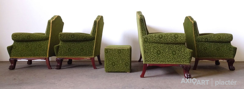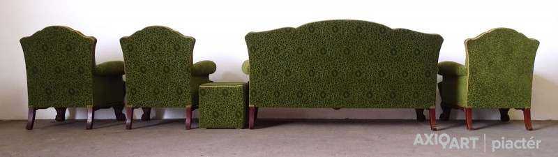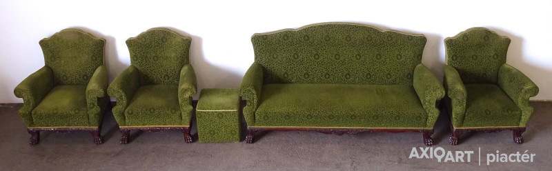 Régi, stabil szerkezetű öt darabos ülőgarnitúra. Kárpitozásuk szép, egységes, ülőfelületük epeda rugós, kényelmes. Azonnal enteriőrbe helyezhető szép állapotú garnitúra. Lábai és alsó fa része gyönyörű részletgazdag faragással díszített.