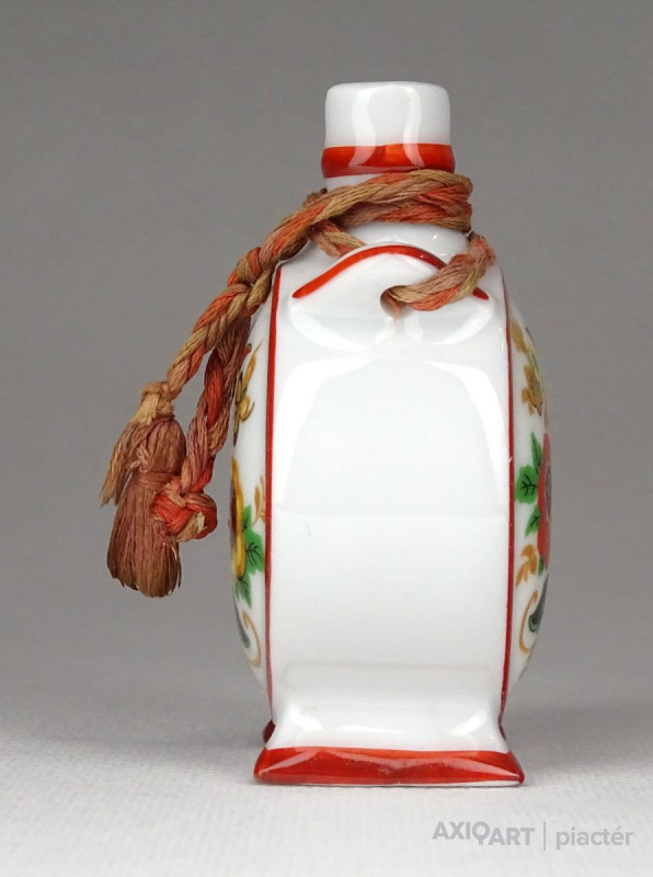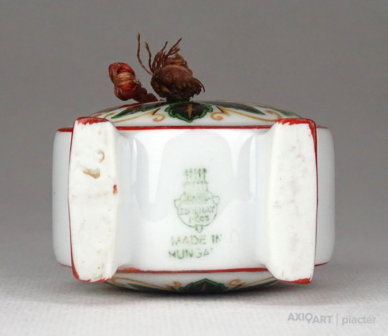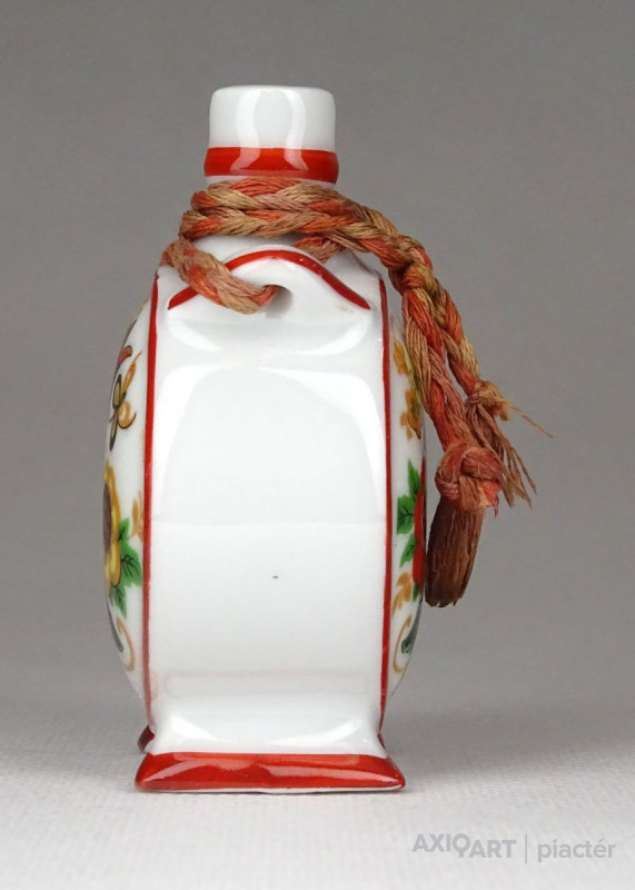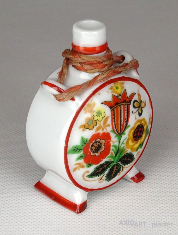 [1G172/X009] Szép állapotú, Zsolnay porcelán kulacs. Két oldalán magyaros virág díszítésekkel. Alján zöld Zsolnay-Pécs öttornyú márkajelzés: ZSOLNAY PÉCS MADE IN HUNGARY Magasság: 7.3 cm Szélesség: 5 cm Hosszúság: 3.3 cm Súly: 0.065 kg   Magassága 13 cm. Átmérője 9 cm. Súlya: 268 g
