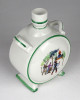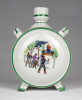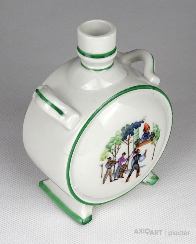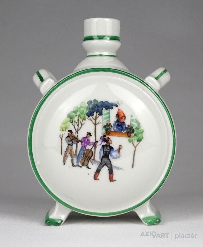 [1K931/X207] Szép állapotú, Zsolnay porcelán kulacs. Egyik oldalán magyaros huszár és menyecske, másik oldalán szerenádot adó legény jelenet. Alján zöld Zsolnay-Pécs öttornyú márkajelzés: ZSOLNAY PÉCS MADE IN HUNGARY Magasság: 11 cm Szélesség: 8 cm Súly: 0.16 kg   Magassága 13 cm. Átmérője 9 cm. Súlya: 268 g