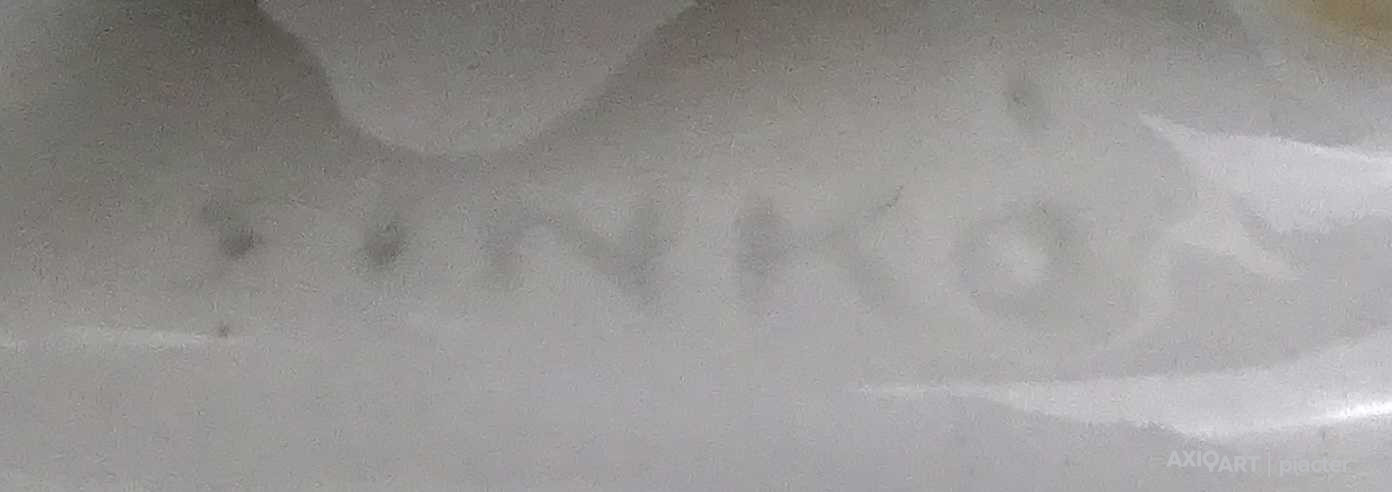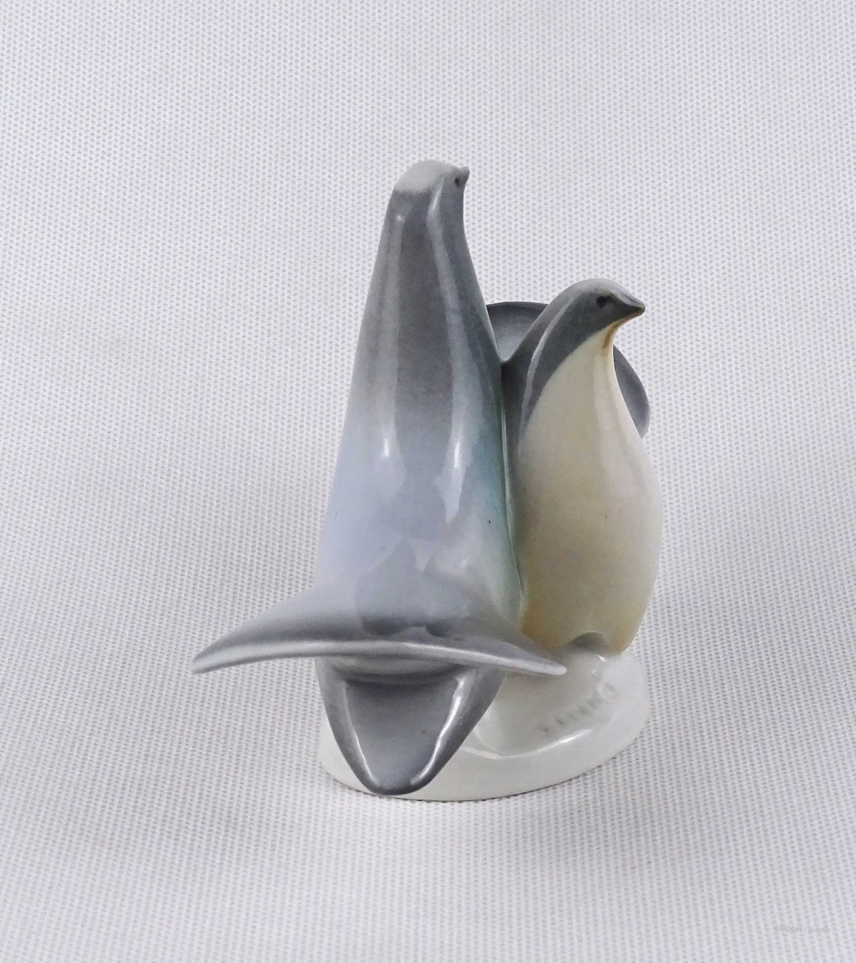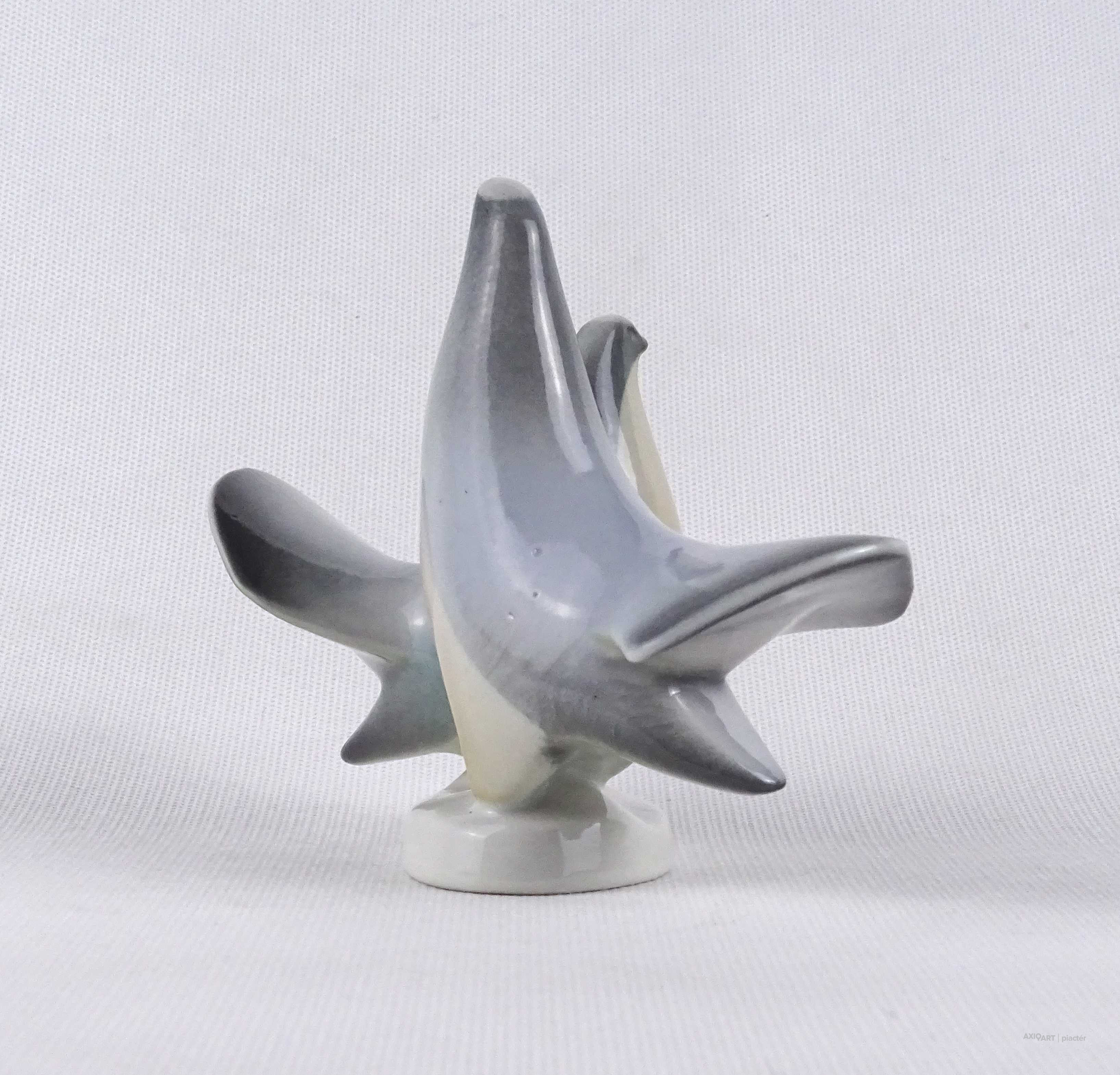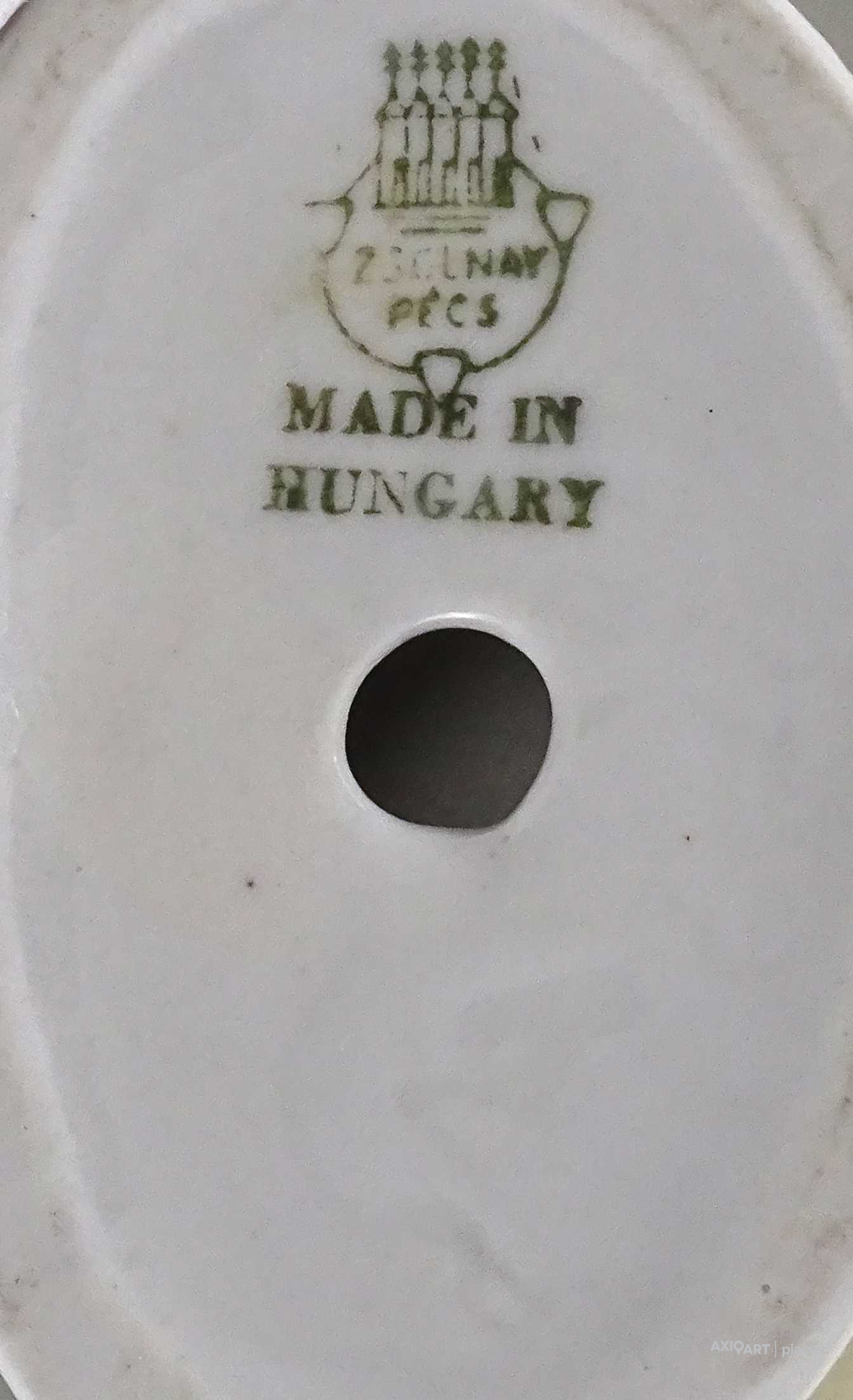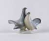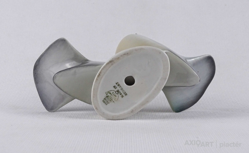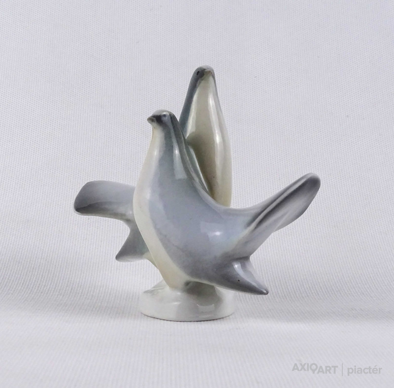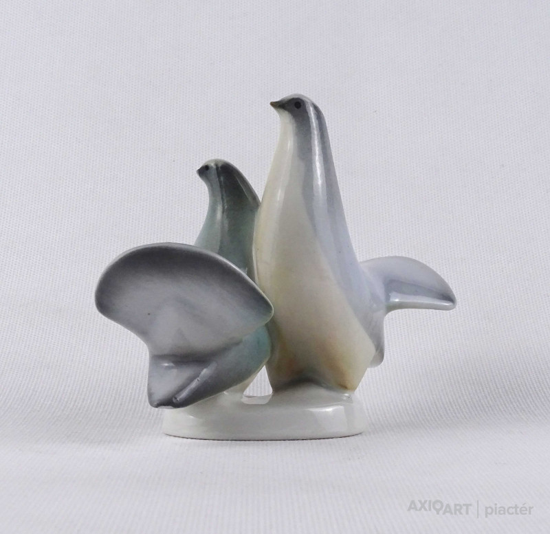 [1U301/X198] Hibátlan állapotú, talapzaton álló madár, galamb pár. Alján zöld öttornyú Zsolnay márkajelzés: ZSOLNAY PÉCS MADE IN HUNGARY Talapzatán mélynyomással formatervező neve: SINKÓ Magasság: 10.2 cm Szélesség: 5.5 cm Hosszúság: 13.4 cm Súly: 0.19 kg Sinkó András szobrász Születési hely: Gyerőmonostor Születési dátum: 1901 Honlap: Kiállítások az adatbázisban: Mesterei: Mátrai Lajos, Simay Imre. 1917-23: Magyar Iparművészeti Főiskola, mesterei: Mátrai Lajos, Simay Imre. 1928-30 között Párizsban dolgozott, ahol az 1930. évi tavaszi kiállításon három szobrát kiállították. 1936-ban Pécsett telepedett le, ahol a Zsolnay gyár művésze lett. Huszonhat évet dolgozott a gyárban, ezalatt számos kisplasztikát és domborművet mintázott. Ismertebb kisplasztikái: Flamingógyár, 1935;Kenyeret szelő asszony gyermekével, 1938; Bölény, 50-es évek. Köztéri művei Nendvich Andor és Marsay Andorné (pirogránit domborművek, 1943, Pécs) Szűz Mária (mázas pirogránit szobor, 1948, Pécs, Pálos templom előtt) Doktor Sándor (pirogránit dombormű, 1948, Pécs, Szülészeti Klinika) Szolláth György Forrás: artportal