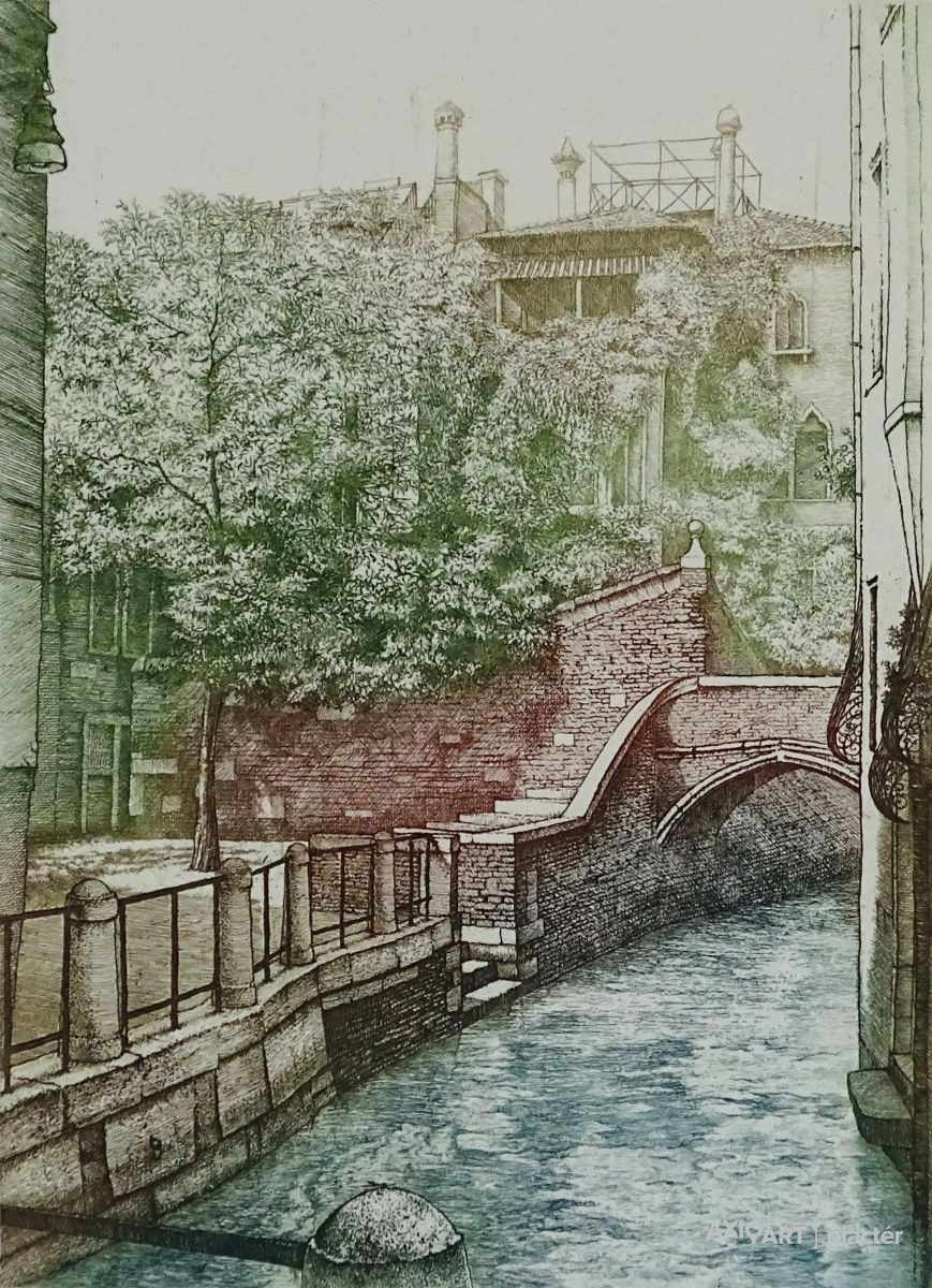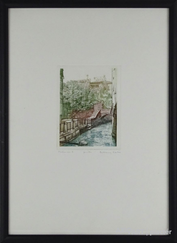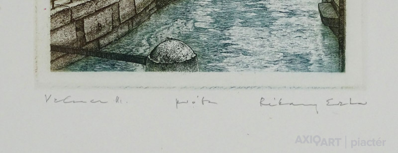 [1A855/102] Papír (színezett) rézkarc, üveglap mögött, fekete keretben. Jelezve jobbra lent: RÉKASSY ESZTER Mű címe balra lent: VELENCE III. Magasság: 45.5 cm Szélesség: 33 cm Súly: 1.03 kg Rékassy Eszter grafikus, illusztrátor Budapest, 1966-07-6 hirdetés Szerző: Balázs Sándor 1986-90: Magyar Képzőművészeti Főiskola, grafika szak, mesterei: Raszler Károly, Rozanits Tibor. Több országos tárlaton mutatta be munkáit, így gyakori résztvevője a Vásárhelyi Őszi Tárlatoknak, ahol több díjat is kapott. 1989: Városi Tanács díja; 1991, 1994: díj; 1995: munkajutalom A tizedes meg a többiek c. munkájáért; 1999: Szolnoki Képzőművészeti Triennálé díja. Tagja a Magyar Illusztrátorok Társaságának. Fő műfaja a rézkarc, de illusztrációkat, színesceruza-, tus- és krétarajzokat is készít. Rézkarcai a magyar grafika míves, szellemi töltetű vonulatának tradícióját, folytonosságát öregbítik. Édesapja, Rékassy Csaba grafikusművész tárgyias művészi örökségét, zsúfolt képterét fellazítja, egyéni hangvételű, lírai jegyekkel építi tovább (Rézrózsa, 1989). Poétikus, romantikus alkotásain a természeti-tárgyi-emberi világot egymásba szövi, szellemes gondolati kapcsolóelemekkel egymásba játszatja. Személyességet, intenzív azonosulást sugároznak a csendéletszerű munkáin feltűnő falevelei (Levél, 1989), madarai, kagylói, kövei, ahogyan a Velence-sorozat (I-XV., 1987-90) árnyalt tónusai, finoman ívelt, hajlékony vonalai kiváló rajzi tudásról tanúskodnak. Az egyedi rézkarcok és grafikák mellett jelentős illusztrátori tevékenysége, amit 1989-től kezdődően folytat. Az illusztrációra úgy tekint, mint ami felerősíti a verbális tartalmat, de túl is lép azon, önálló művészi alkotás (Tersánszky Józsi Jenő: Paprikás a buta nyúl, tus, színes ceruza, 1989; Hans Fallada: Kiskarácsony, tus, színes ceruza, 1990). Irodalom Lehet-e híd? A 36. Hódmezővásárhelyi Őszi Tárlatról, Művészet, 1990/1. Egyéni kiállítások Egyéni kiállítások 1993 • T-Art Galéria, Budapest 1994 • Kiállítási Csarnok, Mezőtúr • Ifjúsági Ház, Eger (kat.) 1999 • Kőrösi Csoma Sándor Általános Iskola, Dunakeszi. Forrás: artportal.hu