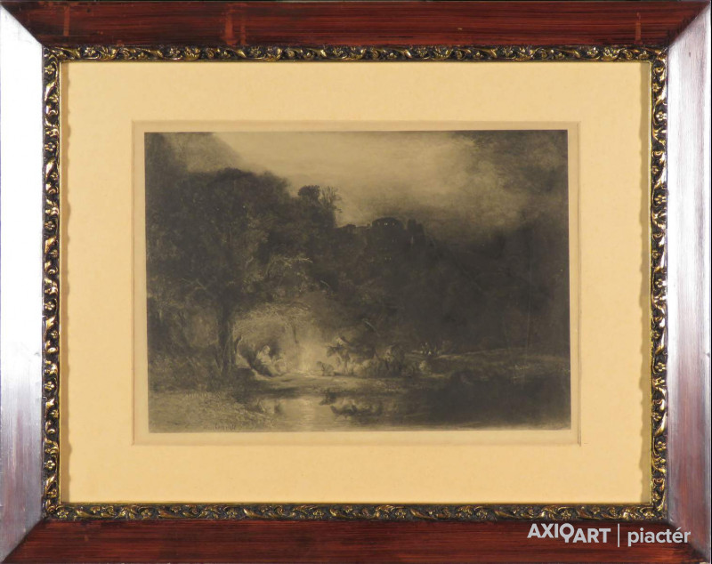 [FKC345/Bp93/94] A kép mérete: 15 x 17,5 cm keret nélkül. Készült: Rézkarc, Papír A kép Csillag József (Győrszentmárton, 1894, Budapest, 1977) alkotása. Jelezve lent "Asztag Csillag (ceruzával)" A festmény jó állapotban van. Keret: Új Magyar festők és grafikusok életrajzi lexikona I-II. Festő, grafikus. 1917-24 között a fővárosi Képzőművészeti Főiskolán tanult és szerzett rajztanári oklevelet. Révész Imre tanítványa volt. A '20-as években tanulmányúton járt Itáliában (Róma, Firenze, Velence, Pádova). Már főiskolás korában kezdett el dolgozni a pécsi és a kecskeméti művésztelepen. Első gyűjteményes tárlatát 1928-ban Pécsett rendezték festményeiből. 1929-ben rézkarcaiból rendeztek bemutatót Brüsszelben. Ezen kívül Firenzében és New Yorkban szerepelt kiállításokon. A '30-as évek folyamán többször műterem-kiállításon mutatta be alkotásait. Elsősorban tájképeket festett, a látványhoz hű, realista modorban. Kerültek ki keze alól magyar jellegű zsánerképek is. Rézkarcain is főként a táj szépségeit igyekezett megörökíteni. Tájképei stockholmi és hollandi múzeumokban is szerepelnek. (Éber, ML, Gyulai Gergely adatközlése nyomán) Magyar festők és grafikusok adattára A Képzőművészeti Főiskolán Révész Imre tanítványa volt. A kecskeméti művésztelepen is dolgozott. 1928-ban Kecskeméten, 1938-ban Velencében, 1935-ben Brüsszelben rendezett gyűjteményes kiállítást. Tájképei stockholmi, hollandiai múzeumokban is szerepelnek. - ML Magyar festők és grafikusok életrajzi lexikona I-II. Műgyűjtők és kereskedők kézikönyve Festő. A fővárosi Képzőművészeti Főiskolán Révész Imre tanítványa volt, majd külföldi tanulmányútra utazott. Gyűjteményes kiállításai voltak Brüsszelben, Firenzében és New Yorkban. Főként magyar jellegű zsánerképeket festett. 1931-ben "Fabán" c. képe kitüntető elismerést kapott. Tájképei stockholmi és hollandiai múzeumokban is szerepelnek. (Éber, ML) Művészeti lexikon I-IV. Festő, grafikus. Révész Imre tanítványa volt a Képzőművészeti Főiskolán, dolgozott a kecskeméti művésztelepen is. 1928-ban Kecskeméten, 1931-ben Velencében, 1935-ben Brüsszelben rendeztek gyűjt. kiállítást műveiből. Tájképei stockholmi, hollandiai múzeumokba is kerültek. Újabban rézkarcokat is készít.
