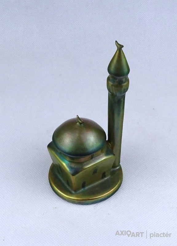 [1Z726/Z008] Hibátlan állapotú, jelzett zöld eozin mázas Zsolnay porcelán dzsámi minarettel. Alján Zsolnay öttornyú márkajelzés: ZSOLNAY PÉCS MADE IN HUNGARY Magasság: 13.5 cm Szélesség: 6.8 cm Súly: 0.105 kg