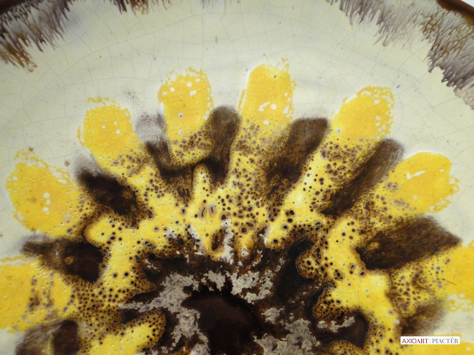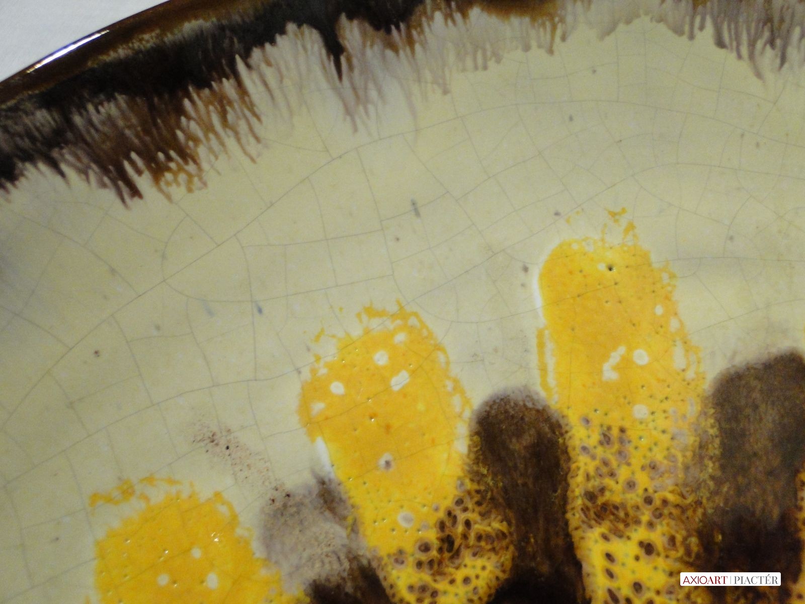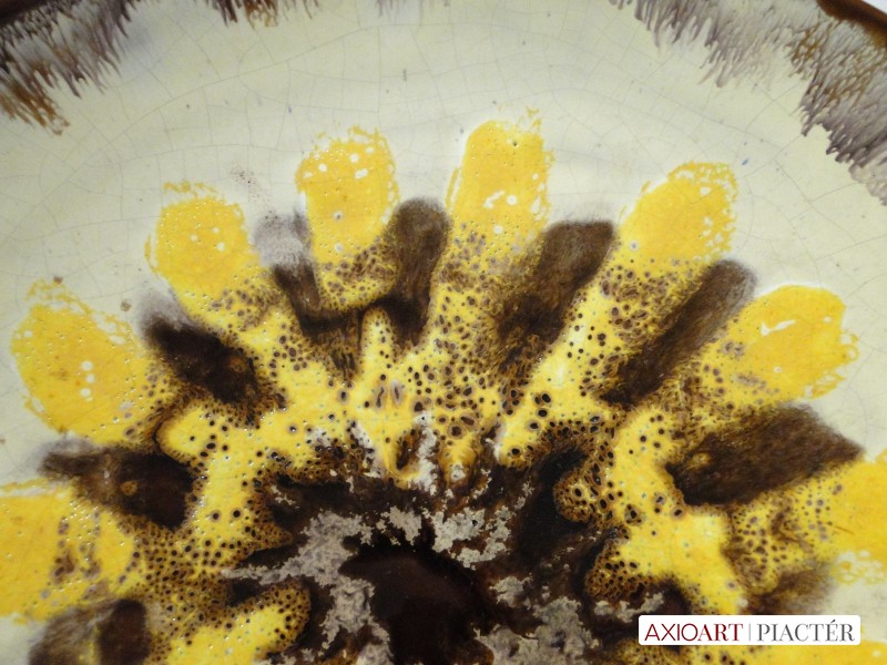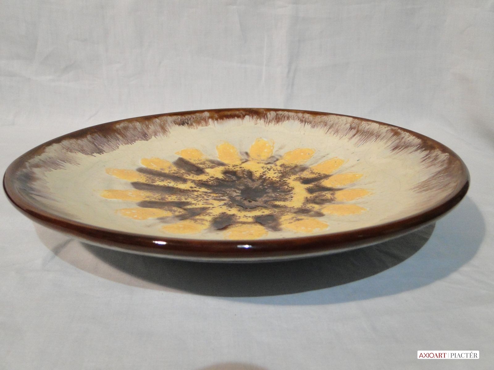 [0758/BX-9] Régi retro hibátlan állapotú jelzett, csorgatott mázas nagyméretű kerámia fali dísztányér. Hátoldalán falra akasztási lehetőség. Alján jelzés, lásd fotó. Szélesség: 31.5 cm Súly: 1.36 kg