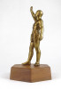 [1S157/X005] Hatszögű fa talapzaton álló réz férfi sportoló, olimpikon szobor. Magasság: 22.5 cm Szélesség: 12.5 cm Súly: 0.87 kg