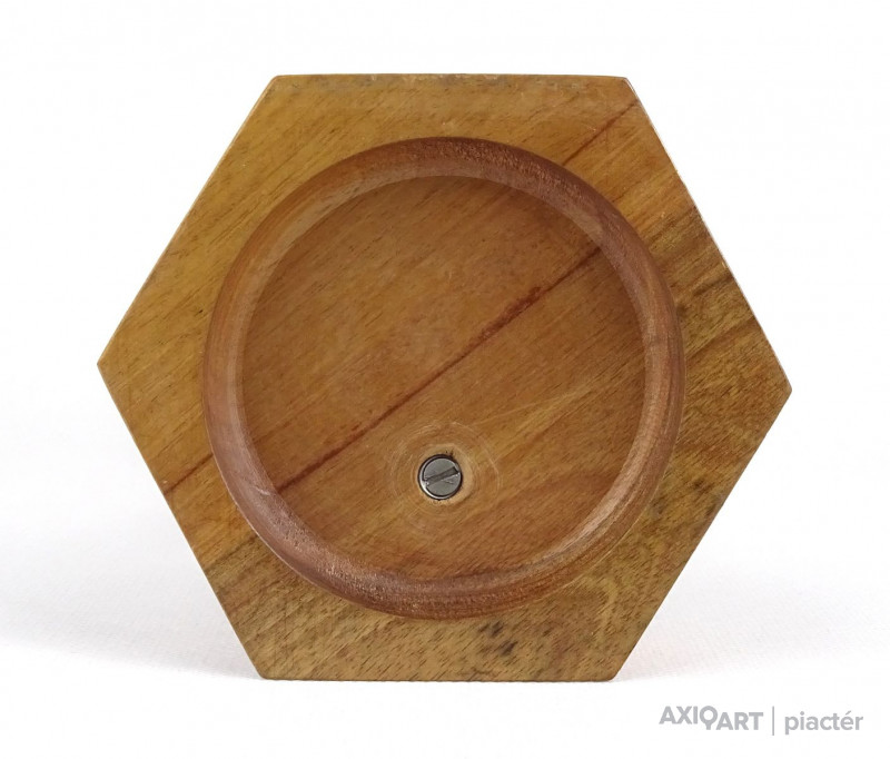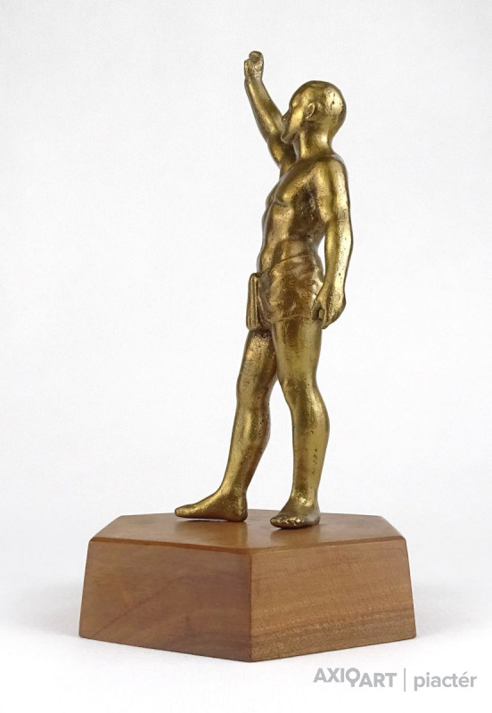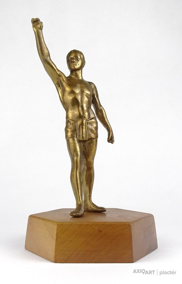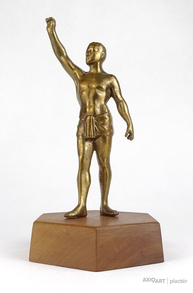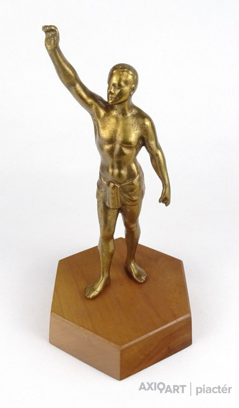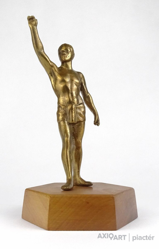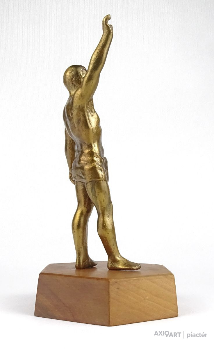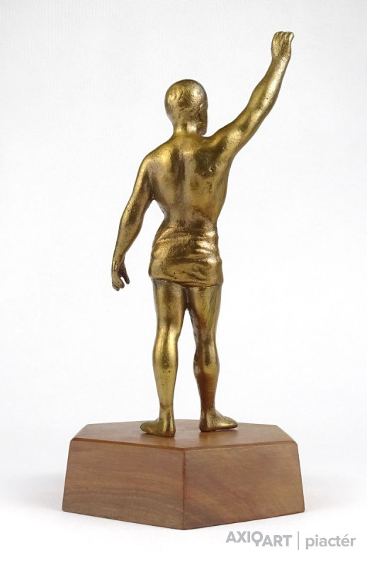 Hatszögű fa talapzaton álló réz férfi sportoló, olimpikon szobor.