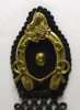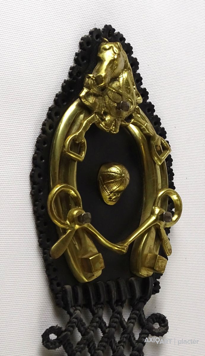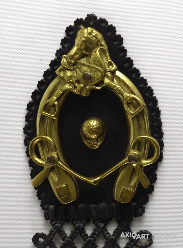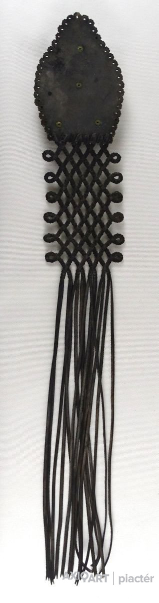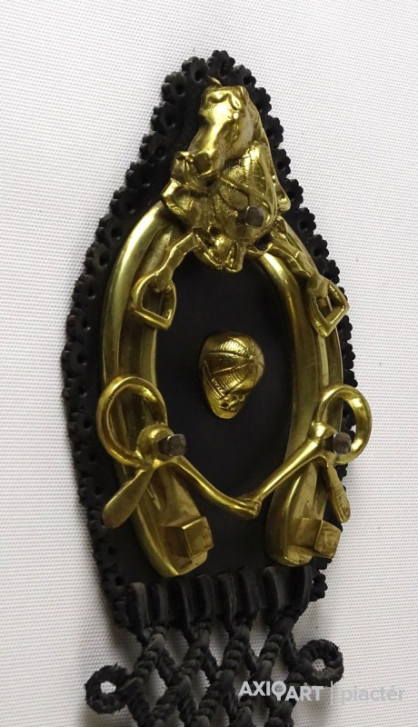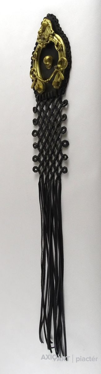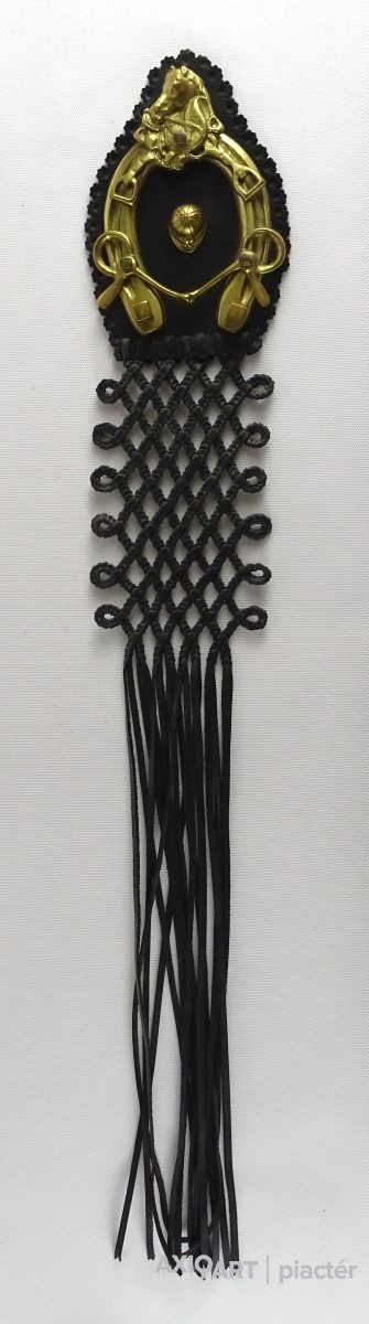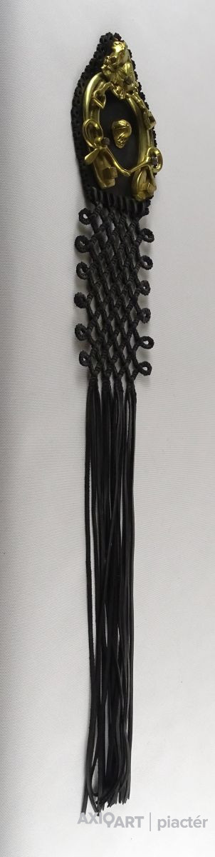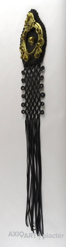 Nagy méretű fonatos fekete színű fonatos bőrdíszmű falra akasztási lehetőséggel. Rajta patkó alakú réz díszítés lófejjel és kobakkal.
