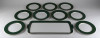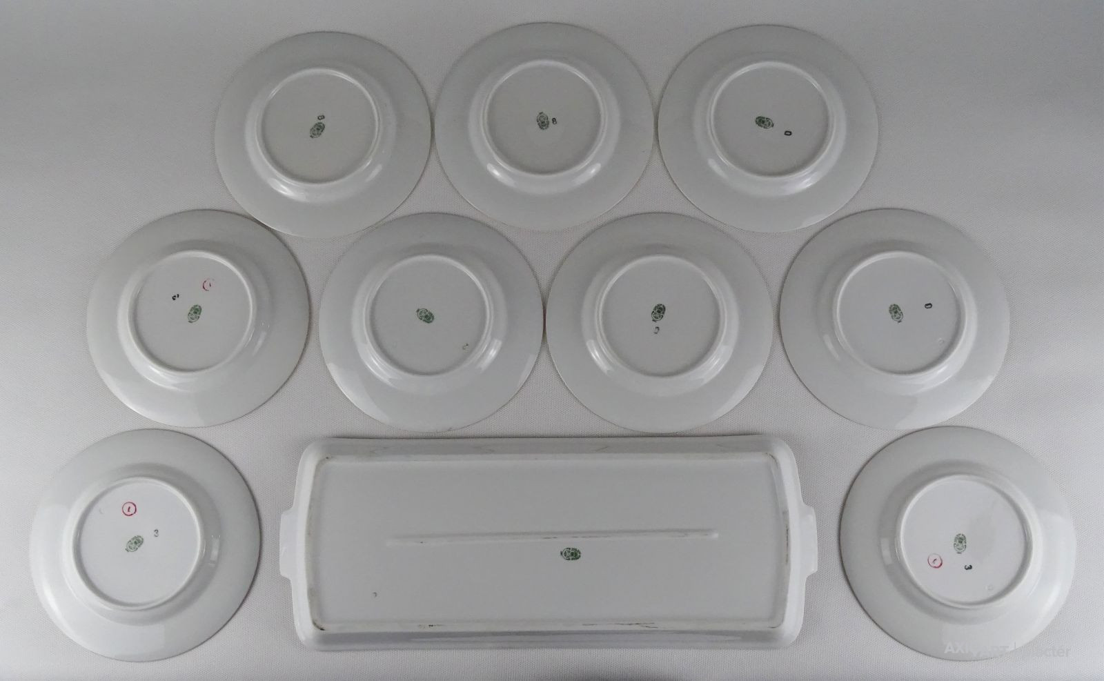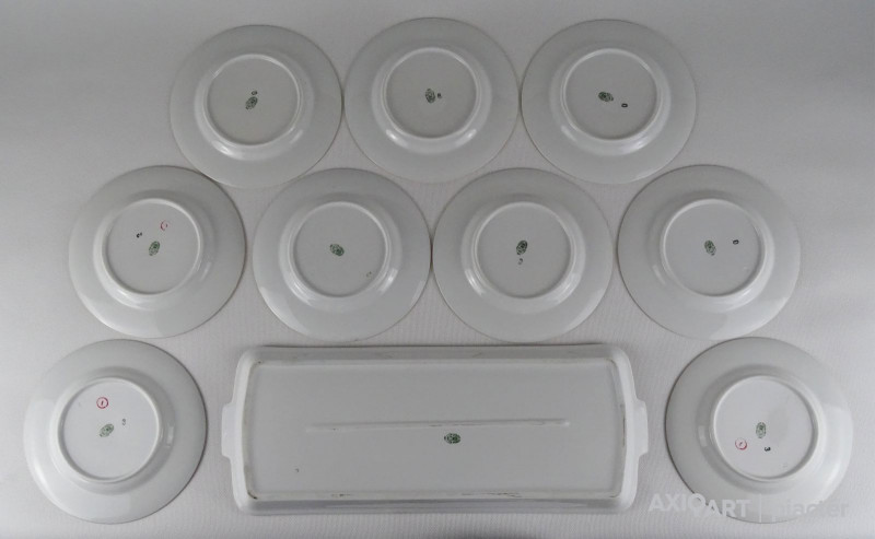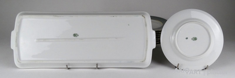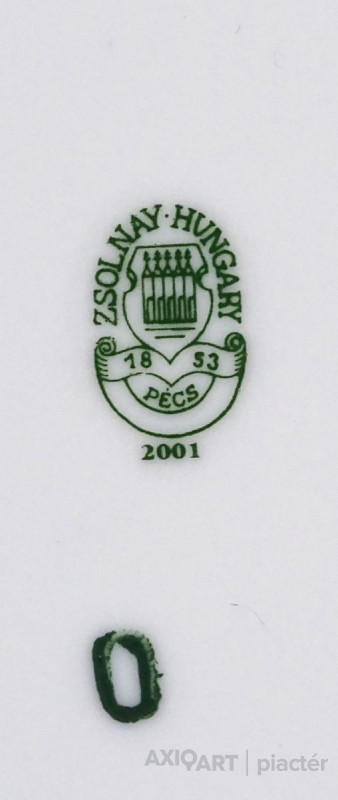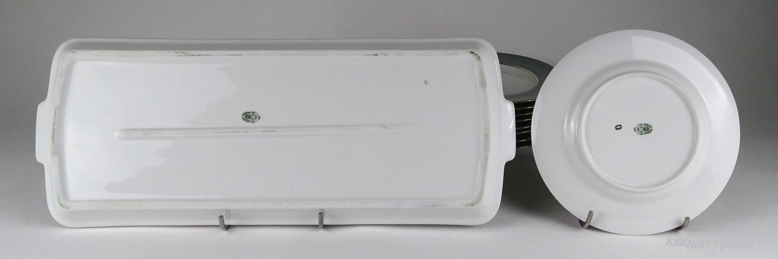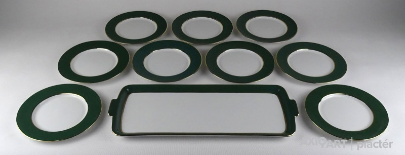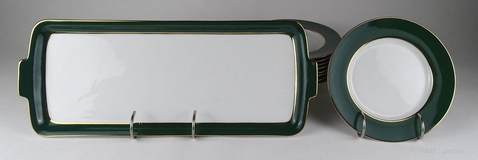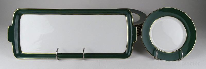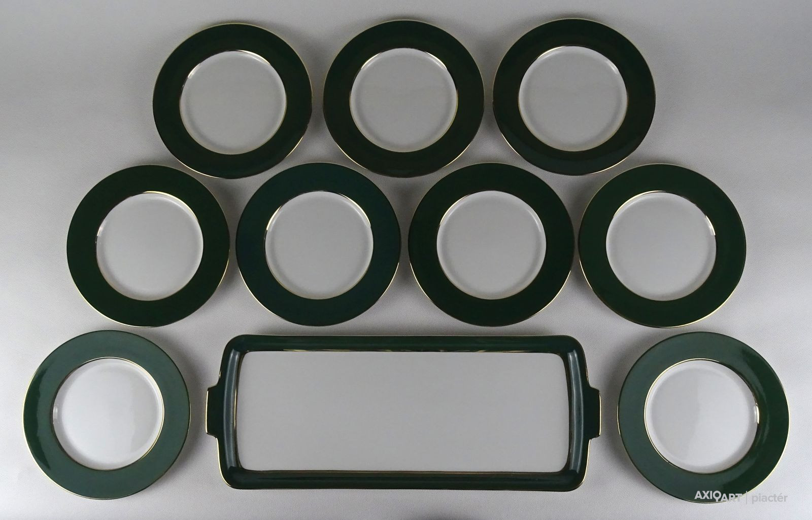 [1R089/Z041] Hibátlan állapotú Zsolnay porcelán süteményes készlet, zöld szegéllyel és arany díszítéssel. Alján Zsolnay öttornyú márkajelzés: ZSOLNAY HUNGARY PÉCS 1853 A készlet darabjai: - 1 darab nagy méretű süteményes tál (15.7 x 40.5 cm) - 9 darab süteményes tányér (17.5 cm) Súly: 2.88 kg