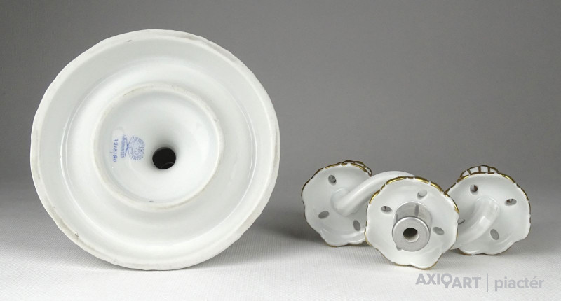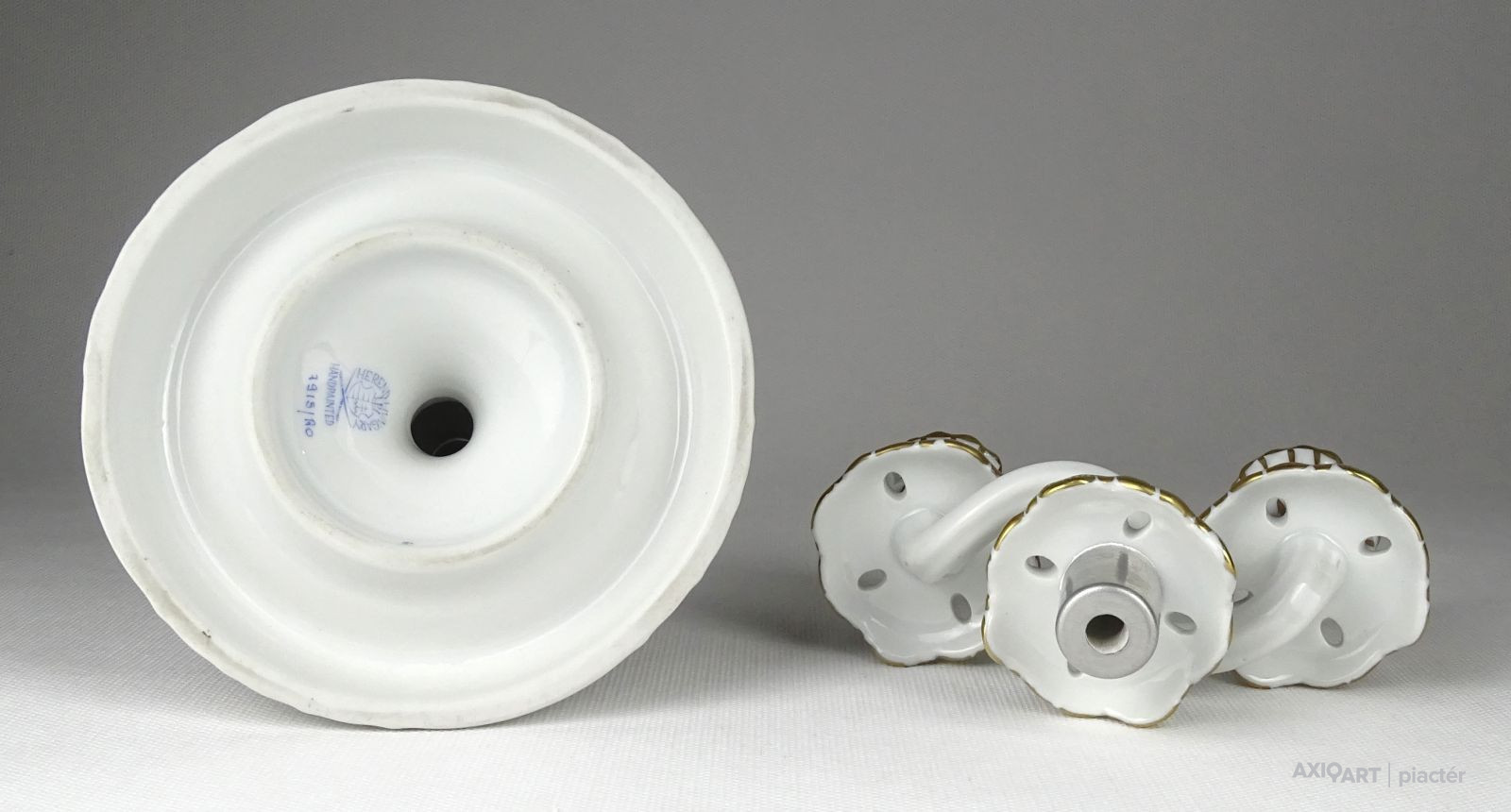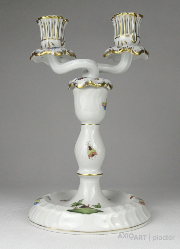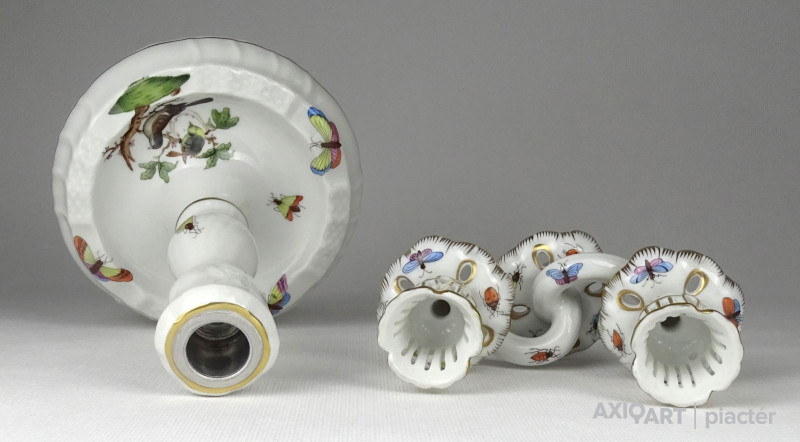 [1Q690/BX-8] Hibátlan állapotú, talpas kézi festésű Rothschild mintával díszített Herendi porcelán gyertyatartó. Egyes és kettes pozícióban is használható. Aranyozása is kopásmentes, ajándékozható állapotban van. Alján kék Herendi jelzés: HEREND HUNGARY HANDPAINTED Mélynyomással: HEREND Formaszám: 7915/RO Magasság: 22 cm Szélesség: 13.3 cm Súly: 0.52 kg