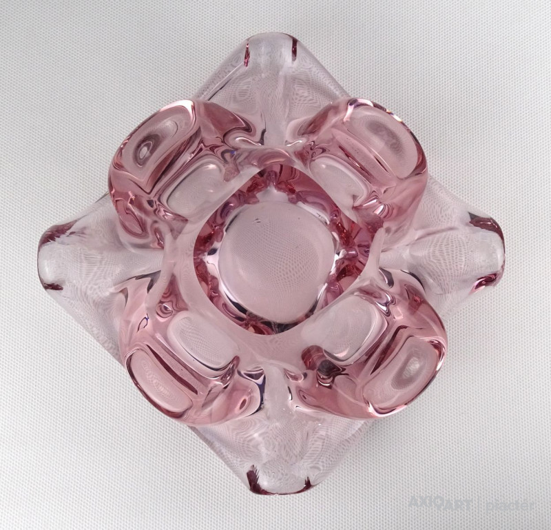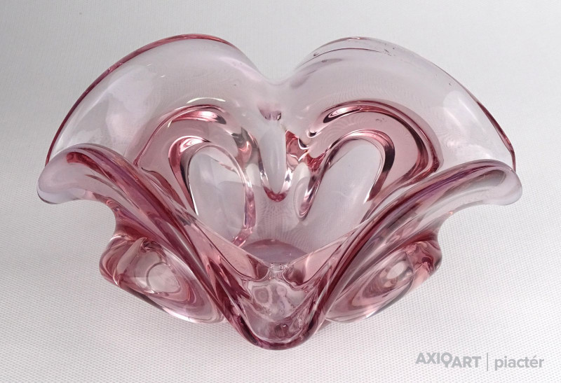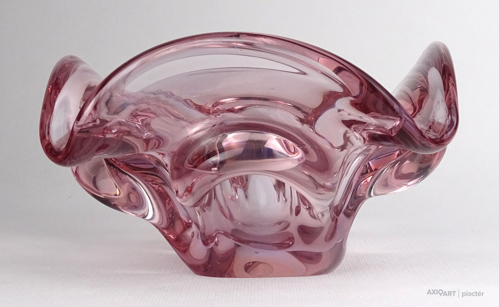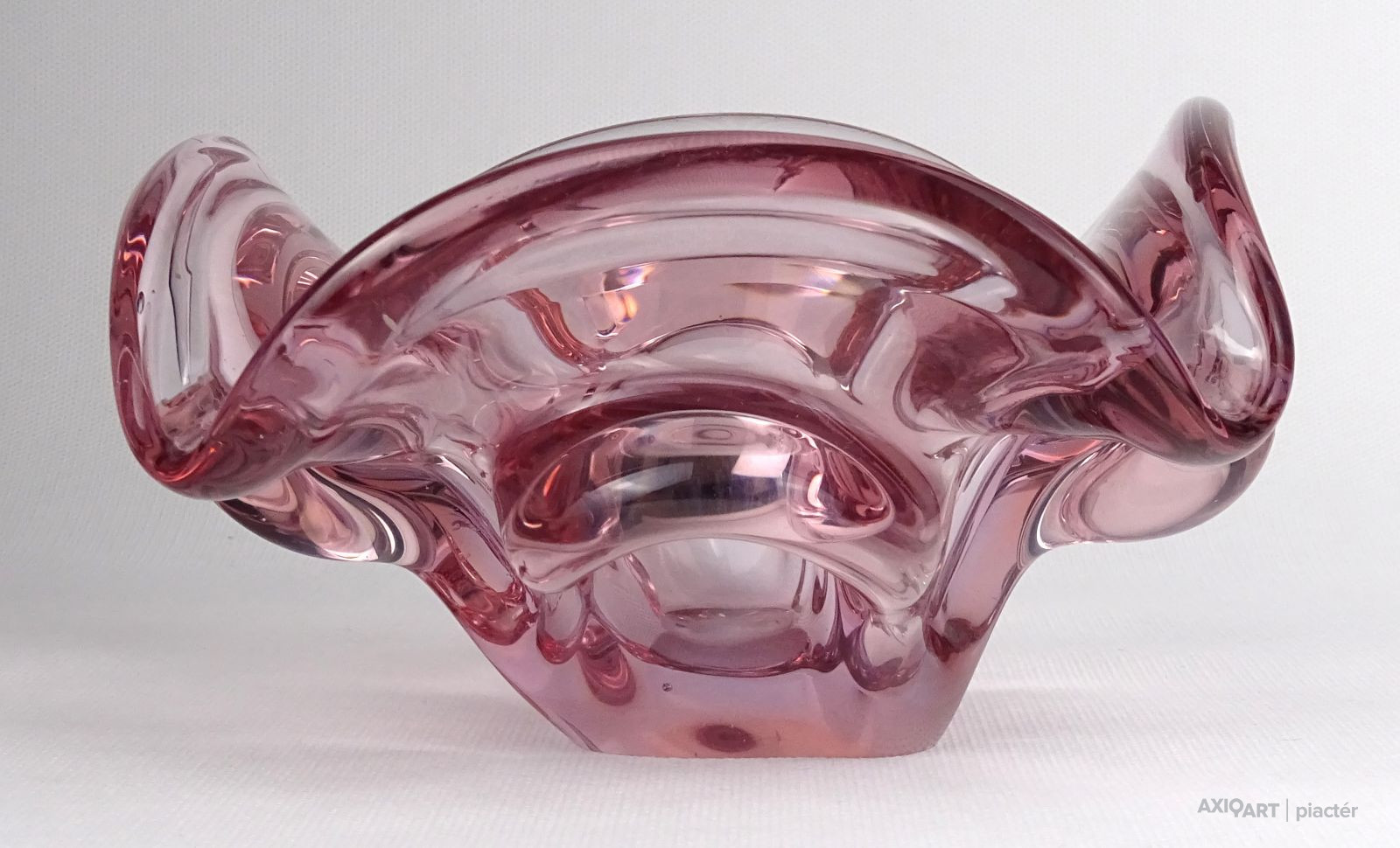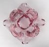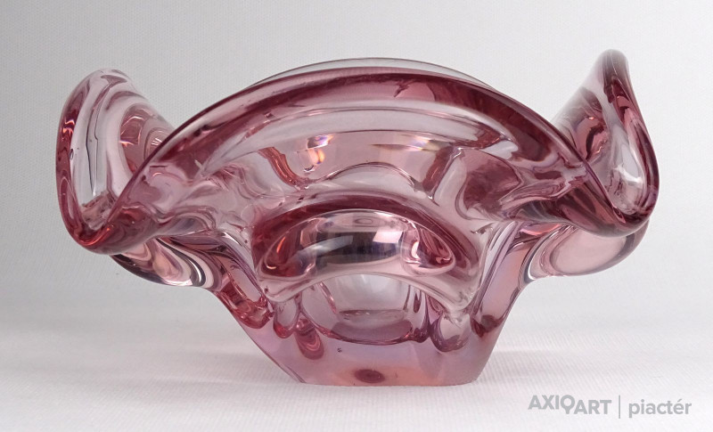 Hibátlan állapotú, vastag falú, fodros szélű, színezett, halvány rózsaszín művészi üveg, cseh fújt üveg hamutál a XX. század második feléből.