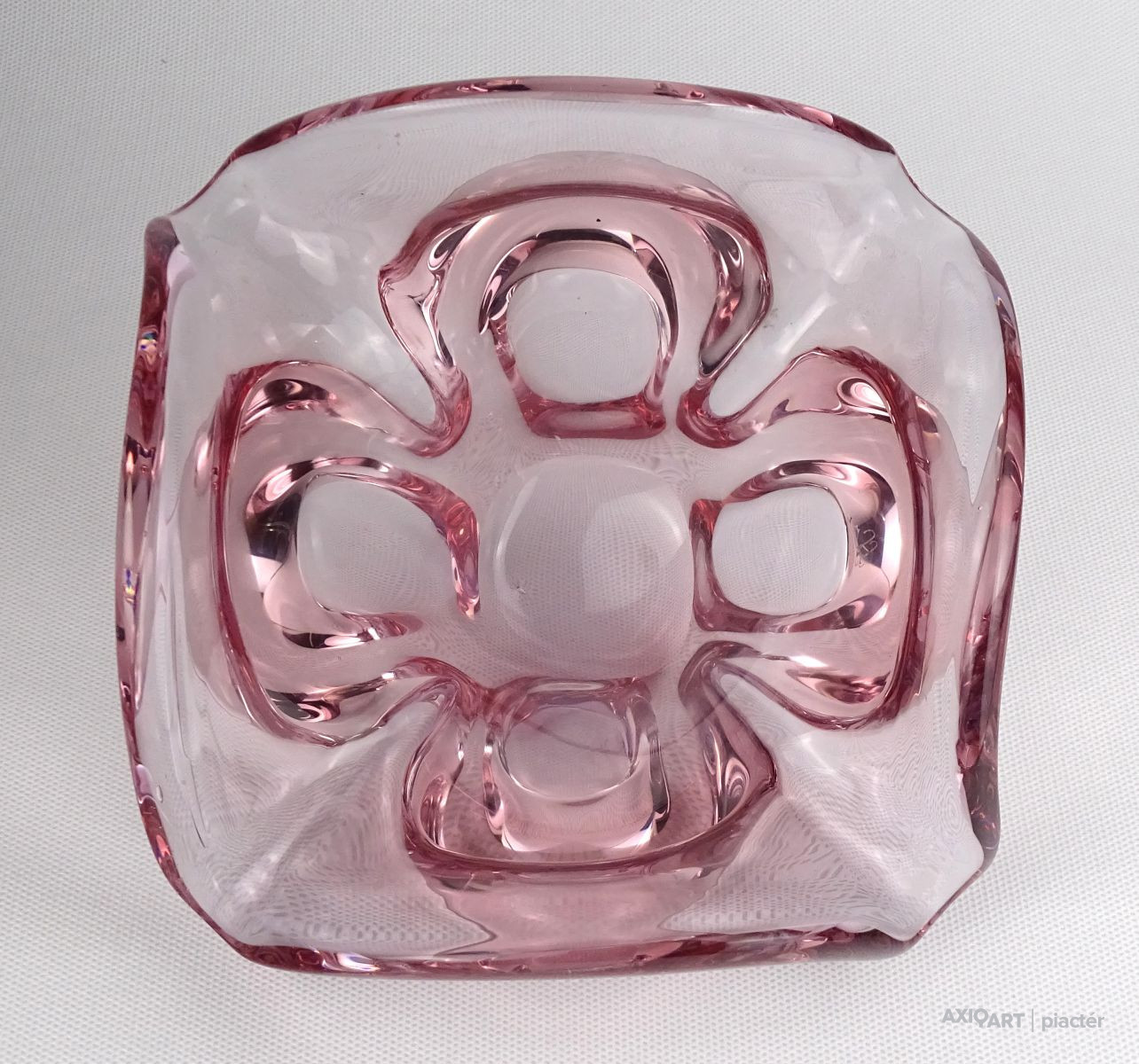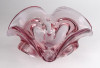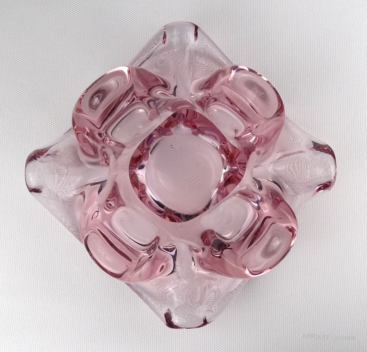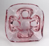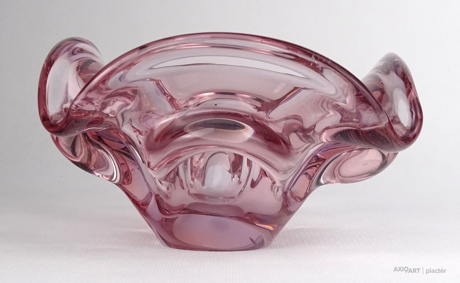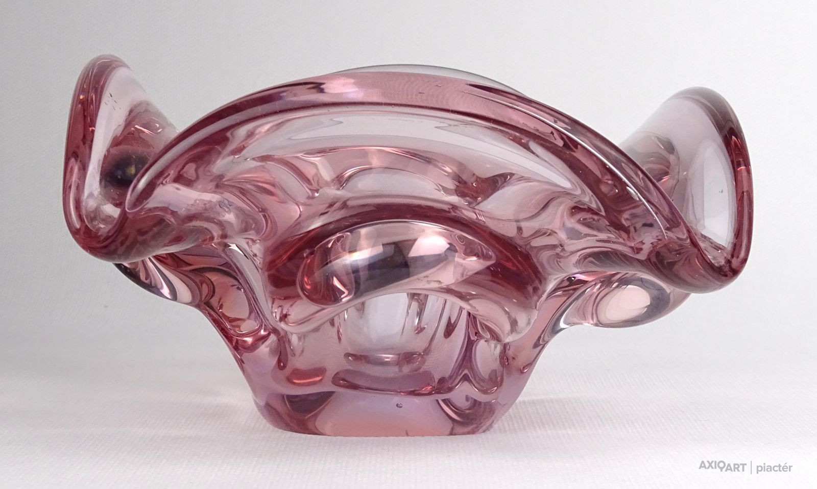 Hibátlan állapotú, vastag falú, fodros szélű, színezett, halvány rózsaszín művészi üveg, cseh fújt üveg hamutál a XX. század második feléből.