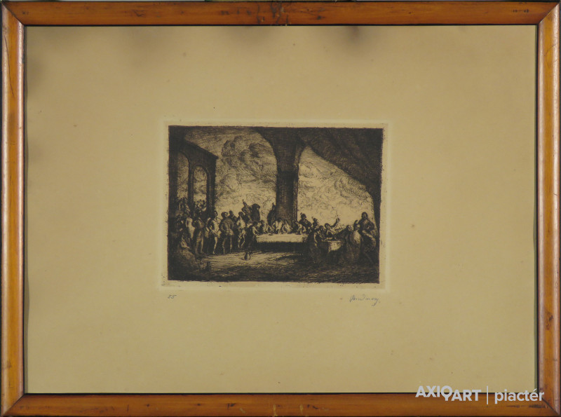 [FK1342/033] A kép mérete: 8 x 6 cm keret nélkül. Készült: Rézkarc, Papír A kép Szabó Vladimír (Balassagyarmat, 1905, Budapest, 1991) alkotása. Jelezve Jobbra lent "Szabó Vladimír (ceruzával)" A festmény jó állapotban van. Keret: Új Magyar festők és grafikusok életrajzi lexikona I-II. Festő, grafikus. 1927-től a budapesti Képzőművészeti Főiskolán folytatott tanulmányokat, ahol 1930-ig Rudnay Gyula, Vaszary János és Csók István, 1935-37 között pedig Benkhard Ágost növendéke volt. 1931-34-ben római ösztöndíjas volt. 1959-61 között Franciaországban dolgozott. 1930-tól szerepelt országos festészeti és grafikai tárlaton, külföldi kiállításokon. Egyéni bemutatók: Nemzeti Szalon, 1934, 1942; Csók Galéria, Műcsarnok, Vigadó Galéria, Csontváry Terem, Debrecen, Vác, Sárospatak, Balassagyarmat, Szeged, Kőszeg, Győr, Miskolc, Szirák, Veszprém, Tata, Simontornya, Sopron, Róma, Brüsszel, Amszterdam, Párizs, stb. Vegyes kiállítások: Műcsarnok, Magyar Nemzeti Galéria, Petőfi Irodalmi Múzeum, Debrecen, Miskolc, Székesfehérvár, Salgótarján, stb. Számos díjjal, kitüntetéssel, ösztöndíjjal jutalmazták művészi munkásságát. 1935-ben elnyerte a Szinyei Társaság grafikai díját, 1972-ben pedig az Egri Akvarell Biennálén és a Dózsa-emlékkiállításon, 1976-ban pedig a Magyar Nemzeti Galéria Zichy emléktárlatán díjazták, 1953-ban és 1957-ben Munkácsy-díjat, 1974-ben Érdemes Művész, 1980-ban Kiváló Művész címet kapott. Életművének nagyobbik részét grafikák, kisebbik hányadát festmények alkotják. Aprólékos rajzosság, bővérű mesélőkedv, szárnyaló fantázia jellemzi grafikáit, és ugyanez az erénye olajképeinek is. Kiválnak történelmi jellegű munkái, a magyar történelmi múlt nagy alakjai és sorsdöntő eseményeit megelevenítő sokfigurás alkotásai. Visszarévülései olykor a középkori haláltánc, valamint a karneváli témák bizarr kettősségével jelentkeznek munkáiban, és megteremtik művészetének egyik sajátos vonását, a groteszket. Dinamikus, olykor humoros, naiv részletekkel eleven ábrázolásmódja a folklórral rokon. Festészete tematikus, az avantgárd irányzatoktól függetlenül bontakozik ki; Gulácsy Lajos és Csontváry művészetének szellemi örököse, látásmódjuk eredeti hangú megújítója. A századforduló szecessziós művészetét naiv realista, szürrealista jegyekkel elegyítette, színélménye pedig posztimpresszionista. Műveit őrzi a Magyar Nemzeti Galéria, a Szépművészeti Múzeum, a debreceni Déri Múzeum, a Miskolci Galéria, a pécsi Janus Pannonius Múzeum és római Modern Képtár. (MÉ, ML, A.L.: Műgyűjtő-1969/1, Sz.Á.: Műv. 1974/4, K.N.Z.: Műv. 1976/3, P.M.: Műv. 1986/3) Magyar festők és grafikusok életrajzi lexikona I-II. Műgyűjtők és kereskedők kézikönyve Festő, grafikus. A bp.-i Képzőművészeti Főiskolán Rudnay Gyula, Csók István, Vaszary János, Benkhard Ágost voltak a mesterei. 1931-1934-ben római-ösztöndíjas volt. 1959-ben és 1960-ban tanulmányúton járt Franciaországban. 1930-tól szerepelt hazai és külföldi kiállításokon. 1935-ben elnyerte a Szinyei Társaság grafika-díját. 1972-ben az Egri Akri Akvarell Biennálén és a Dózsa-emlékkiállításon, 1976-ban pedig a Magyar Nemzeti Galéria Zichy emlékkiállításán díjazták műveit. 1953-ban és 1954-ben Munkácsy-díjat, 1974-ben érdemes, 1980-ban kiváló művész címet kapott. Aprólékos rajzosság, bővérű mesélőkedve, szárnyaló fantáziája jellemzi grafikáit, s ugyanez az erénye olajfestményeinek is. Kiválnak történelmi jellegű alkotásai, a magyar történelmi múlt nagy alakjai és sorsdöntő eseményeit megelevenítő sokfigurás alkotásai. Visszarévülései olykor a középkori haláltánc és a karneváli témák bizarr kettősségével jelentkeznek műveiben és megteremtik művészetének egyik sajátos vonását, a groteszket. Dinamikus, olykor humoros és naiv részletekkel eleven ábrázolásmódja a folklórral rokon. (MÉ, ML, P.M.: Műv.-1986/3) Magyar festők és grafikusok adattára 1924-1926 között Rudnay Gyula, Csók István és Vaszary János, 1935-1937-ben Benkhard Ágost növendéke a Képzőművészeti Főiskolán. 1931-1934-ben római-ösztöndíjas. 1959-1960-ban nagyobb tanulmányutat tesz Franciaországban. 1930 óta kiállító művész; egyéni kiállítása 1934-ben, 1942-ben és 1943-ban a Nemzeti Szalonban, 1969-ben Szegeden, 1973-ban a Csók Galériában és Balassagyarmaton, 1974-ben Hollandiában, 1975-ben Debrecenben volt. Alkotásai a külföldi magyar kiállítások révén határainkon túl is közismert. Munkássága elismeréseként 1935-ben elnyerte a Szinyei Társaság grafikai díjat, 1972-ben az Egri Akvarell-biennálén és a Dózsa emlékkiállításon, 1976-ban a Nemzeti Galériában a Zichy emlékkiállításán díjazták műveit. 1953-ban és 1954-ben Munkácsy-díjat, 1974-ben érdemes, 1980-ban kiváló művészi címet kapott. Aprólékos rajzosság, bővérű mesélőkedv, szárnyaló fantázia jellemzi grafikáit, s ugyanez az erénye festményeinek is. Kiválnak közülük történeti témájú képei, a magyar múlt nagy alakjait és sorsdöntő eseményeit megelevenítő sokfigurás alkotásait, amelyek közül több reprodukció terjedt el. Visszarévülései olykor a középkori haláltánc és a karneváli témák bizarr kettősségével jelentkeznek műveiben és megteremtik művészetének egyik igen sajátságos vonását, a groteszket. Stílusának nagy erénye az emberi és természeti világ egységének megjelenítése - nemegyszer romantikus, meseszerű keretben. Dinamikus, olykor humoros és naiv részletekkel eleven ábrázolásmódja a folklórral rokon. - Irod.: Supka Magdolna: Szabó Vladimir. Bp., 1974.; Frank János: Szabó Vladimir. Bp. 1976.; P. Sz. T.: Művész életrajzok. Bp. 1985.; Pá