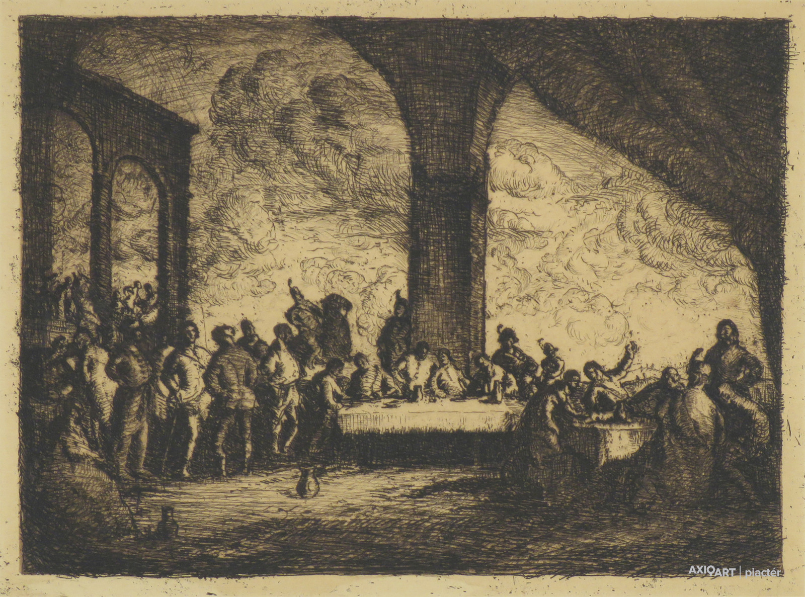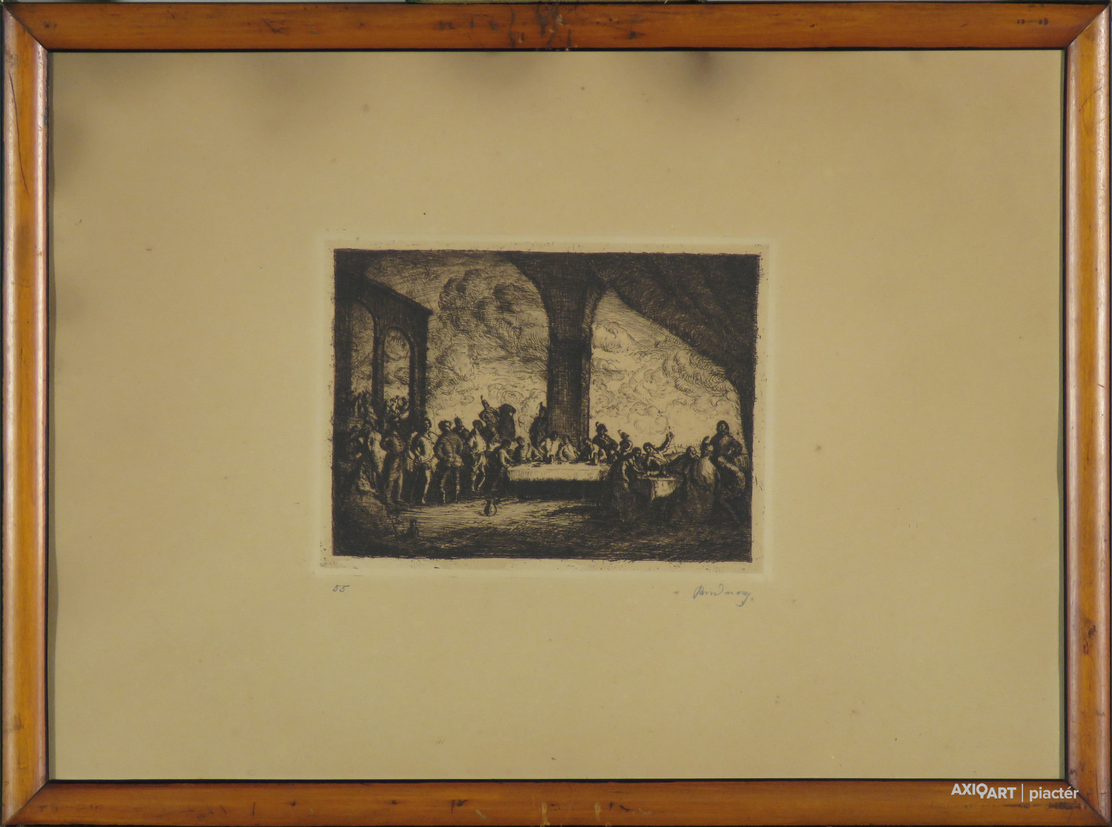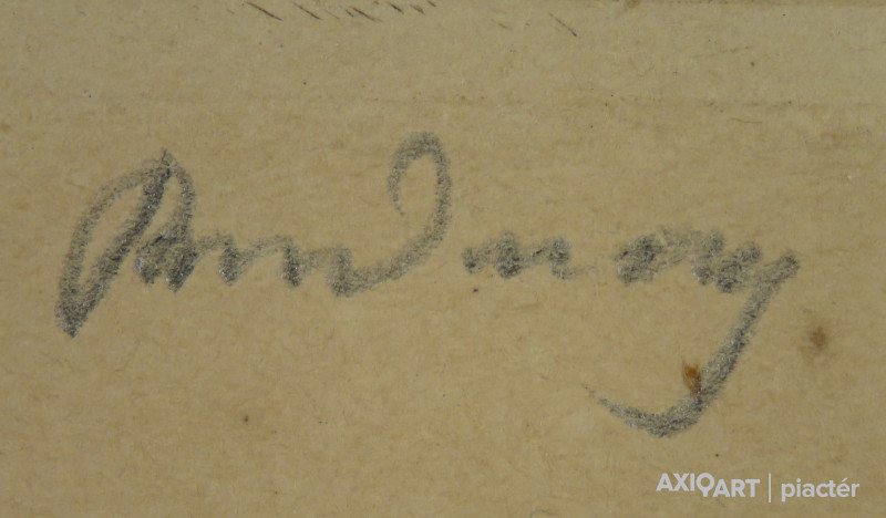 [FKC698/Bp96/52] A kép mérete: 14 x 19 cm keret nélkül. Készült: Rézkarc, Papír A kép Rudnay Gyula (Pelsőc, 1878, Budapest, 1957) alkotása. Jelezve jobbra és balra lent "55 Rudnay Gy. (ceruzával)" A festmény jó állapotban van. Keret: Ép Magyar festők és grafikusok életrajzi lexikona I-II. Festő, grafikus. 1894-ben a budapesti Iparrajziskolában, 1895-1902 között pedig Münchenben Hollósy Simonnál tanult, közben nyaranta a nagybányai festőiskolában dolgozott. 1902-ben Rómában, 1903-ban Párizsban tanult egy-egy évet. 1910-ig Hódmezővásárhelyen élt, ahol barátságot kötött az ott élő Endre Bélával, Pásztor Jánossal, Tornyai Jánossal. 1910-ben a fővárosba költözött. 1922-52 között a Képzőművészeti Főiskola tanáraként működött. 1947-ben Baján Népi Festőakadémiát szervezett. Festészetének három forrása: a magyar nemzeti romantika, Munkácsy realizmusa és a nagybányai iskola. Hódmezővásárhelyi tartózkodása alatt széles horizontú alföldi tájakat festett. Endre Bélával és Tornyai Jánossal egy jellegzetesen alföldi festői stílus kidolgozásán munkálkodtak. Második önálló tárlatán már önálló, kiforrott, egyéni stílusával jelentkezett, erőteljes, kontrasztos kolorittal, a fény-árnyék hatások erős hangsúlyozásával (Krumplihámozó, 1912; Pihenő hegedűs, 1913). Az I. Világháború alatt drámaian realista képsorozatot festett Losoncon a galíciai menekültekről (Menekülő asszony, 1917). A '20-as, '30-as években újból előtérbe került a magyar történelmi táj vagy történelmi témavilág (A pusztaszeri országgyűlés, 1926; Kuruc lovasok, 1928). 1919-től a Somogy megyei Báhony faluban számos tájképet készített. 1922- től foglalkozott rézkarccal is, melyek témája többnyire táj vagy történelmi jelenet. Számos lapját akvarellel, kézzel kiszínezte. Kitűnő, bensőséges, oldottan lírai arcképeket is festett. 1945 után lényegében korábbi stílusában dolgozott. Rudnay lírájának ereje, hatásának közvetlensége révén utóbb legkiválóbb mestereink egyikének ismerték el. Első egyéni kiállítását Párizsban rendezte, de első nagy sikerét 1918-ban az Ernst Múzeumban rendezett kolletkív bemutatójával aratta. Önálló tárlata 1953-ban a Szépművészeti Múzeumban, 1969-ben pedig a Magyar Nemzeti Galériában volt. Itthoni sikerei után Hollandiában, Velencében, Milanóban, Zürichben, Bécsben, Brüsszelben, Londonban, majd az USA-beli Pittsburgben fogadták nagy elismeréssel. Több ízben tüntették ki (Kossuth-díj, Kiváló Művész, Pro Arte díj, a székesfőváros képzőművészeti nagy aranyérme, a Céhbeliek jubiláris aranyérme), és külföldi képtárak is vásároltak műveiből. 1926-ban fejezte be egyik legnagyobb szabású alkotását, a képviselőház számára megrendelt "Honfoglalás" című szőnyegkárpit kartonját, majd 1927-ben megfestette két hatalmas kompozícióját a debreceni egyetem számára (Csokonai diákjai körében, Magyar toborzó a '40-es években). Több műve a Magyar Nemzeti Galériában és vidéki múzeumokba került. (Éber, ML, KMML) Magyar festők és grafikusok életrajzi lexikona I-II. Műgyűjtők és kereskedők kézikönyve Festő és grafikus. Budapesten az Iparrajziskolában kezdte tanulmányait, majd Münchenben Hollósy Simonnál képezte magát, közben nyaranta a nagybányai művésztelepen dolgozott. Rómában és Párizsban fejezte be tanulmányait. Többnyire vidékre elvonulva (Gömör megye, Hódmezővásárhely, stb.) festette mély tónusú, közvetlen erejű karakteralakjait, mozgalmas tömegképeit (Menekülők, Tánc, Lakoma) és finom hangulatú, egyszerűre fogott tájképeit. Lírájának ereje, hatásának közvetlensége révén utóbb legkiválóbb mestereink egyikének ismerték el. Rézkarccal is foglalkozott. 1910-ben Budapestre költözött. Első tárlatát Párizsban rendezte, de első nagy sikerét 1918-ban az Ernst Múzeumban rendezett koll. kiállításával aratta. Ugyanott rendezett gyűjteményes kiállításokat 1919-ben, 1921-ben, 1924-ben, 1929-ben. Itthoni sikerei után Hollandiában, Velencében, Milanóban, Zürichben, Bécsben, Londonban, Brüsszelben, val. az USA-beli Pittsburgban fogadták nagy elismeréssel. Több ízben kitüntették és külföldi képtárak vásároltak műveiből. 1926-ben fejezte be egyik legnagyobb szabású alkotását a képviselőház számára megrendelt "Honfoglalás" c. szőnyegkárpit kartonját. 1927-ben megfestett két hatalmas kompozícióját a debreceni egyetem számára: "Csokonai diákjai körében" és "Magyar toborzó a 40-es években". 1934-ben megkapta a székesfőváros képzőművészeti nagy aranyérmét, és a Céhbeliek jubiláris aranyérmét. 1922-től három évtizeden át a budapesti Képzőművészeti Főiskola tanáraként tevékenykedett. 1948-ban Pro Arte kitüntetést, 1949-ben Kossuth-díjat, 1953-ban kiváló művész címet kapott. (Éber, ML) Magyar festők és grafikusok adattára Tanulmányait a budapesti iparművészeti iskolában kezdte 1894-ben, majd 1895-től közel hét évig Münchenben Hollósy Simonnál folytatta; közben nyaranta Nagybányán festett. Egy évre Rómába, majd 1903-ban Párizsba ment, ahonnan csak a következő évben tért haza. Először Gömör megyében, később Hódmezővásárhelyen élt, ahol Tornyai Jánossal került szoros barátságba. 1910-ben Budapestre költözött, első kiállítását a Párizsi Nagyáruház Lotz Termében rendezte Pásztor Jánossal közösen. Következő évben a Műcsarnokban kiállított képei (Pihenj hegedűs, 1913. MNG; Krumplihámozók, 1920. MNG.) már kiforrott stílusát mutatják. Művészetének második korszaka Losonchoz kapcsolódik, ahol az első világháború idején drámai sorozatot festett a háború áldozatairól (Menekülők, 1917. MNG; Gömöri öreg házaspár, 1917. MNG.), amelyet 1918-b