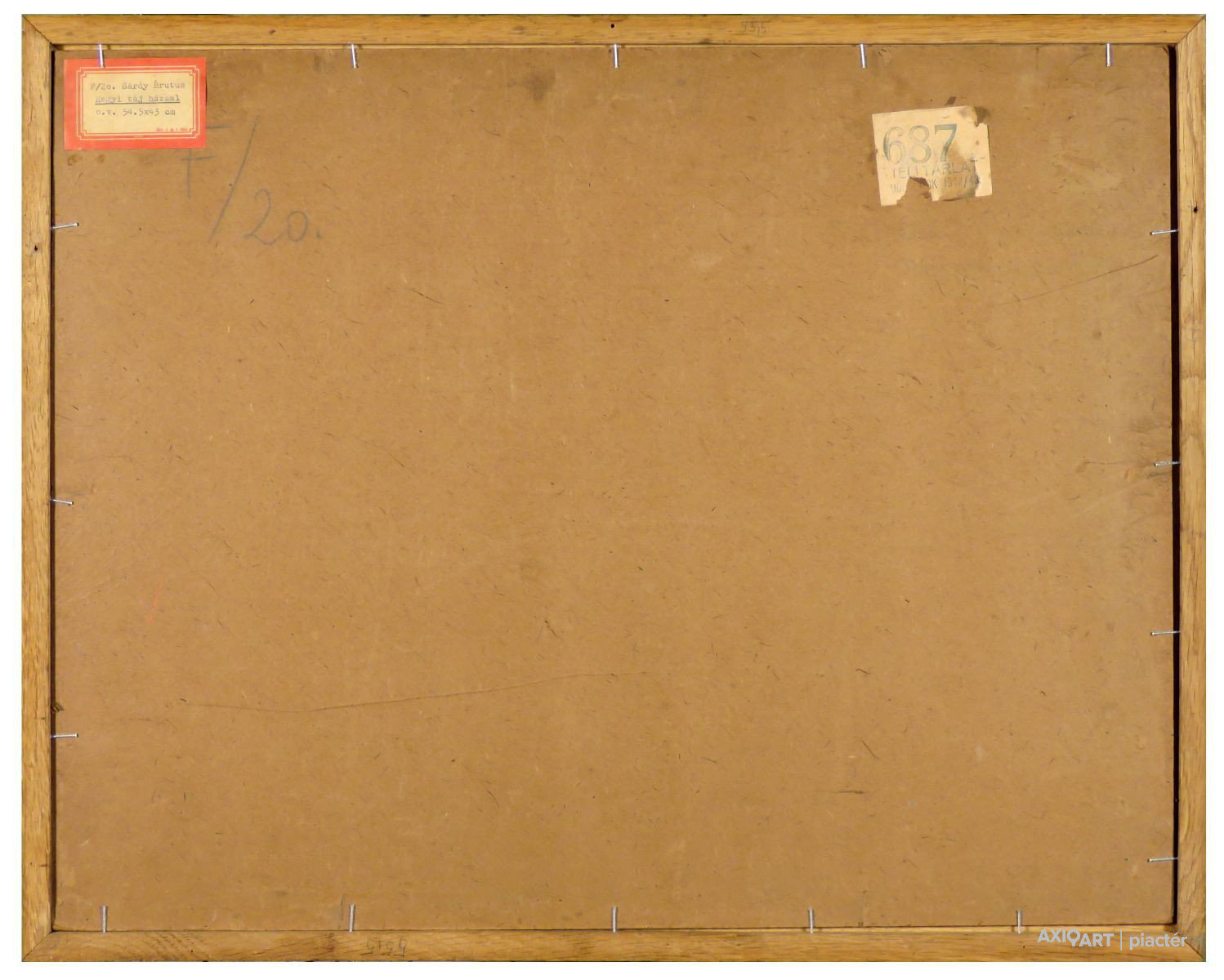 [FKB943/BX-1] A kép mérete: 43 x 55 cm keret nélkül. Készült: Olaj, Vászon (kartonon) A kép Sárdy Brutus (Perlasz, 1892, Budapest, 1970) alkotása. Jelezve Jobbra lent "Sárdy Brutus 942" A festmény jó állapotban van. Keret: Ép Ho: gépelt adatlap és az 1942-43-as műcsarnoki téli tárlat raglapja Magyar festők és grafikusok életrajzi lexikona I-II. Festő. A fővárosi Képzőművészeti Főiskolán Zemlényi Tivadar és Bosznai István voltak a tanárai. Itáliában járt tanulmányúton. 1918-tól naturalista jellegű tájképeket állított ki Budapesten a Nemzeti Szalonban és a Műcsarnokban. Sárdy Brutus számára a táj nyújtotta a legfőbb élményt. A valóság ihletésére hullámzik festményein a kalász, gomolyognak a felhők, görnyed meg képein az öreg almafa dús virágterhétől. Fái, felhői Corot-ra és Courbet-ra, Monet-ra, Picassóra vagy Renoir "Mezei út"-jára emlékeztetnek. Tömören összefogott és határozottan megkomponált, erőteljes színskálájú műveket alkotott. Több képe a Magyar Nemzeti Galériában van. A fővárosi képtár restaurátora volt. Jelentősebb művei: Ősz, Tél, Napsütés, Mocsaras táj, Virágos rét.