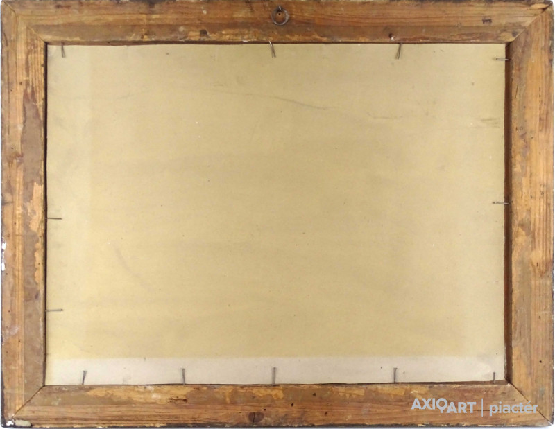 [1Z260/132] Olaj papír festmény, paszpartuzva, üveglap mögött, aranyozott keretben. A kereten néhány apró kopás látható. Jelezve jobbra lent: POLDI Magasság: 53.5 cm Szélesség: 67.5 cm Súly: 2.26 kg Böhm Lipót festő Budapest, 1916-02-28 Névváltozat: Poldi, Dávid Ferenc Szerző: Ladányi József 1941-1946: Magyar Képzőművészeti Főiskola, Szőnyi István tanítványa, majd tanársegédje volt. 1946-1948 között a római Magyar Akadémia ösztöndíjában részesült. Ebben az időben Bécsben és Olaszországban tartózkodott, Dávid Ferenc néven állított ki. Az 1960-as években Olaszországban és Franciaországban járt tanulmányúton. Főiskolás kora óta szerepeltek kiállításon alkotásai. Művészetét mindvégig a kompozíciók konstruktív, szerkesztett megformálása jellemezte. Gazdag koloritú figurális művek, portrék után a 80-as években geometrikus-absztrakt képeket festett. A táblaképek mellett monumentális kompozícók foglalkoztatták, mozaik- és freskóterveket készített. Kisplasztikákat is alkotott. Irodalom FRANK J.: ~nál, Élet és Irodalom, 1970. május 16. B. N. E.: Poldi, Élet és Irodalom, 1981. szeptember 27. Egyéni kiállítások Egyéni kiállítások 1970 • Aba Novák Terem, Szolnok 1973 • Fészek Klub, Budapest 1978 • Kisfaludi Strobl Terem, Zalaegerszeg 1991 • Csontváry Terem, Pécs Válogatott csoportos kiállítások Válogatott csoportos kiállítások 1946 • Fiatal magyar képzőművészek, Fővárosi Képtár, Budapest 1948 • Circo Ariosto, Róma • Kortárs Magyar Festészeti és Szobrászati kiállítás, Catania 1957 • Tavaszi Tárlat, Műcsarnok, Budapest 1971 • Új Művek, Műcsarnok, Budapest 1975 • Jubileumi Képzőművészeti kiállítás, Műcsarnok, Budapest 1977 • Festészet ’77, Műcsarnok, Budapest 1984 • Országos Képzőművészeti Kiállítás ’84, Műcsarnok, Budapest 1988 • Tavaszi Tárlat, Magyar Képzőművészek és Iparművészek Szövetsége, Műcsarnok, Budapest. Művek közgyűjteményekben Művek közgyűjteményekben Magyar Nemzeti Galéria, Budapest Forrás: artportal