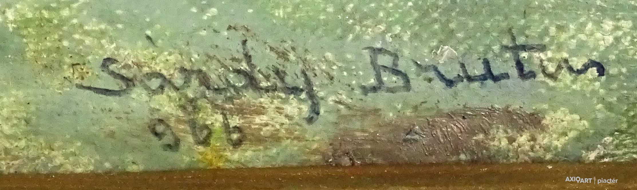 [1Z243/132] Olaj vászon festmény kartonra kasírozva, hibátlan barna - arany keretben. Datált jelzés jobbra lent: SÁRDY BRUTUS '966 Magasság: 53.5 cm Szélesség: 69 cm Súly: 1.735 kg Sárdy Brutus [bevezető szerkesztése] A Wikipédiából, a szabad enciklopédiából Sárdy Brutus Született 1892. január 20. Perlasz Meghalt 1970. szeptember 28.(78 évesen) Budapest Nemzetisége magyar Stílusa naturalista Iskolái Képzőművészeti Főiskola Mestere(i) Balló Ede Zemplényi Tivadar A Wikimédia Commons tartalmaz Sárdy Brutus témájú médiaállományokat. Sárdy Brutus (Perlasz, 1892. január 20. – Budapest, 1970. szeptember 28.) magyar festőművész és restaurátor. Sárdy Brutus emléktáblája egykori lakhelyén (Budapest III. ker., Dósa utca 17.).   Tartalomjegyzék   [elrejtés]  1Munkássága 2Főbb művei 3Irodalom 4Jegyzetek 5Források 6További információk   Munkássága[szerkesztés] 1910-ben iratkozott be a budapesti Képzőművészeti Főiskolára, mesterei Balló Ede, Bosznay István és Zemplényi Tivadar voltak.[1][2][3] 1914 és 1918 között katonaként szolgált az első világháború harcterein. 1918-tól kezdte bemutatni finom hangulatú, naturalista jellegű tájképeit a Nemzeti Szalon és a Műcsarnok kiállításain. Első gyűjteményes bemutatkozása 1930-ban volt. 1931 októberében Tél a hegyekben című festményéért a Nemzeti Szalon kitüntetését kapta. Az 1930-as években tanulmányutat tett Olaszországban.[3] 1933-tól 1953-ig a Fővárosi Képtár restaurátora. Közben számos kiállításon szerepelt képeivel, díjakkal, munkásságát több elismeréssel tüntették ki. 1951-től számos magyar kiállítás rendezésében vett részt külföldi múzeumokban (Berlin, Lipcse, Varsó, Prága, Moszkva). 1957-ben kinevezték a Magyar Nemzeti Galéria Restaurátori Osztályának vezetőjévé, mely beosztást haláláig töltötte be. 1959 tavaszán őt bízták meg a Kínai Népköztársaság megalakulásának 10. évfordulója alkalmából a Magyar forradalmi művészet címmel Pekingben, majd Sanghajban bemutatott, közel 240 festményt és grafikát felvonultató két hónapos kiállítás megrendezésével. A kínai fél felkérésére több városban az ottani képzőművészeti akadémiákon művészeti és festészettechnikai oktatást tartott.[4] Mint restaurátor és tudományos kutató, életpályájának jelentős részét múzeumi tevékenysége tette ki. Számos híres festmény helyreállításában vett részt, ő restaurálta többek között Barabás Miklós: Bittó Istvánné című arcképét, Székely Bertalan: V. László és Czillei című történelmi kompozícióját, Munkácsy Mihály: Honfoglalás című nagyméretű alkotását, Szinyei Merse Pál: Lilaruhás nőjét, valamint Lendvayné Hivatal Anikó ismeretlen festő által készített fiatalkori arcképét. Fiával, Dr. Sárdy Lóránttal együtt végezte Munkácsy Mihály rendkívül elhanyagolt állapotban lévő Ecce homojának első restaurálását 1968-ban. Folytatta önálló alkotó tevékenységét is: a 20. századi magyar „plein air” festészet élvonalbeli mesterinek egyikeként élete végéig festette világos, tiszta szerkezetű tájképeit s örökítette meg a Rómaifürdő, a Budai-hegység és a Dunakanyar természeti szépségét. Műveiből néhány a Nemzeti Galériában található.[3] 1959 decemberében önálló kiállítása volt a Műcsarnok kamaratermében (Fényes Adolf Terem). Emlékkiállítását 1975 áprilisában rendezték meg a Magyar Nemzeti Galériában. Sírja az óbudai temetőben. Budapest III. kerületében lakott.[5] Az Óbudai temetőben nyugszik, sírhelyét a Nemzeti Emlékhely és Kegyeleti Bizottság 2002-ben „A” kategóriában a magyar történelem és kultúra jelentős alakjainak sírjait magába foglaló nemzeti sírkert részévé nyilvánította.[6] Főbb művei[szerkesztés] A Magyar Nemzeti Galéria állományában fellelhető alkotásai:[7] Havas táj 1930. (MNG Ltsz.:6597) Tájkép 1931. (MNG Ltsz.:F.K.5417) A Duna télen 1933. (MNG Ltsz.:F.K.2524) Tél 1937 (MNG Ltsz.:F.K.3946) Őszi táj 1939. (MNG Ltsz.:F.K.4919) Eső előtt 1942. (MNG Ltsz.:F.K.6410) Kilátás a Péter-hegyre 1962. (MNG Ltsz.:621) www.wikipedia.hu