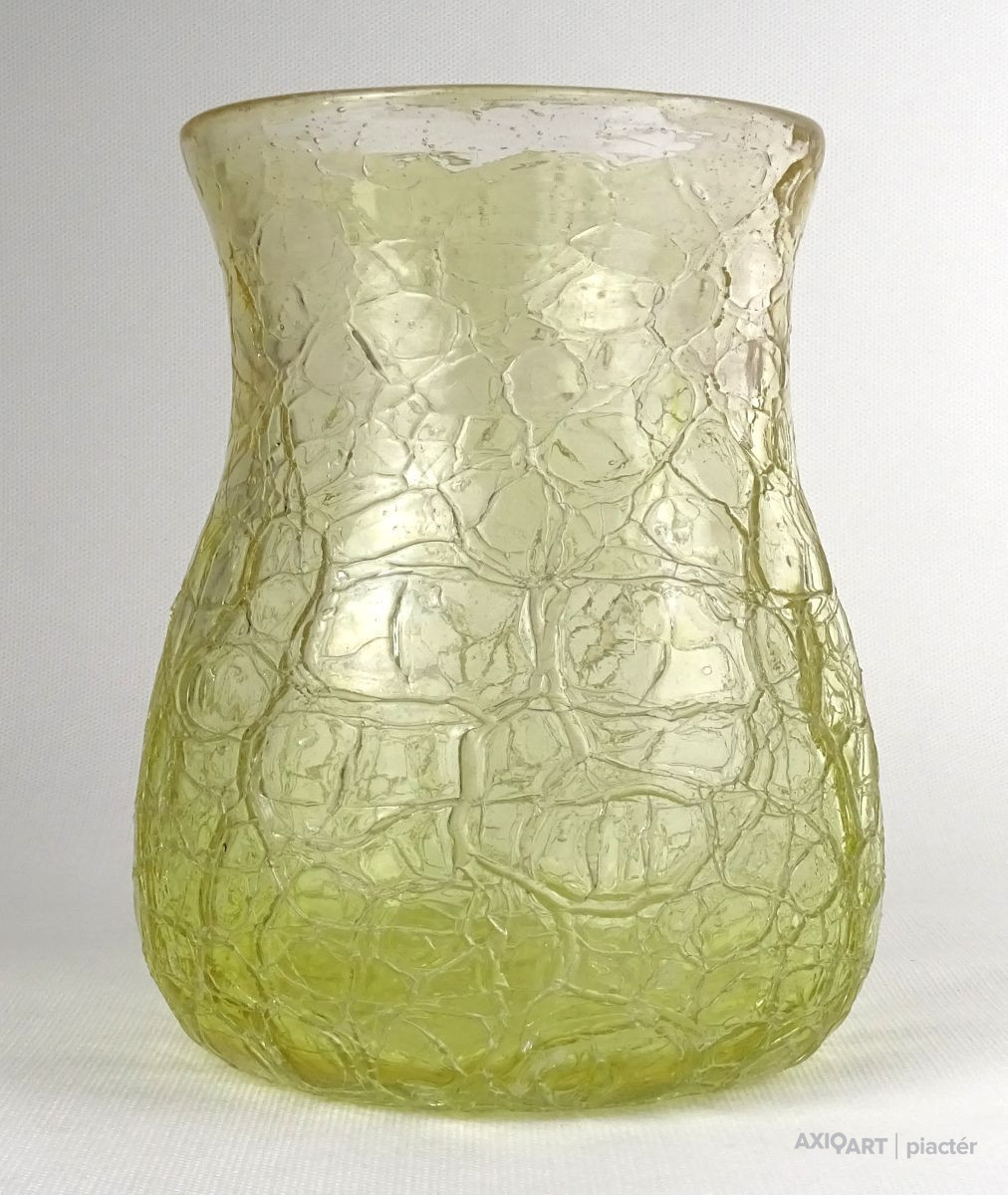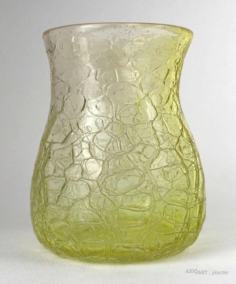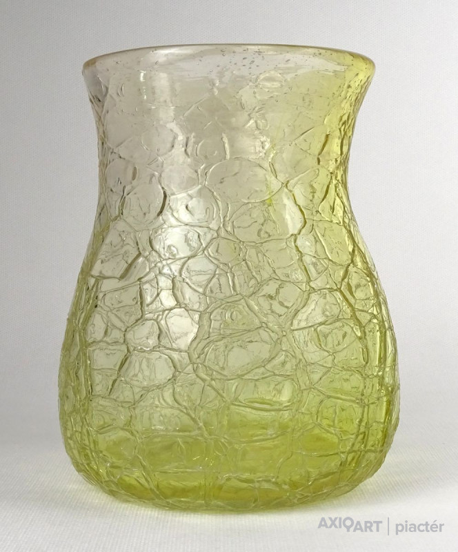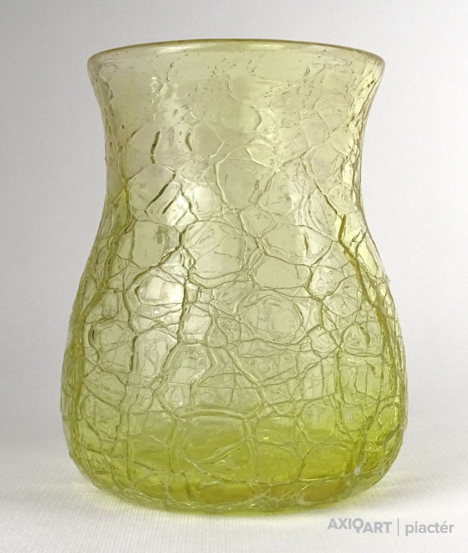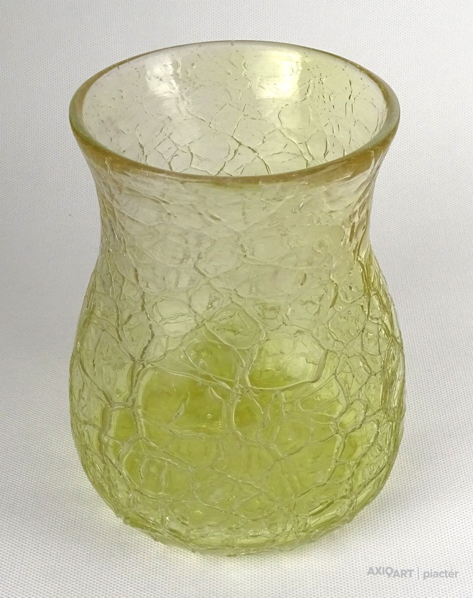 Régi, sárga színű fújt üveg váza. Felülete repesztett, erezett mintázatú. Alján a fújás, szakítás nyoma jól kivehető.